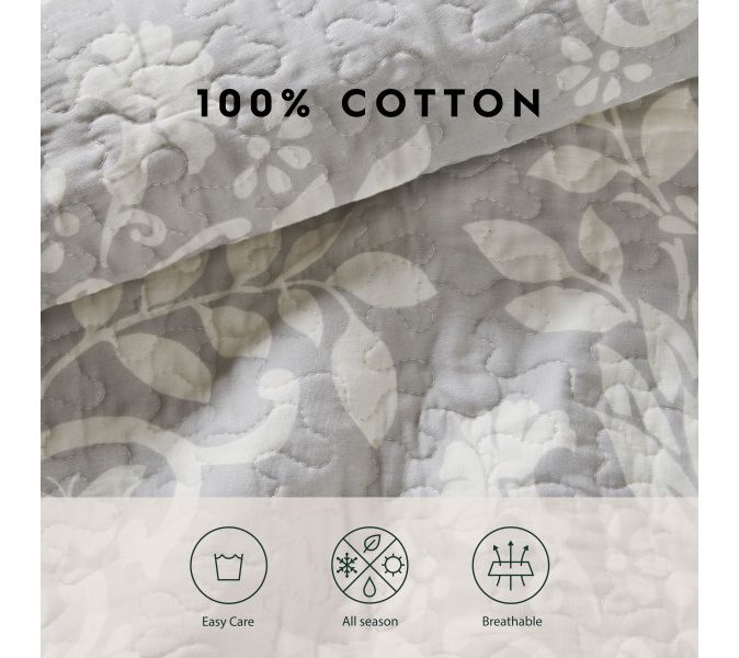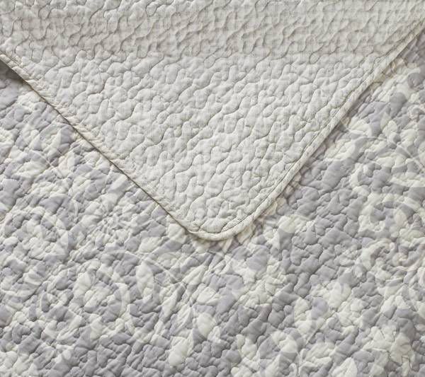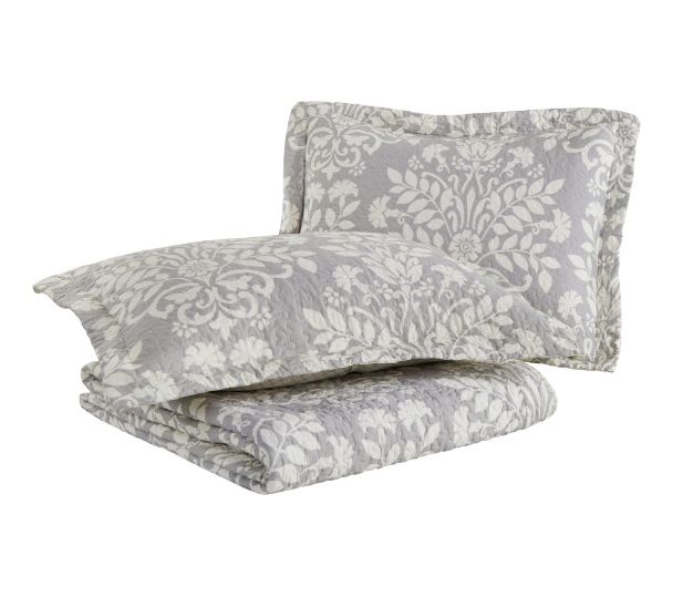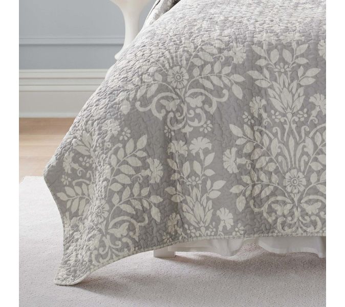 Bring a touch of timeless elegance to your bedroom with the Laura Ashley Rowland quilt and sham set. This set features a classic damask print in dove grey and ivory, paired with a geometric design on the reverse side, offering versatility and style. Prewashed for softness, this cotton quilt becomes cozier with each wash. From Laura Ashley.