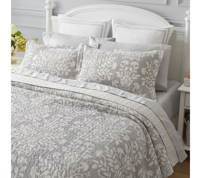 Elevate your bedroom decor with the timeless elegance of the Laura Ashley Rowland quilt and sham set. Featuring a sophisticated damask pattern in dove grey and ivory, this set is prewashed for added softness and comfort. From Laura Ashley.