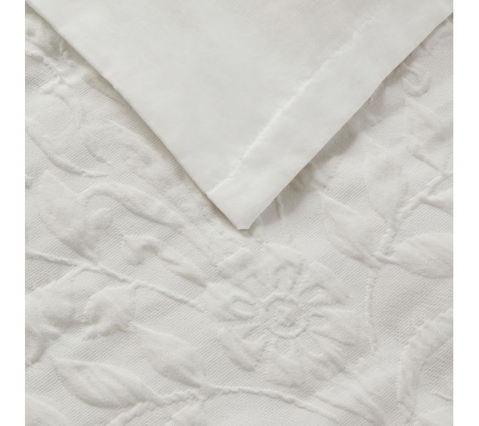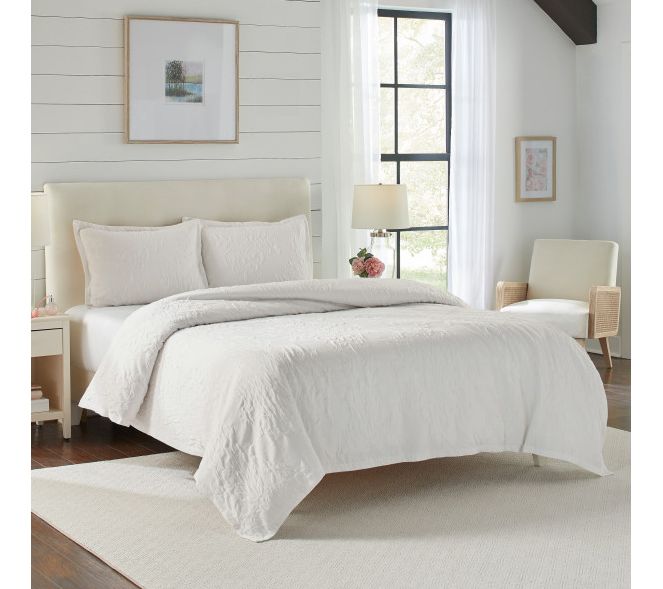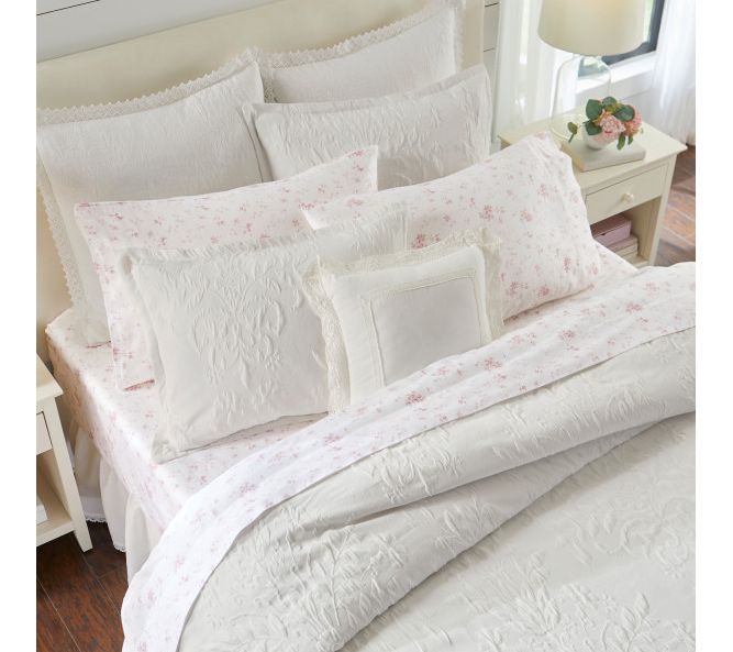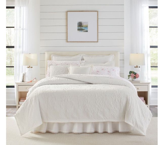 Elevate your bedroom's aesthetic with the elegant Laura Ashley Rowland king duvet cover set, featuring a timeless textured floral matelasse design that exudes sophistication. The smooth white cotton reverse adds a touch of luxury, making this set perfect for a serene and stylish sleep space. From Laura Ashley.
