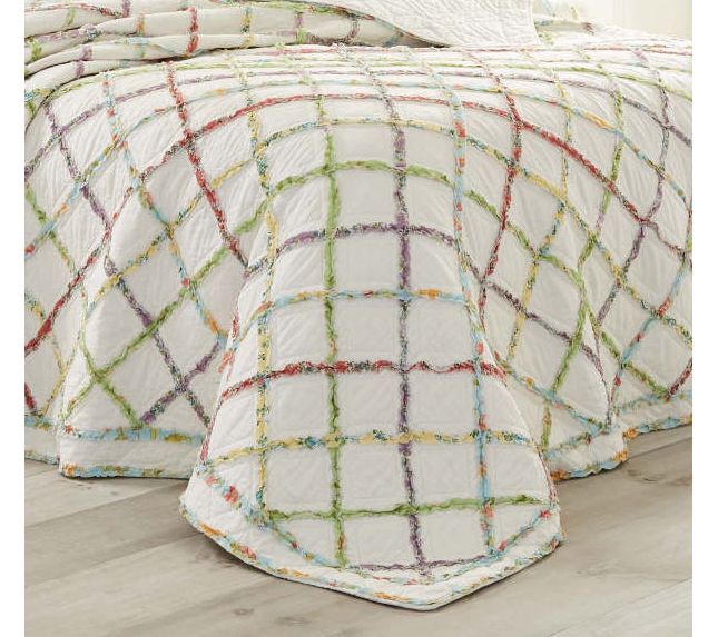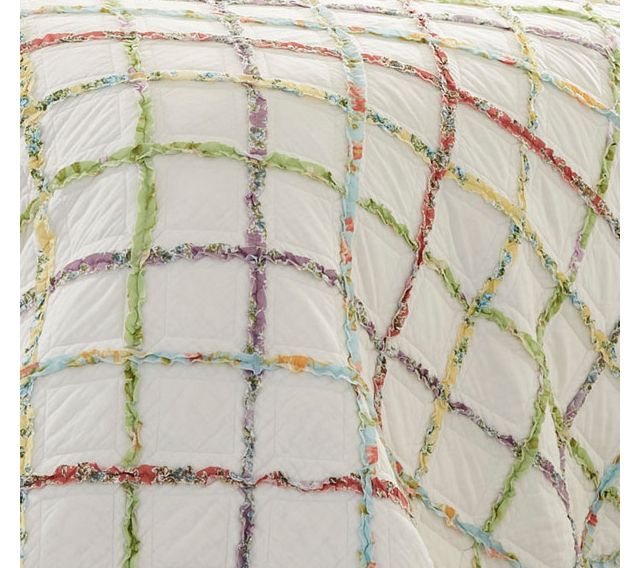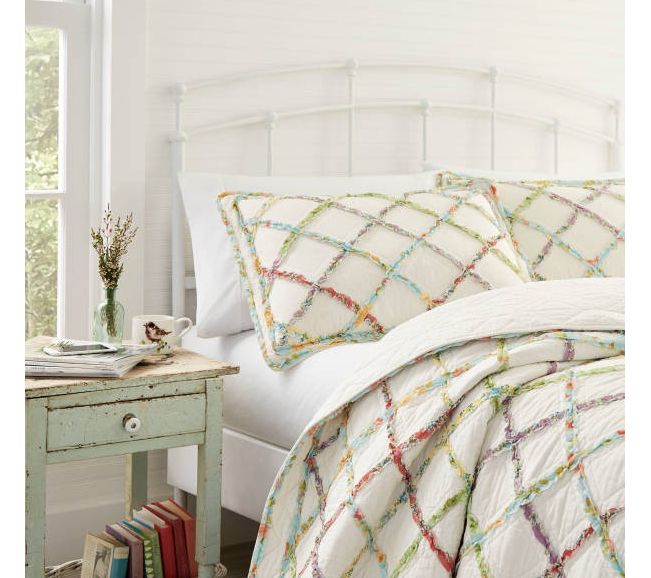 Add a fresh touch of farmhouse style to your bedroom with this ruffled garden quilt from Laura Ashley. Multicolored printed appliqued ruffles form a diamond grid across the quilt and bring a touch of summer to any bedroom. From Laura Ashley.