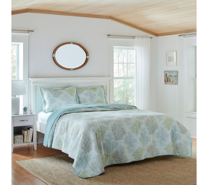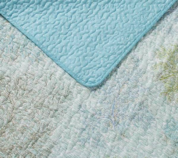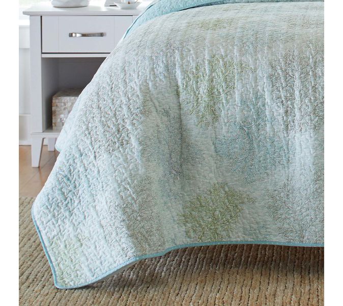 Transform your bedroom into a serene underwater oasis with the Laura Ashley Saltwater Blue king quilt-sham set. Delicate seaweed branches on a crisp white background create a tranquil vibe, while the quilt reverses to a bright turquoise with white dots for a fresh look. From Laura Ashley.