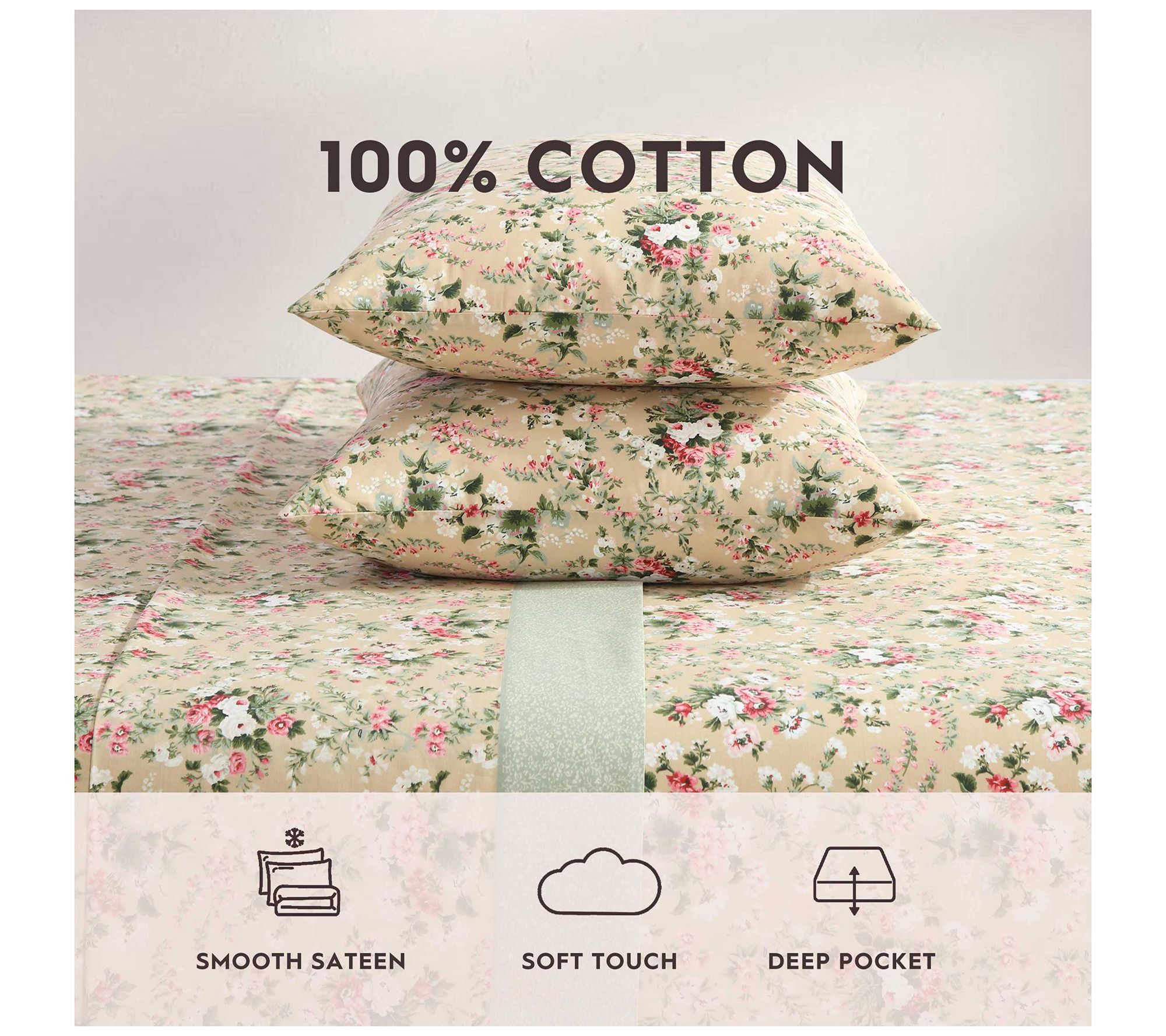 Enhance your bedroom decor with Laura Ashley's beautiful sheet set, featuring timeless floral prints and a unique printed hem. Experience the crisp and smooth texture of T200 Percale Cotton that provides lasting comfort for a relaxed night's sleep. Match with your existing bedding or pair with a new Laura Ashley comforter, duvet, or quilt set. From Laura Ashley.