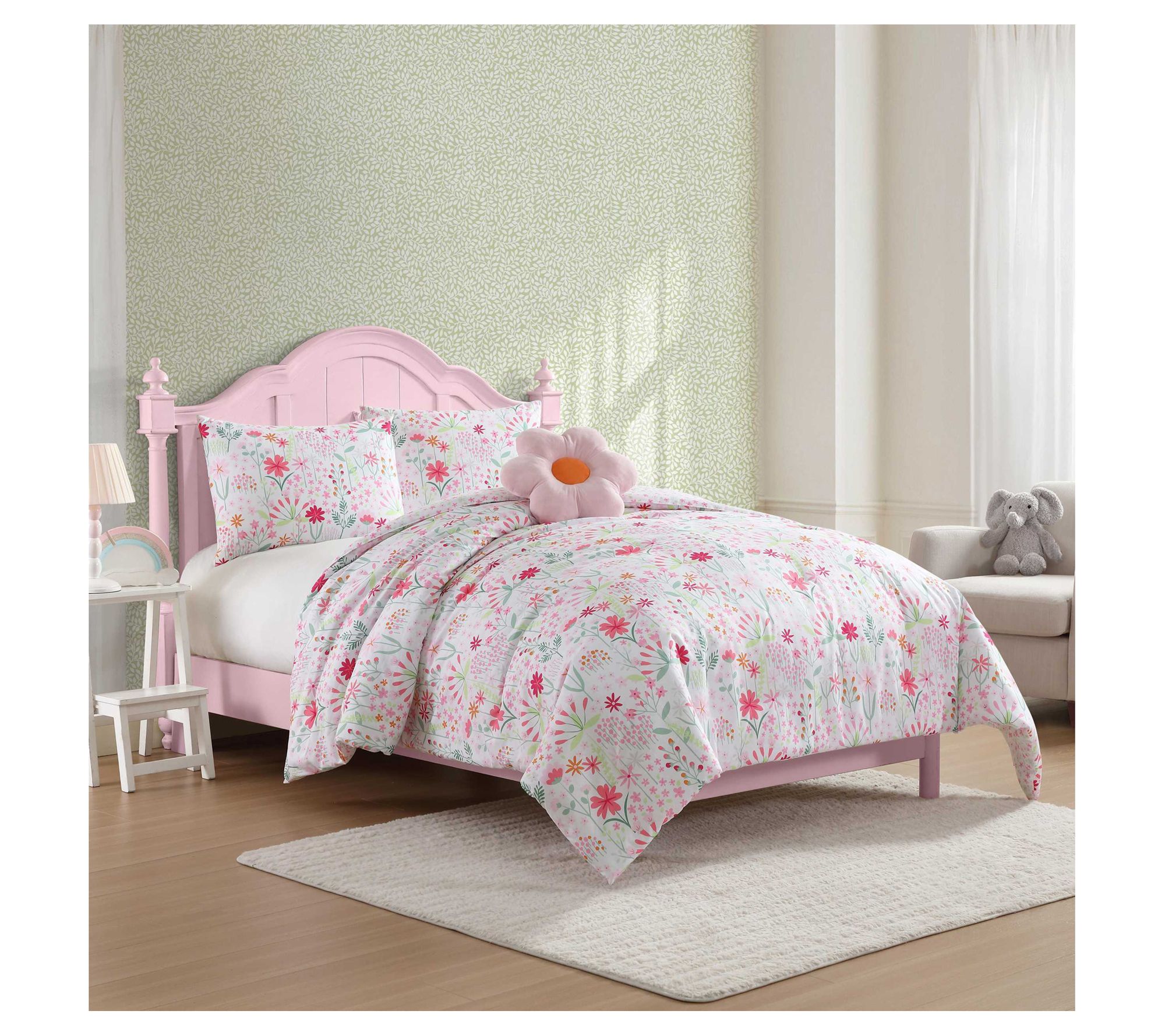 Add a burst of cheerful color to your bedroom with this bright floral comforter and sham set. Featuring lively pink and green flowers, this set is both stylish and practical, thanks to its comfortable microfiber construction. Whether you're decorating a kid's room or freshening up your own, this set is perfect for a joyful, nature-inspired look. From Laura Ashley.