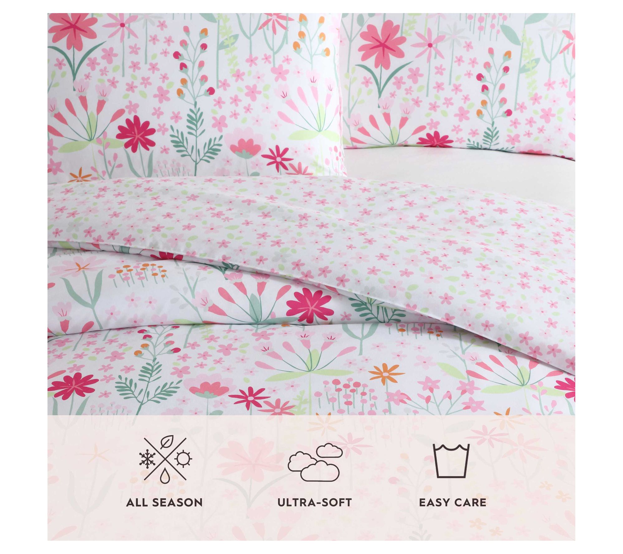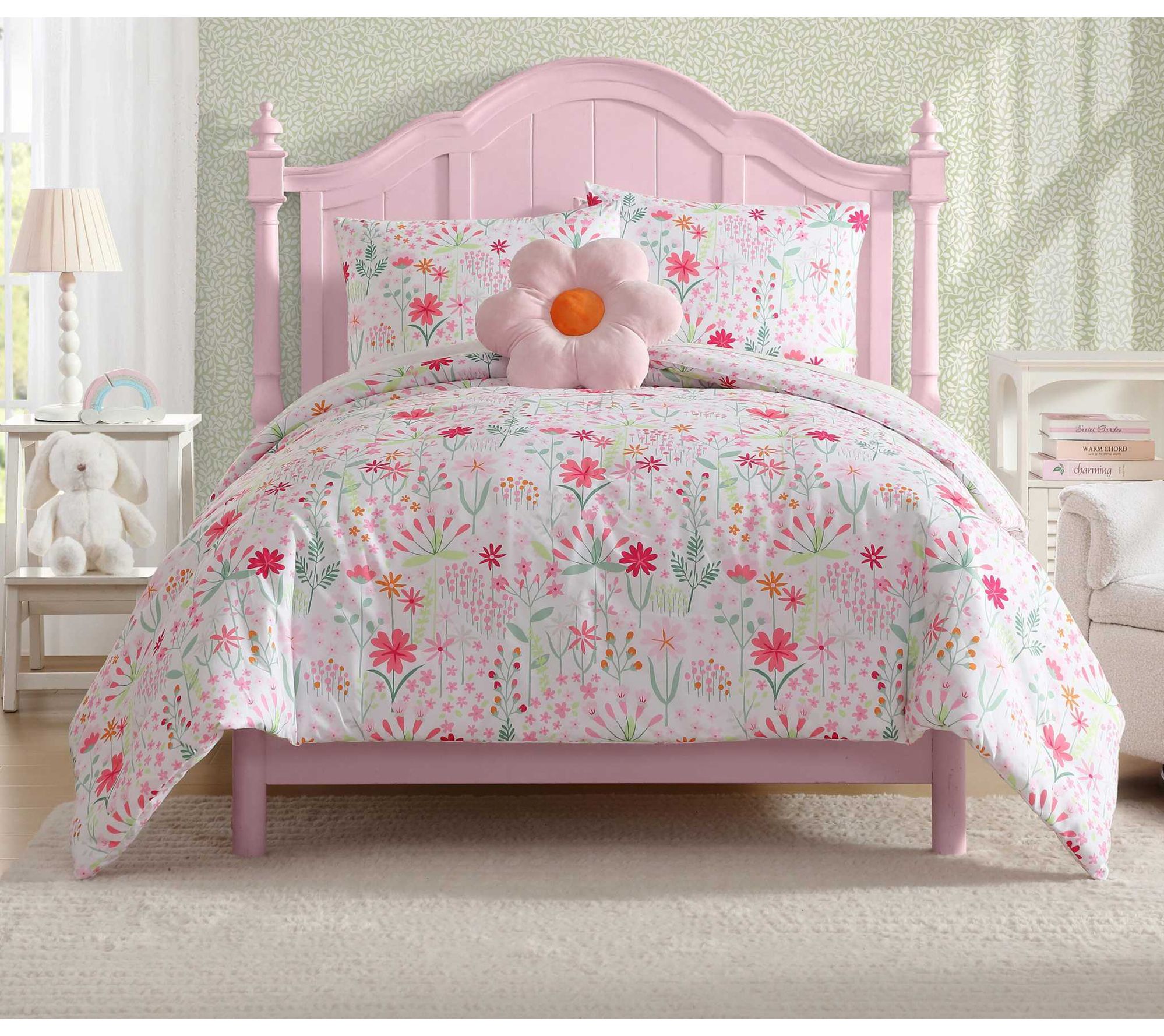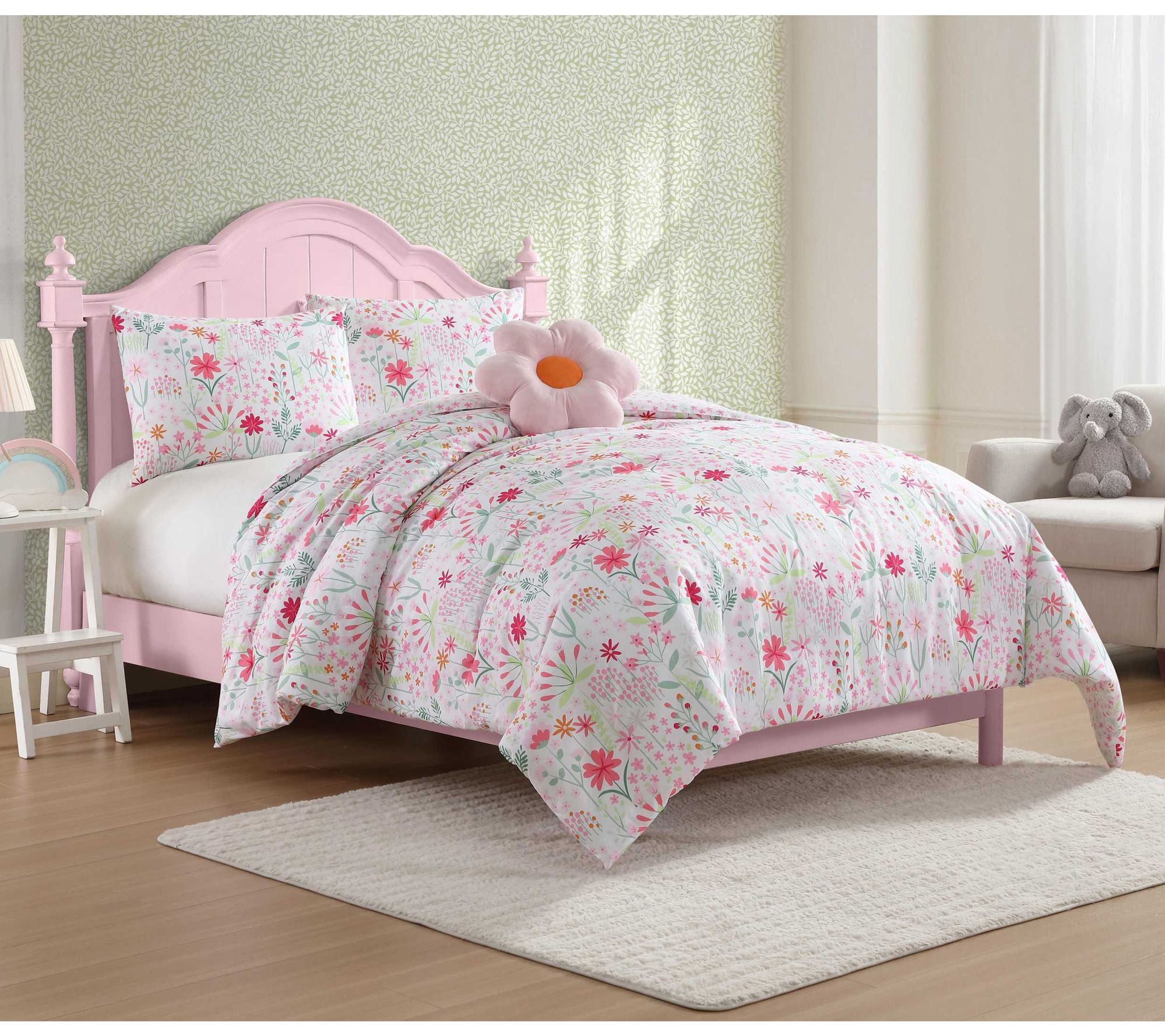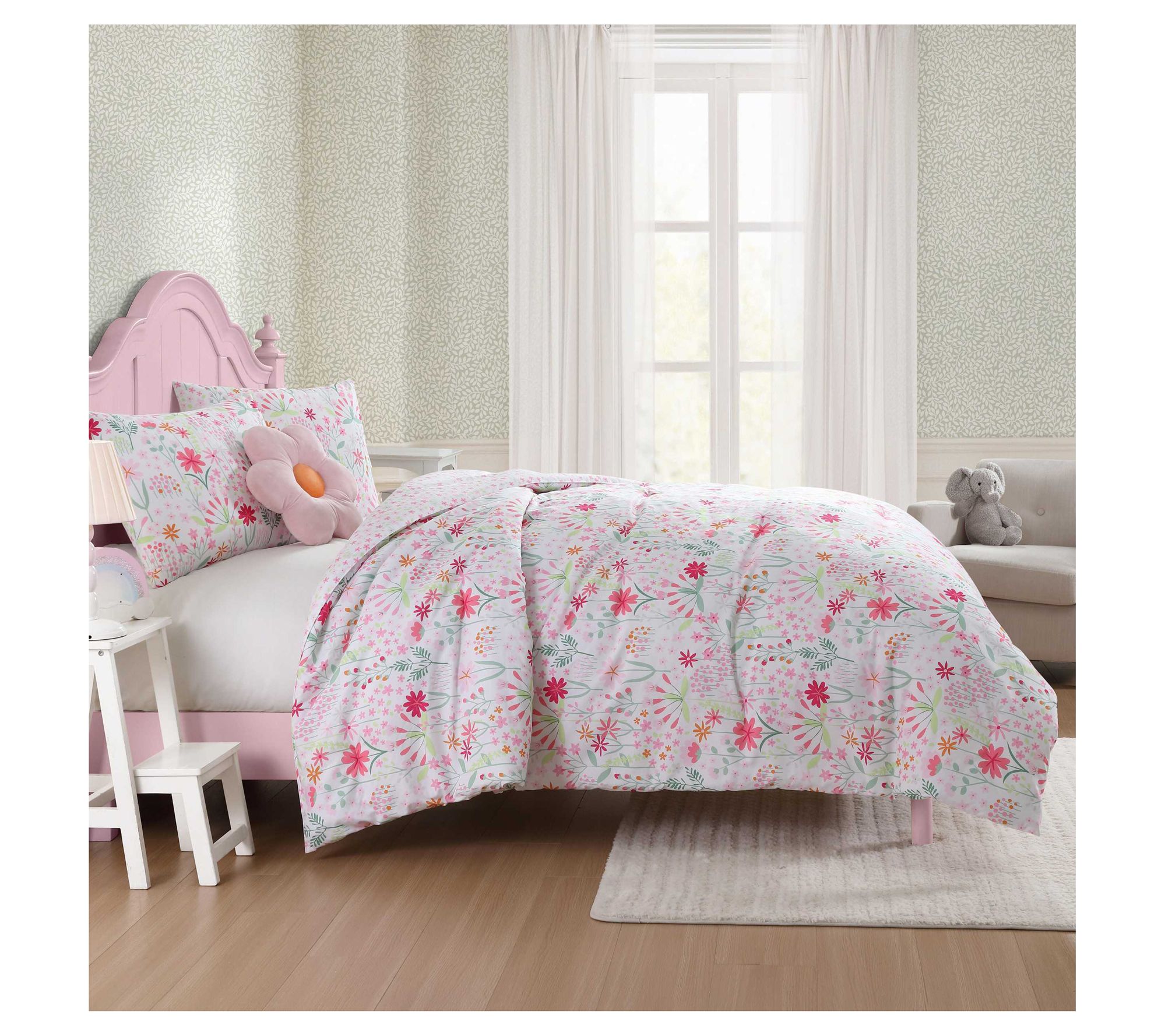 Brighten up any bedroom with the Laura Ashley Sunshine Flowers comforter and sham set. This vibrant floral design in cheerful pink and green adds a playful touch, making it ideal for kids or anyone seeking a fresh and lively aesthetic. The microfiber material ensures softness and durability for year-round comfort. From Laura Ashley.