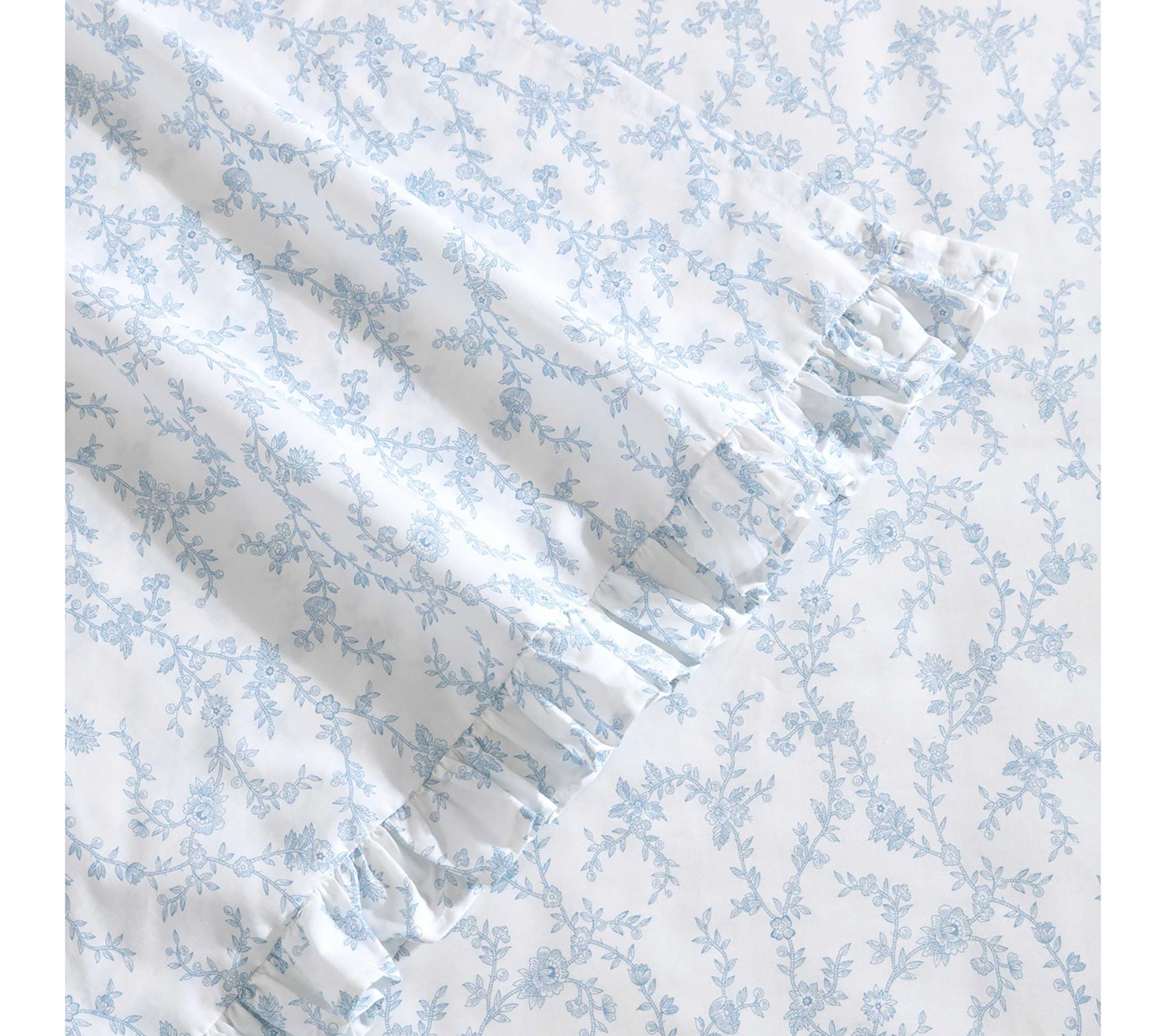 Introducing the new Laura Ashley Victoria Blue Queen sheet set, where timeless elegance meets luxurious comfort. Crafted from premium percale cotton, these sheets offer a soft, smooth feel for a restful nightâs sleep. The delightful ruffle detail on the pillowcase and flat sheet adds a touch of romance and sophistication to any bedroom decor. From Laura Ashley.