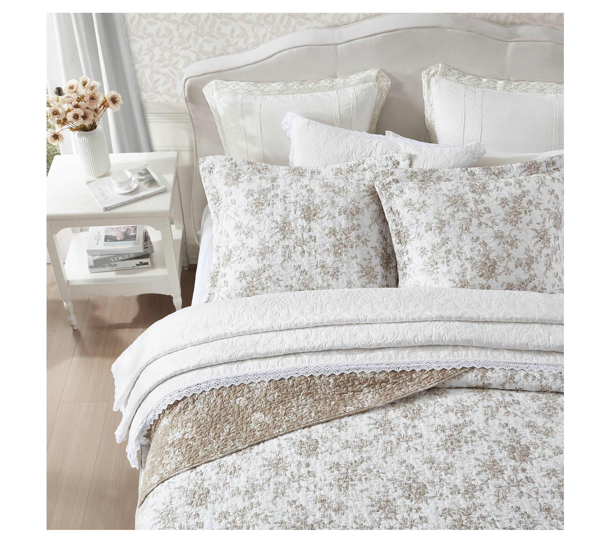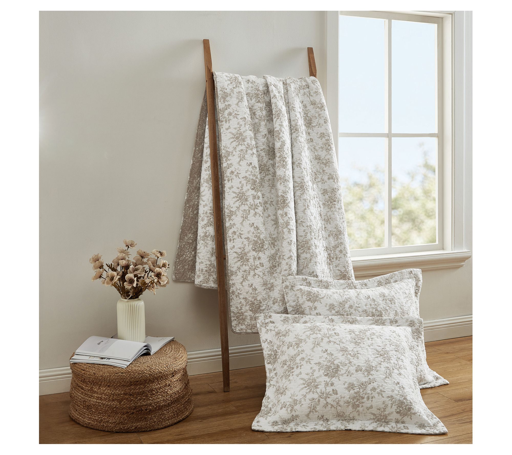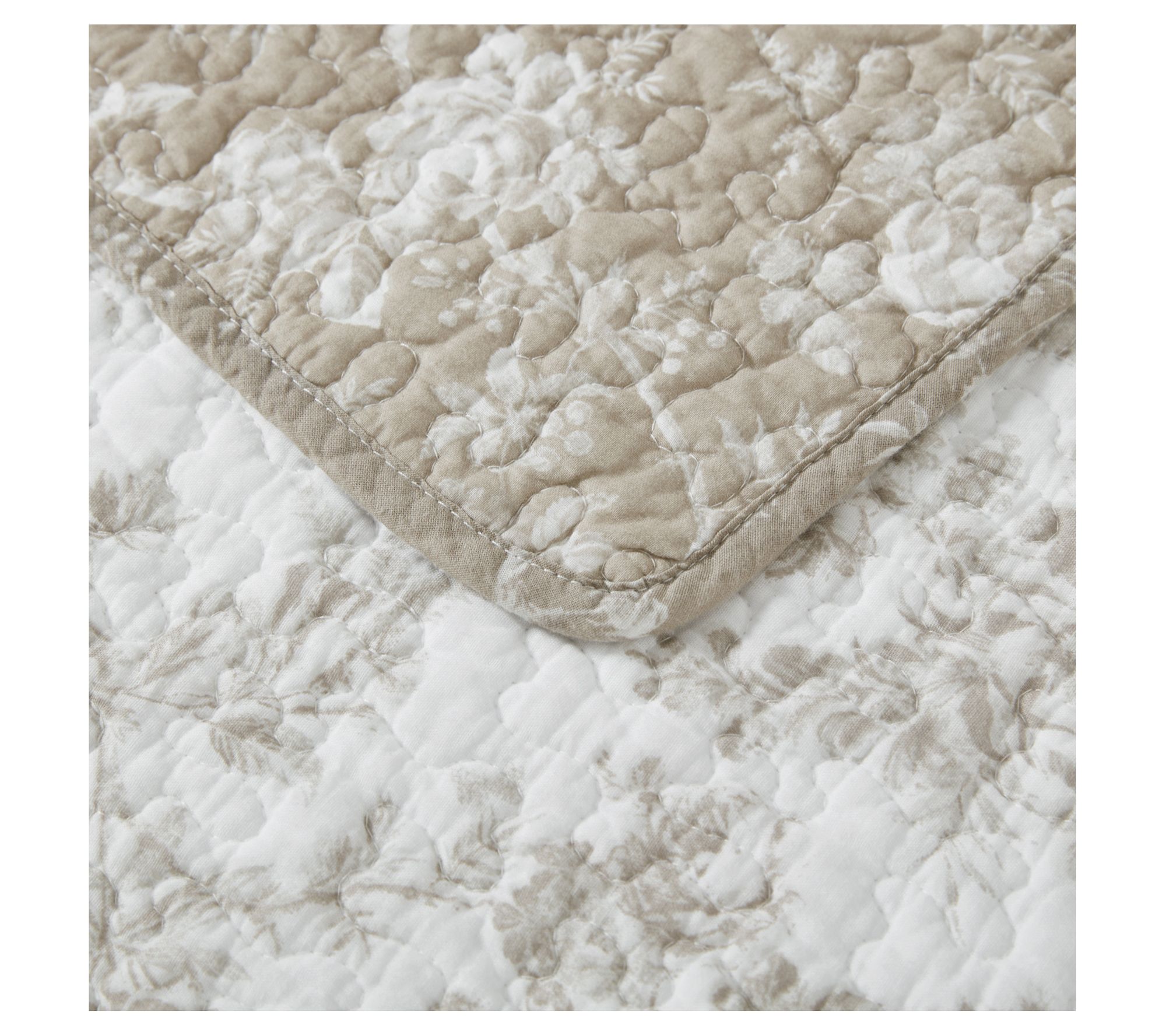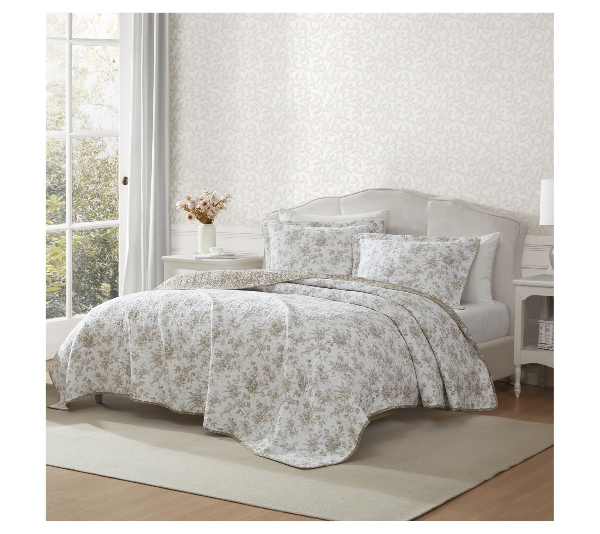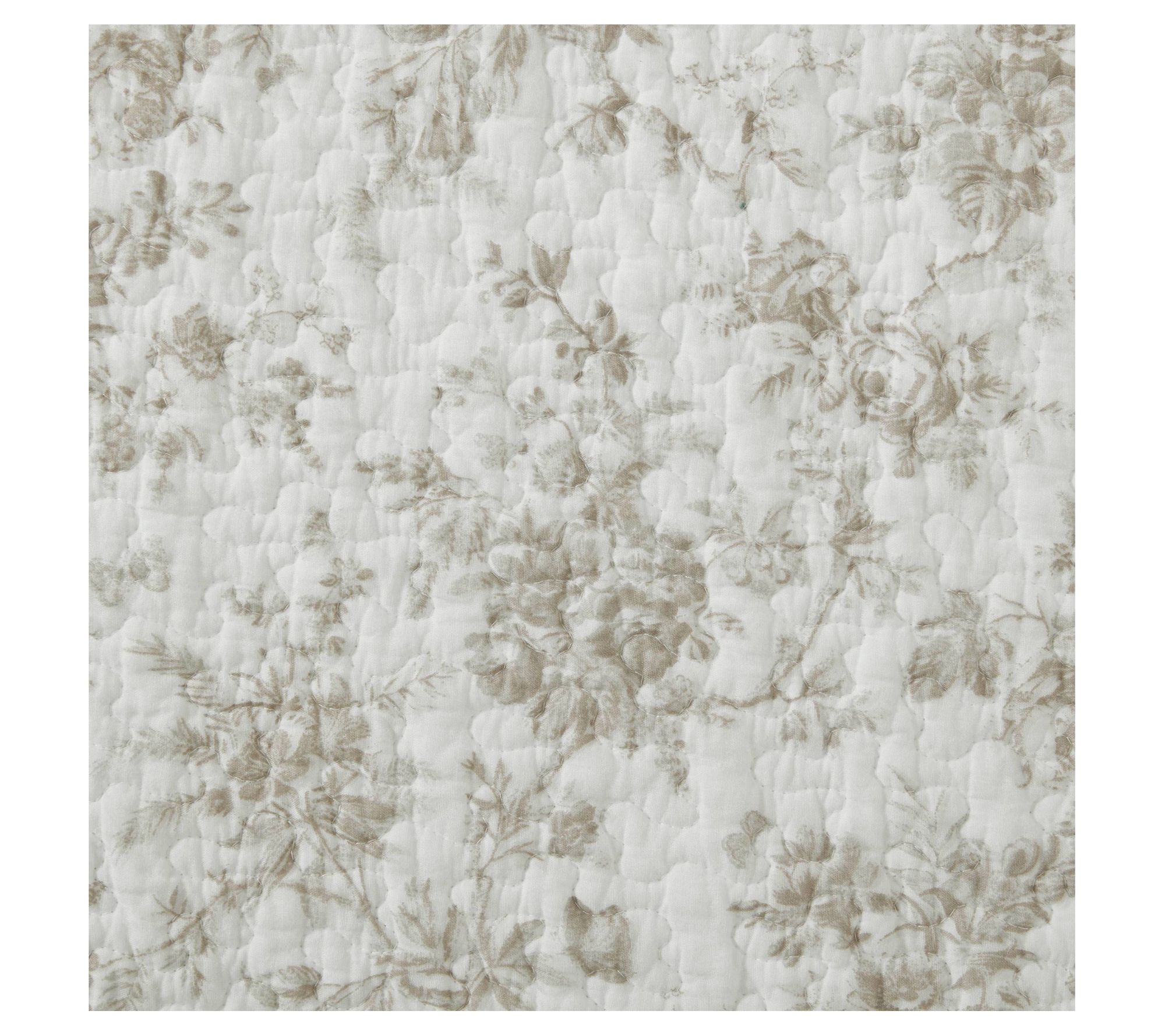Elevate your bedroom decor with the elegant Laura Ashley Walled Garden Full/Queen quilt and sham set, featuring a sophisticated floral toile pattern with warm mocha tones on a crisp white background. This 100% cotton set reverses to an alternate floral motif and is prewashed for added softness. From Laura Ashley.