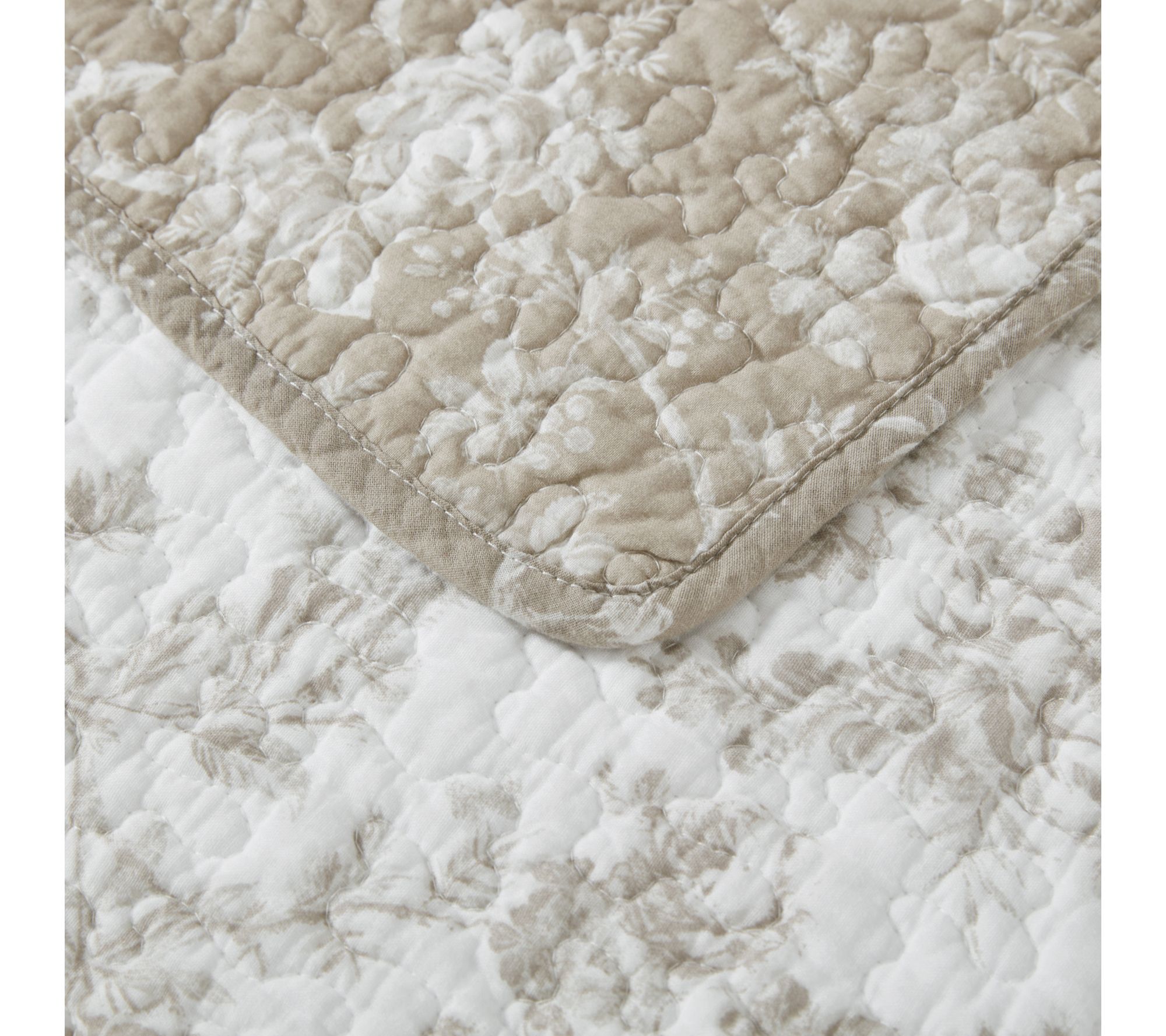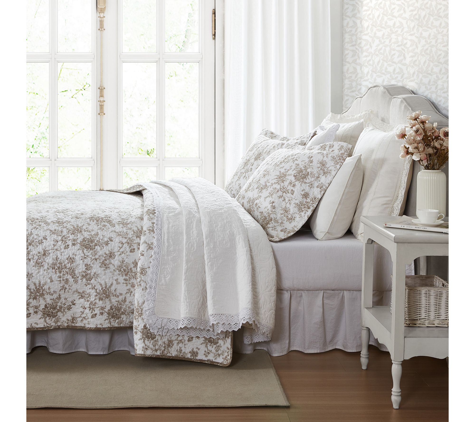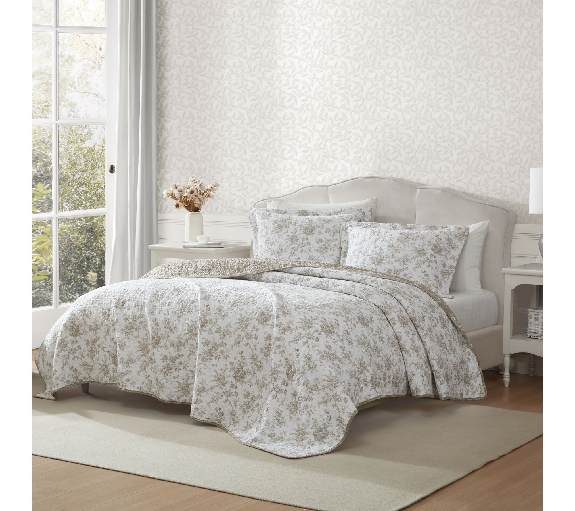 Brighten your bedroom with the sophisticated charm of the Laura Ashley Walled Garden King quilt and sham set. Featuring a warm mocha design on crisp white, this set adds timeless elegance with its intricate floral toile pattern. With its reversible design, enjoy versatile styling options for a refreshed look whenever you need. From Laura Ashley.