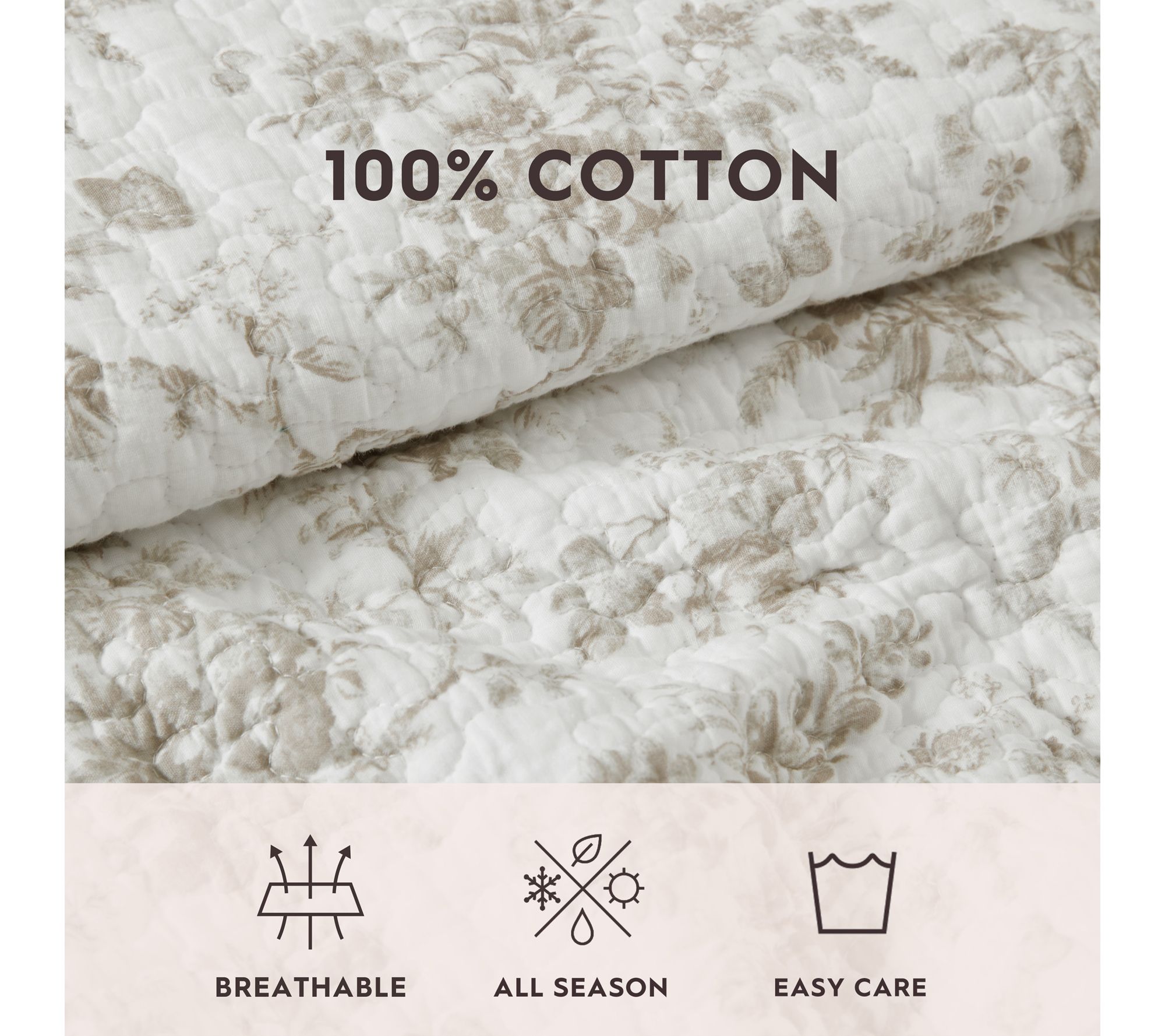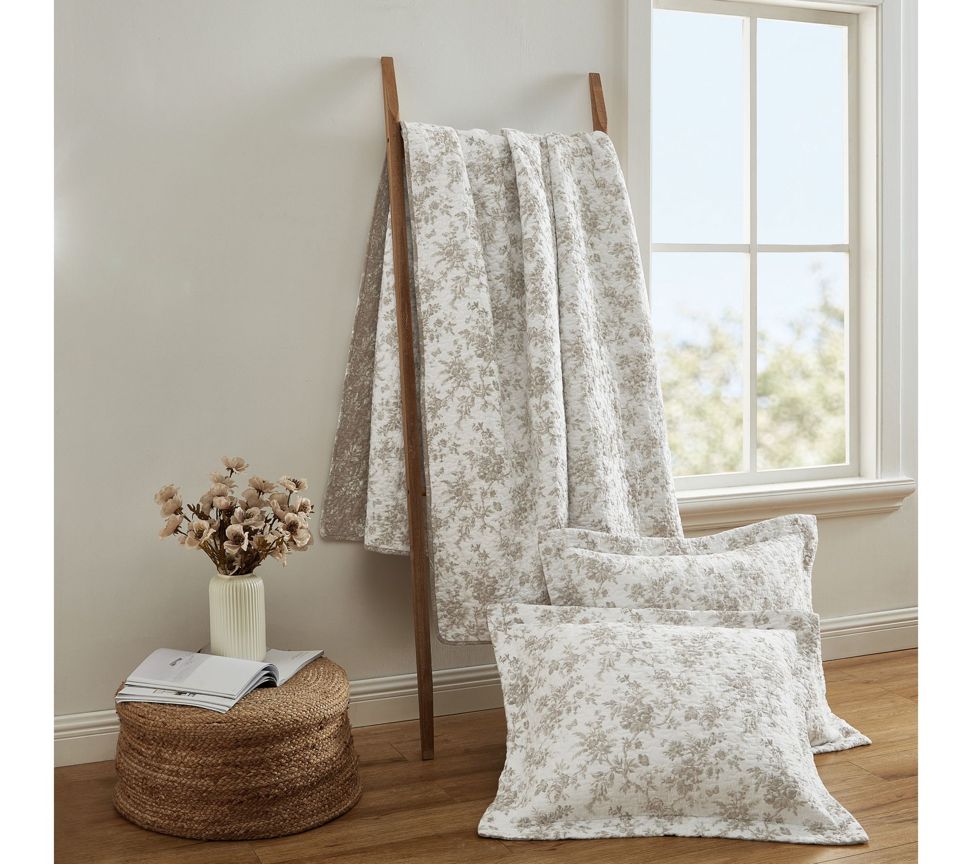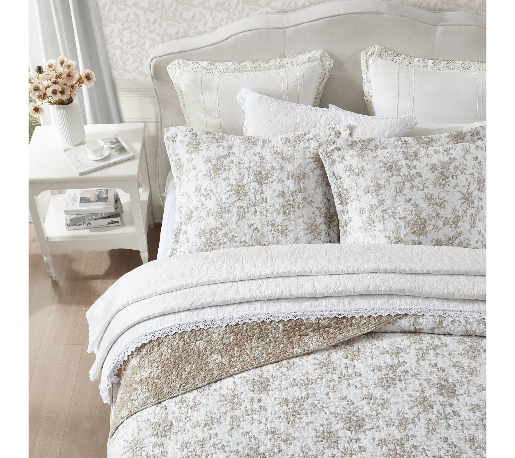 Brighten your bedroom with the sophisticated charm of the Laura Ashley Walled Garden King quilt and sham set. Featuring a warm mocha design on crisp white, this set adds timeless elegance with its intricate floral toile pattern. With its reversible design, enjoy versatile styling options for a refreshed look whenever you need. From Laura Ashley.