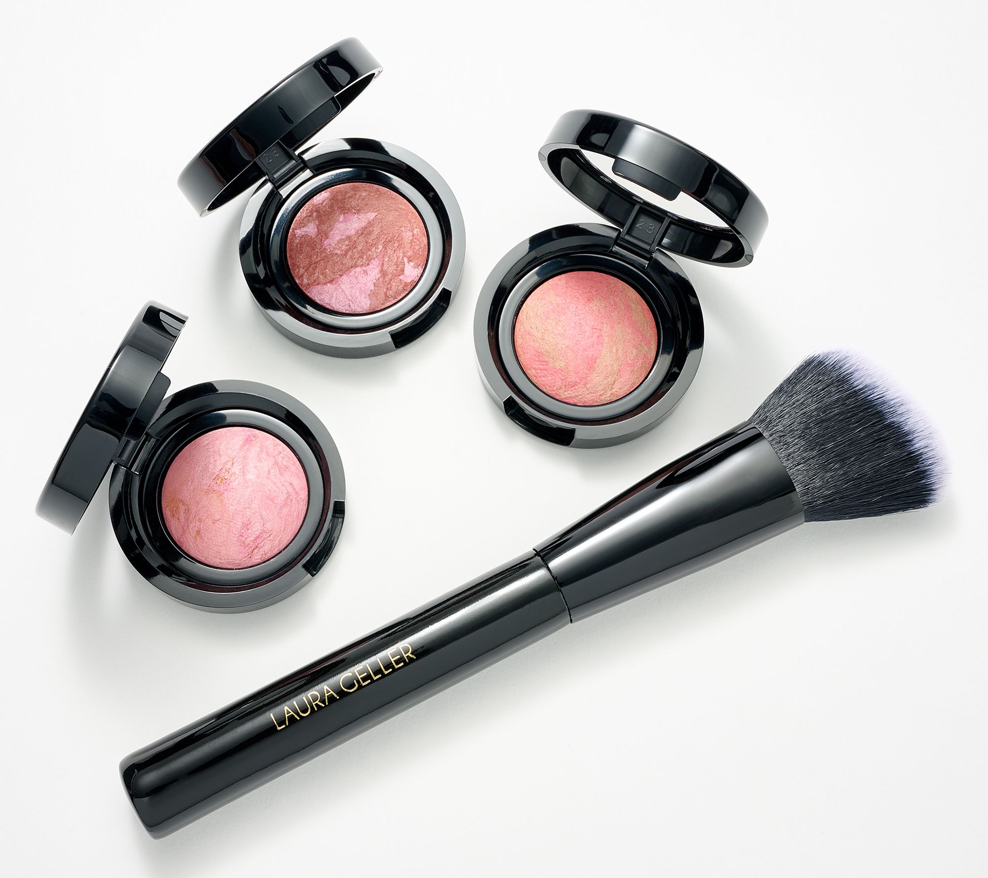 Flush your cheeks in an instant with Laura Geller's silky-smooth Baked Blush-N-Brighten Blush. This three-piece travel collection, baked on terracotta tiles for 24 hours, is finished into a silky dome of marbleized powder that delivers flattering color with a hint of happy radiance! Plus, you'll also receive a full-size angled blush brush to create a gorgeous glow wherever you go.