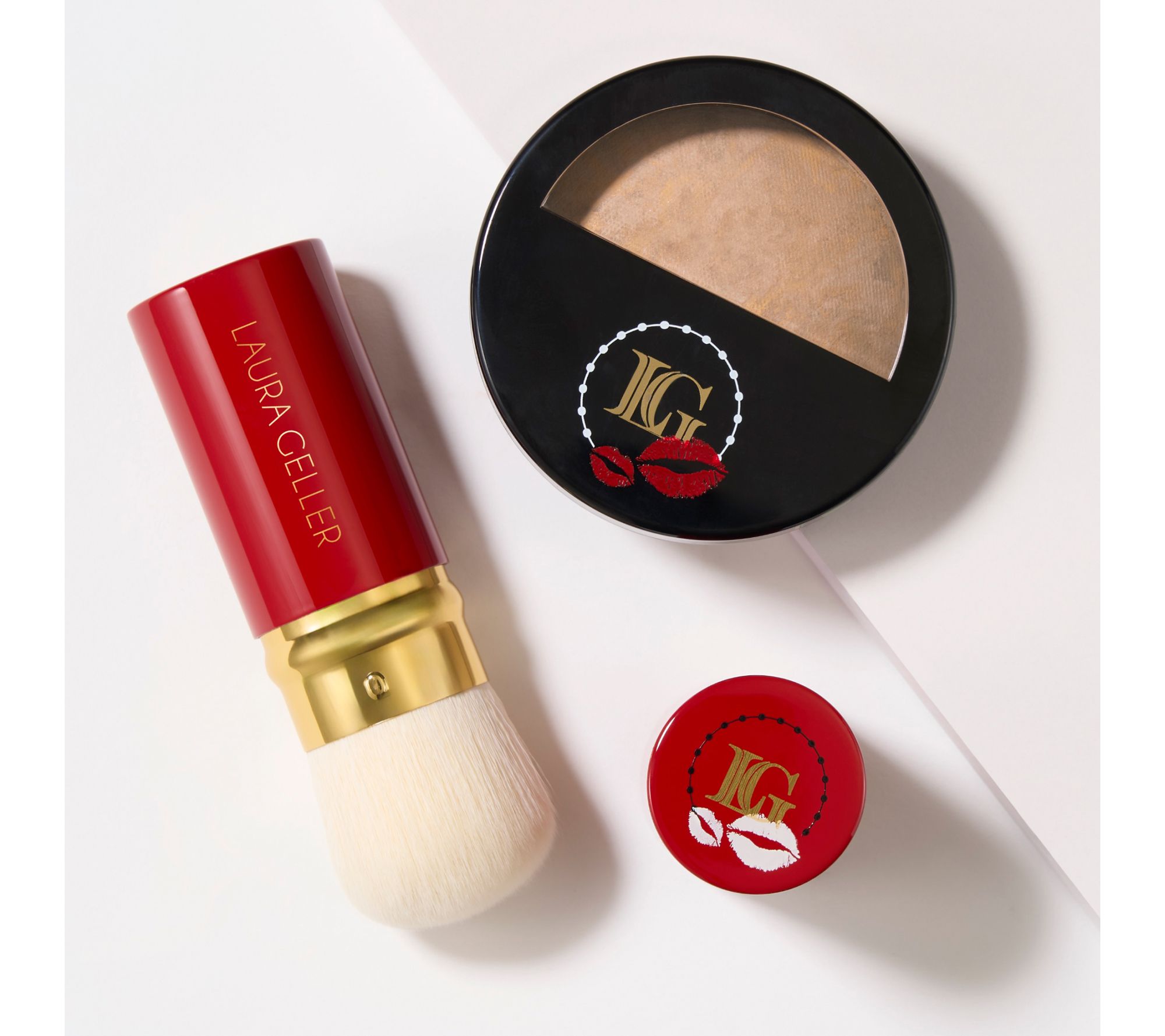 Head into the holidays with a full face of Festive Favorites from Laura Geller! Perfect the look of your party-ready complexion with Baked Balance-n-Brighten Foundation and retractable Kabuki brush, both in special-edition designs. Then, enhance the look of your eyes with a palette of Baked Elements Eye Shadows and Kajal Eyeliner in coordinating shades that work for every skin tone. Finish with a swipe of Jelly Balm Lip Color for a moisturizing pop.