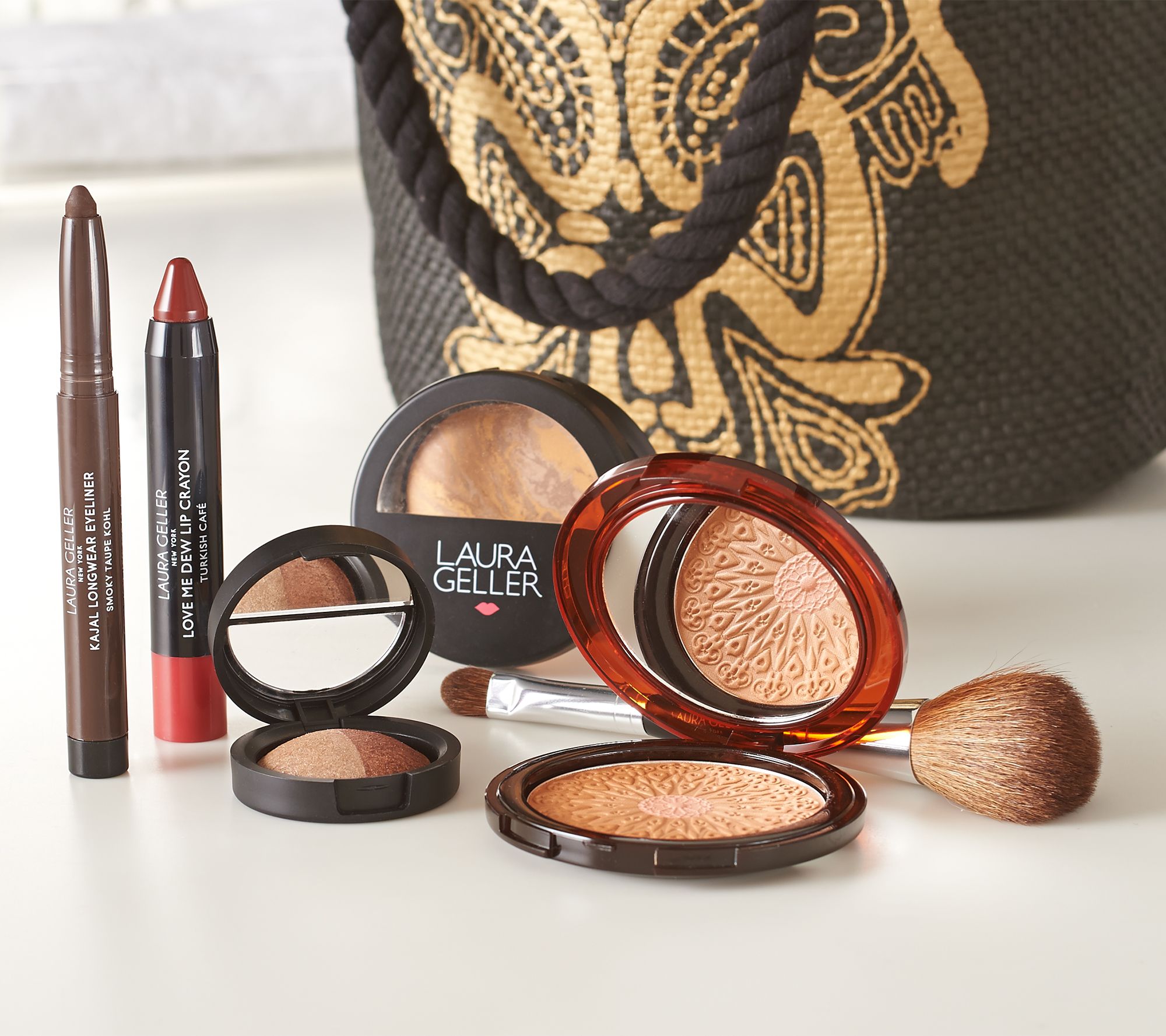 Transport your look with Laura Geller's Mediterranean Journey collection. Inspired by the Italian Riviera's pristine beaches and Morocco's sensory spice markets, the colors reflect the region's regal range of reds, mauves, golds, and rich earth tones. Featuring Baked Balance-N-Brighten Color Correcting Foundation in your choice of Porcelain, Fair, Medium, Tan, or Deep, the collection includes Baked Mediterranean Bronzer for a customized matte bronze glow, plus an eye shadow duo and Kajal Longwear Eyeliner for dewy, smoky eyes, and Love Me Dew Lip Crayon for rich, moisturized lips. Packed to go in a beautiful embroidered tote, it's sophisticated and sun-kissed beauty to last all season long.