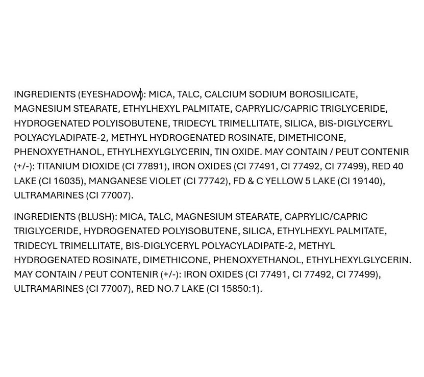 How do I use it: Apply Base shade all over eye up to brow bone. Second, apply Lid shade all over the lid. Third, apply Crease shade in the crease area of the lid. Fourth, apply Inner Corner shade to tear duct area of the eye. Fifth, apply shadow to the Outer Corner of the lid. Lastly, apply Liner shade to the top of the lash line and along bottom lashes if desired. Apply blush color over the apples of your cheeks for instant radiance.