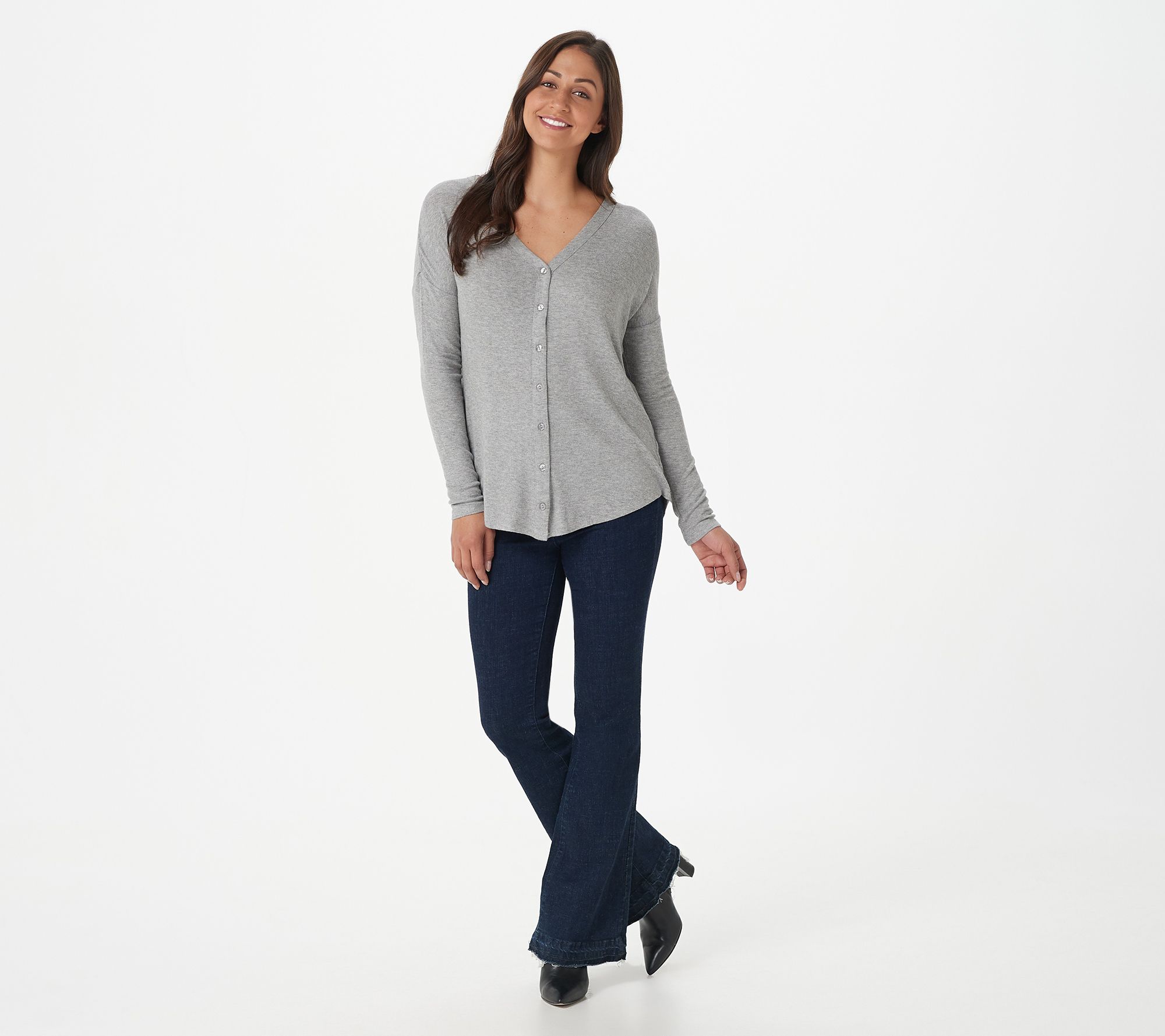 Features: long sleeves, V-neckline, button-front closure, shirttail hem