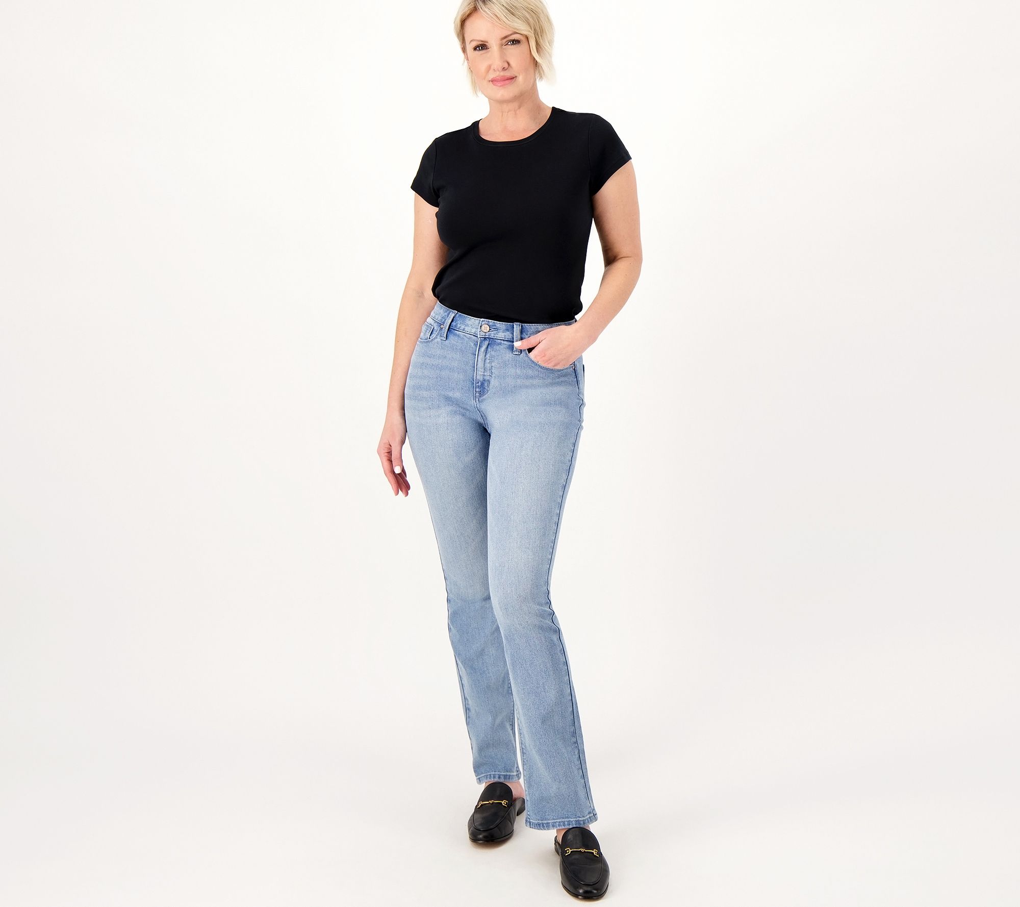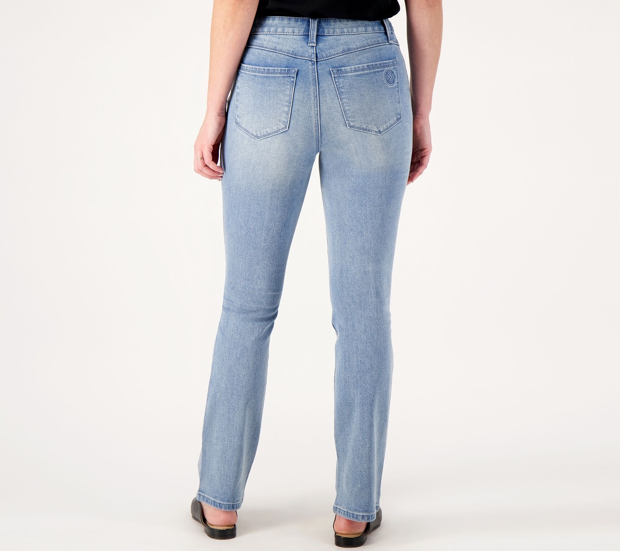 Leg Shape: baby bell; slimmer boot-cut shape, widens slightly from knee to leg opening