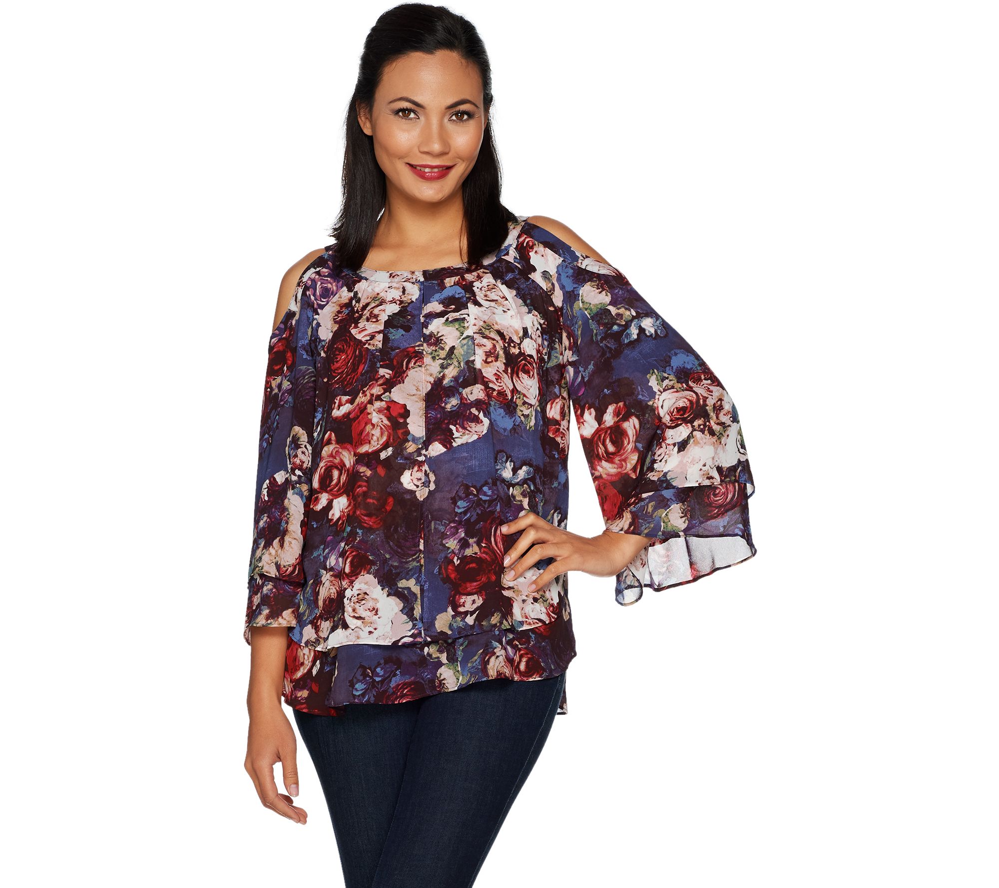 You'll love the way this semi-fitted blouse skims across your body. And the detail found in its 3/4-length, bell-shaped, cold-shoulder sleeves and their two-tier design. From Laurie Felt Los Angeles.