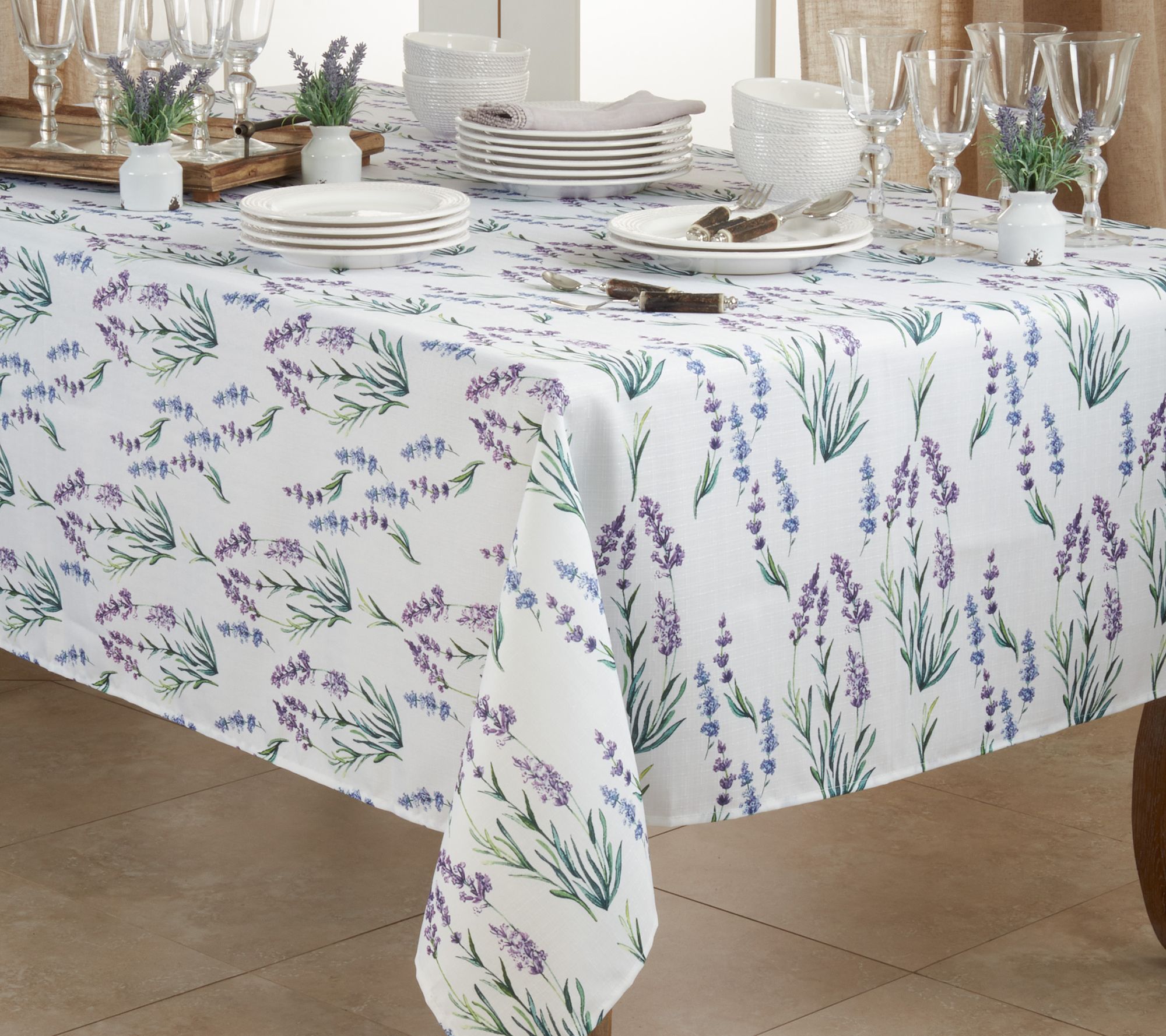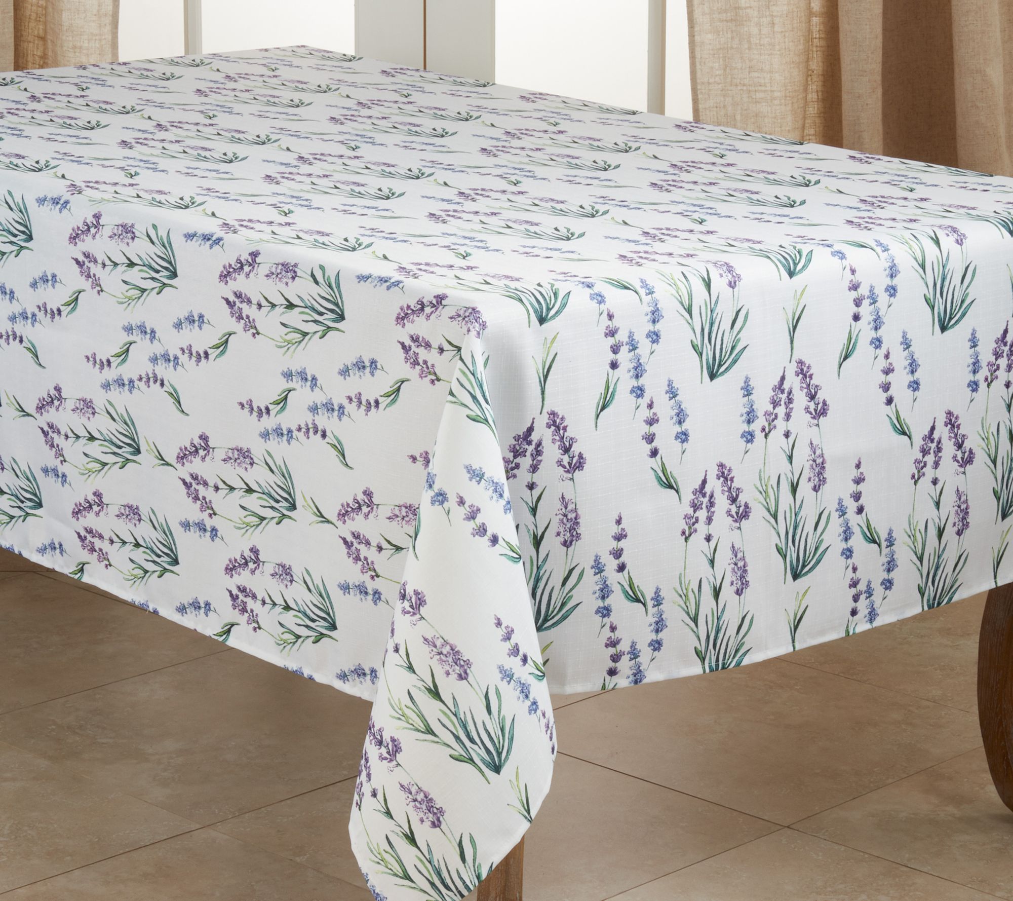 Bright light and liveliness to your dining room or kitchen with this lavender print tablecloth. From the Valerie Parr Hill Collection.