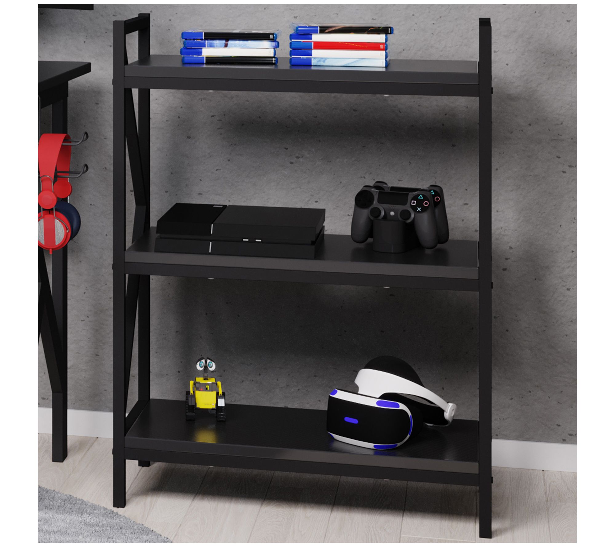 A sleek and functional addition to your office or gaming setup, this three-shelf bookcase offers plenty of room for books, consoles, computer equipment, and more. From Lavish Home.