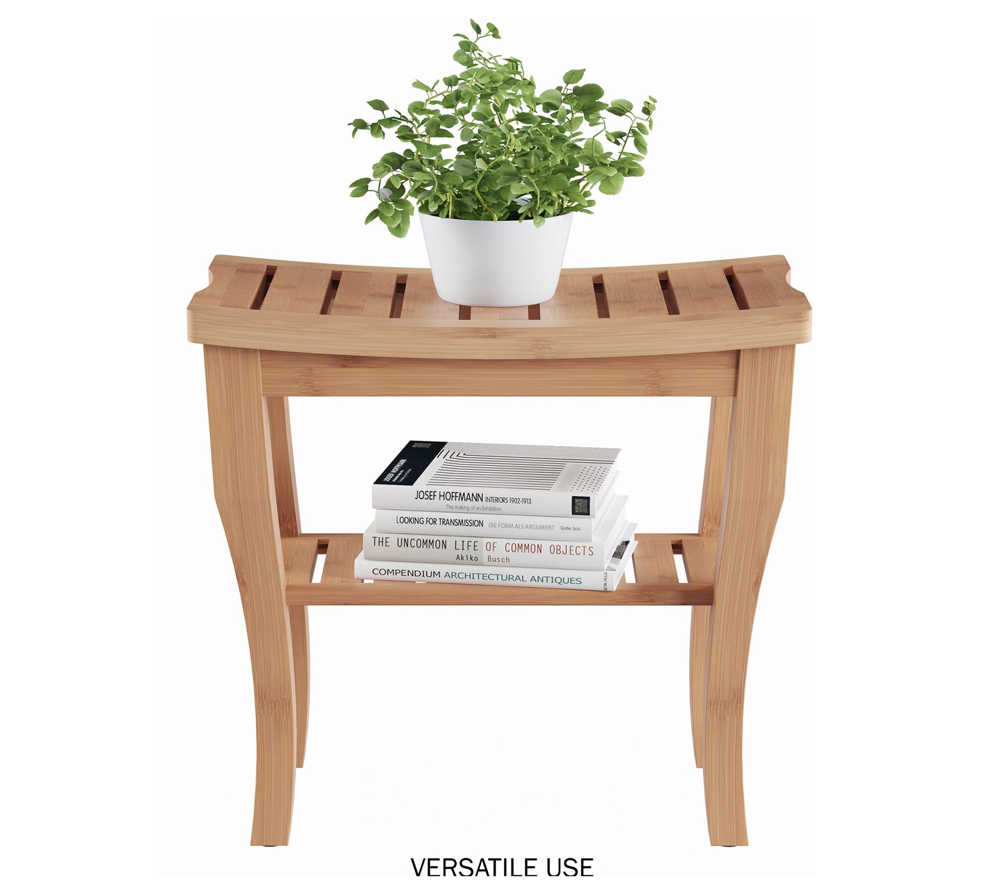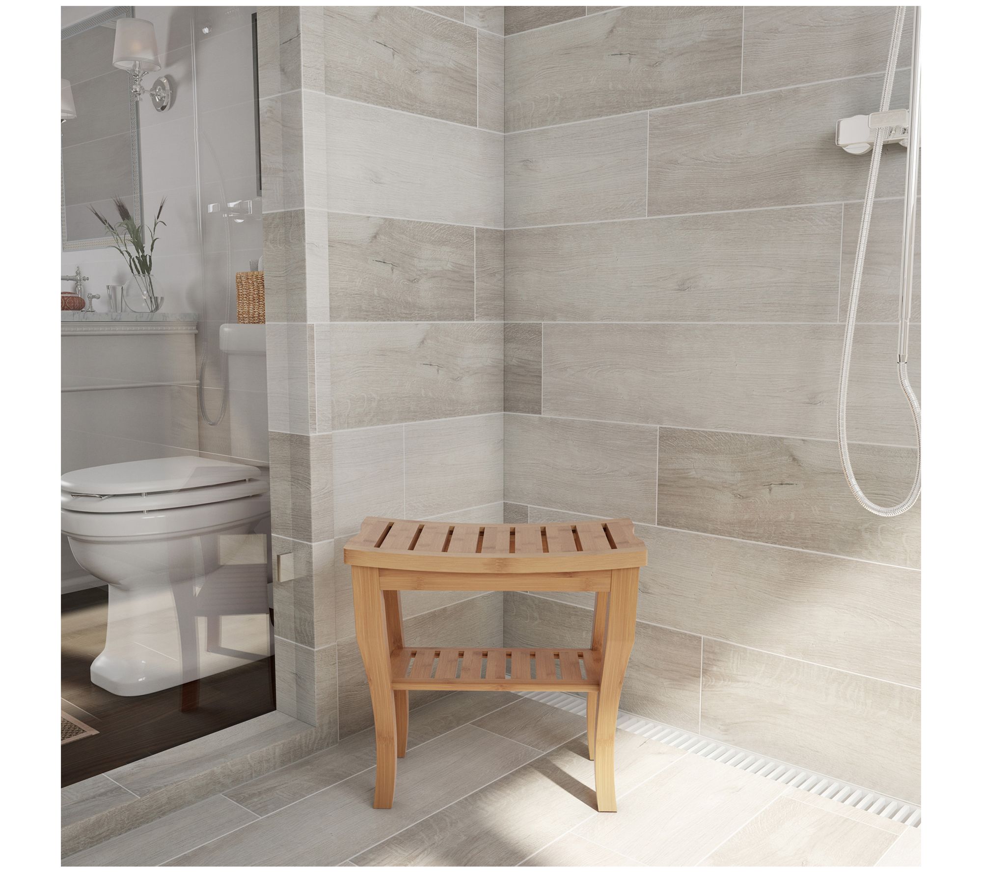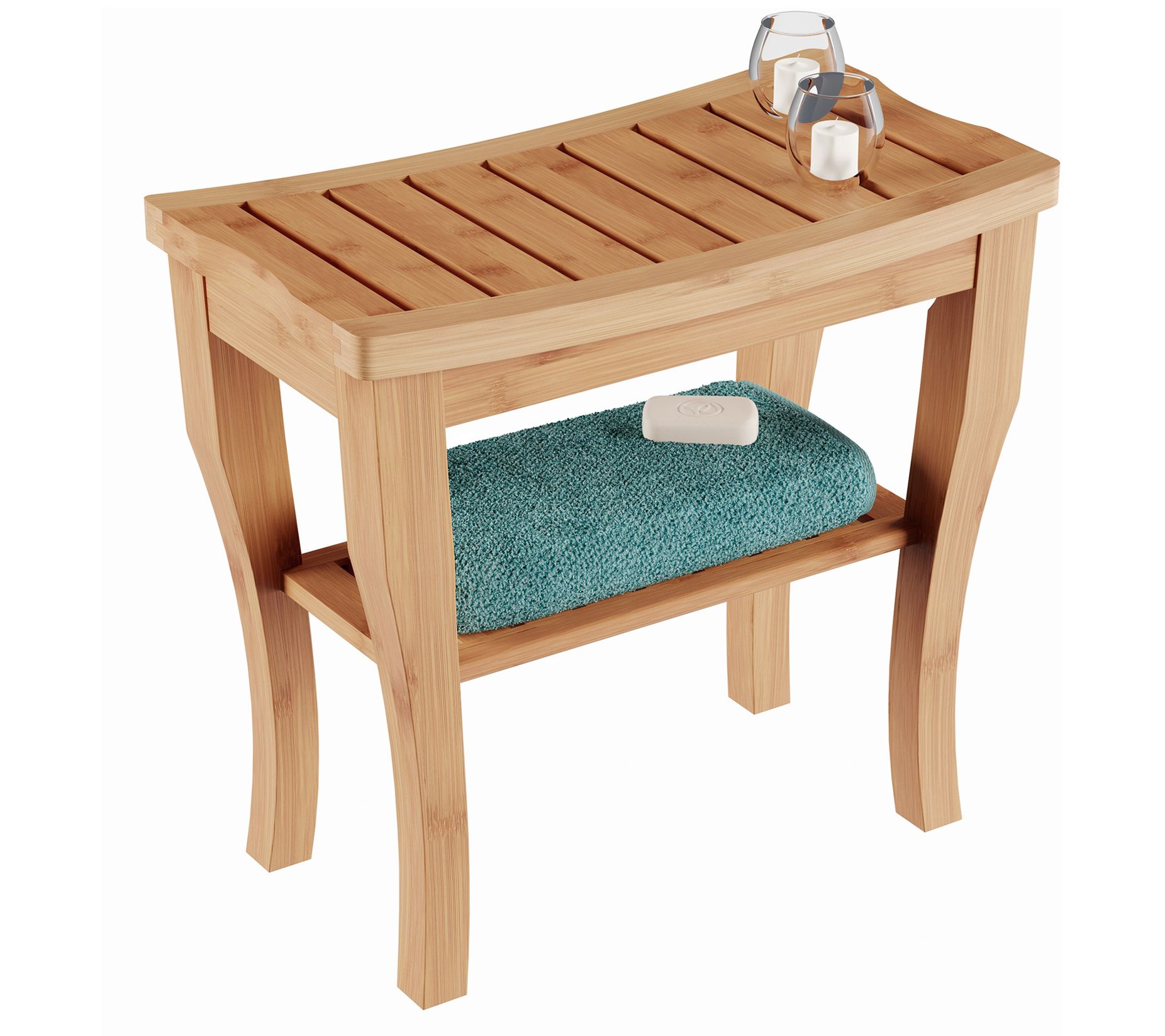 Update your shower routine with this bamboo bench boasting a convenient built-in shelf beneath the seat. From Lavish Home.