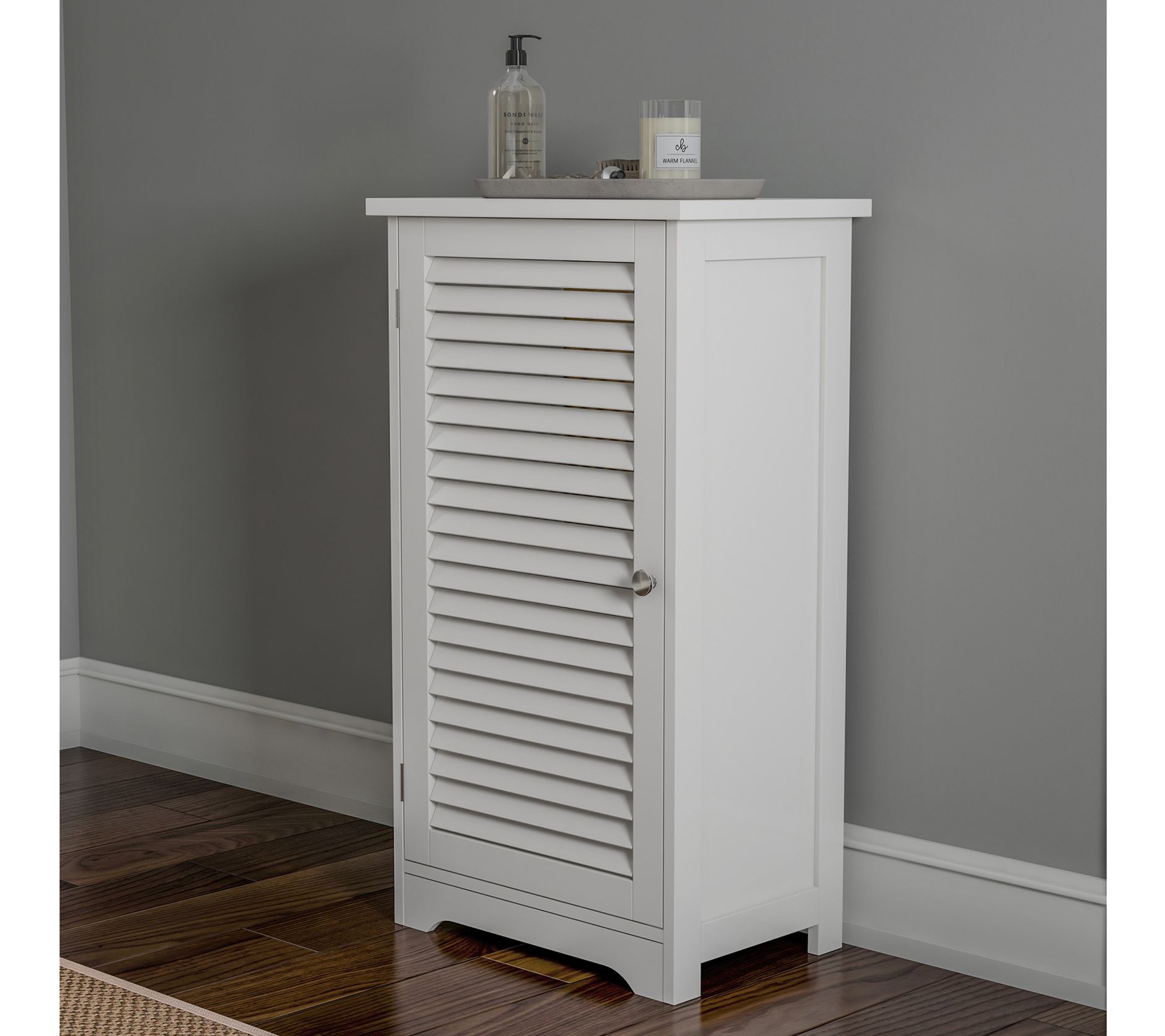 Bring a splash of style and much-needed extra storage to a bathroom or laundry room with this linen cabinet, featuring a convenient top shelf and a breezy shutter door that hides an adjustable shelf. From Lavish Home.