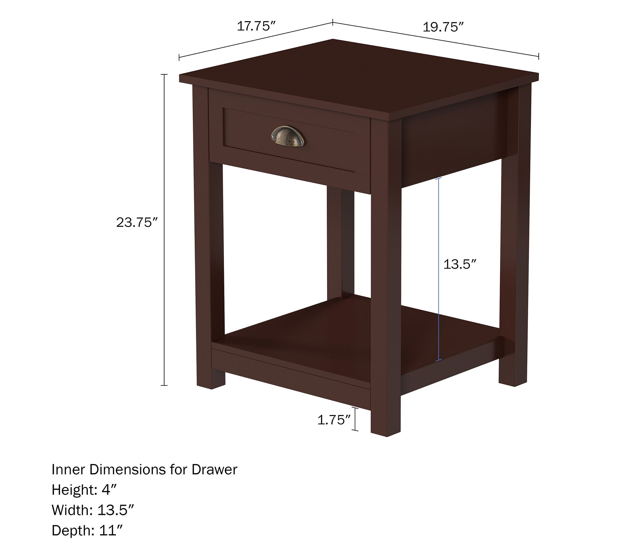 • Measures approximately 19.75"L x 17.75"W x 23.75"H; tabletop supports up to 22 lbs; shelf and drawer support up to 11 lbs each