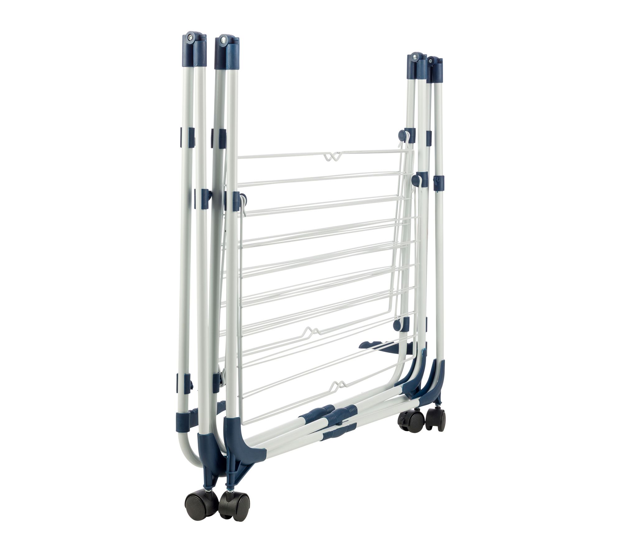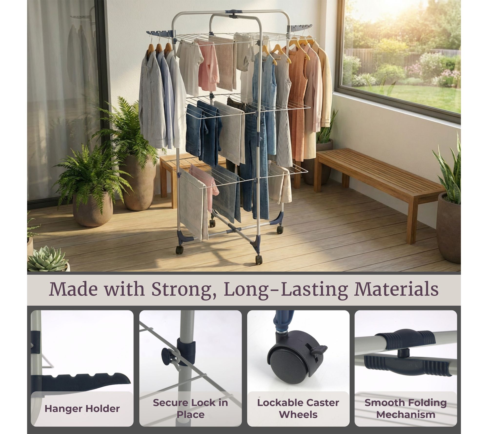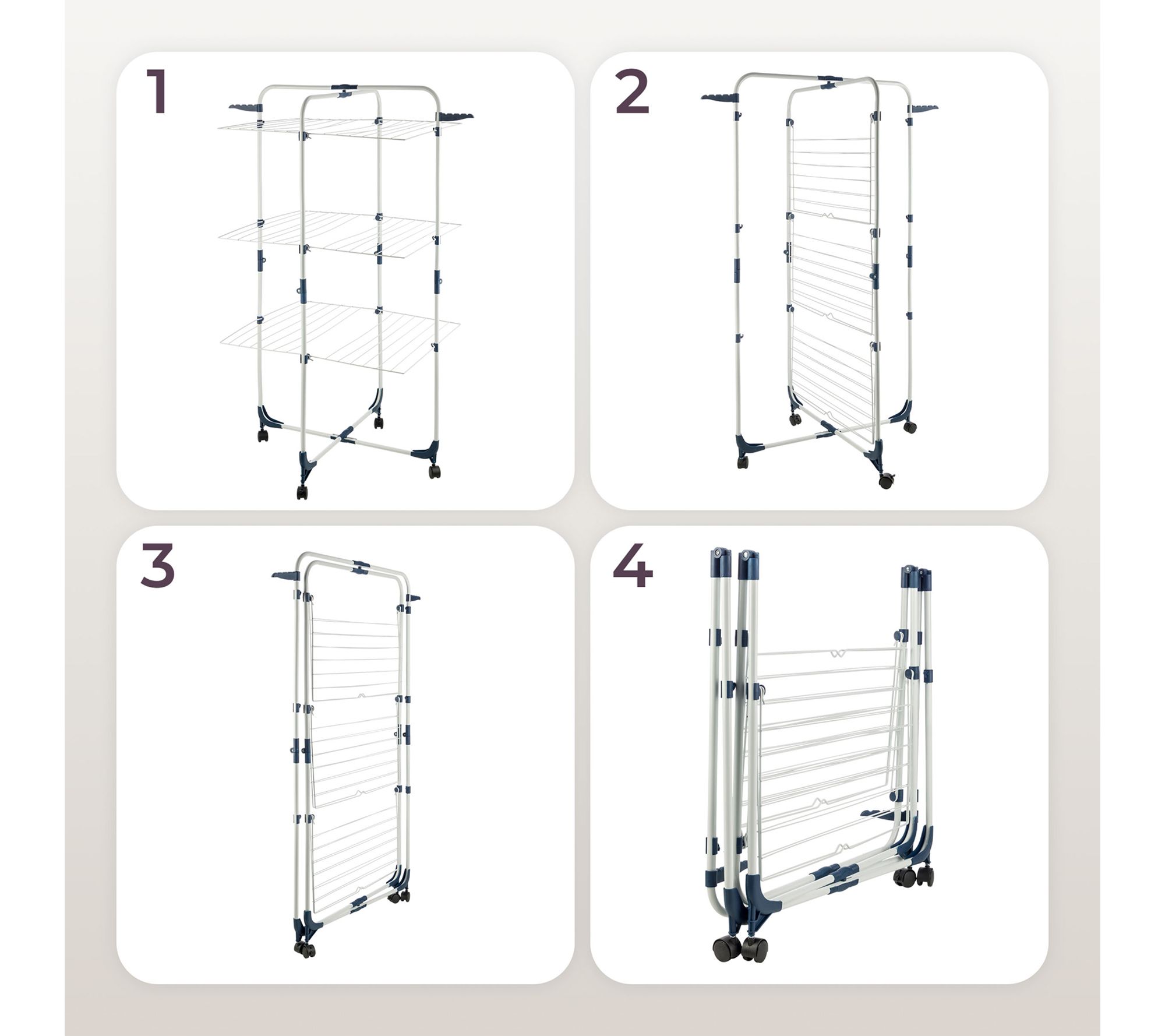 Tackle laundry day with ease thanks to this three-tiered clothes drying rack. Whether airing out delicate blouses or hanging bulky towels, the sturdy powder-coated steel structure resists rust and rolls smoothly from room to room on caster wheels. Savvy collapsible shelves make storing this compact laundry station a breeze, freeing up space in tight quarters. From Lavish Home.
