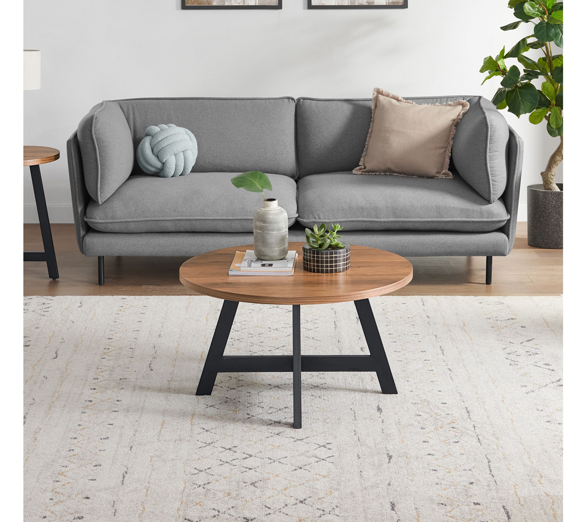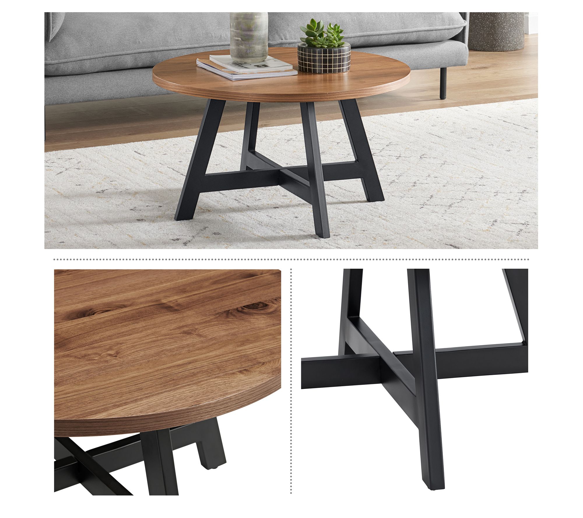 Bring modern industrial style to your living room with this round coffee table featuring a small footprint that works well in tight spaces. From Lavish Home.