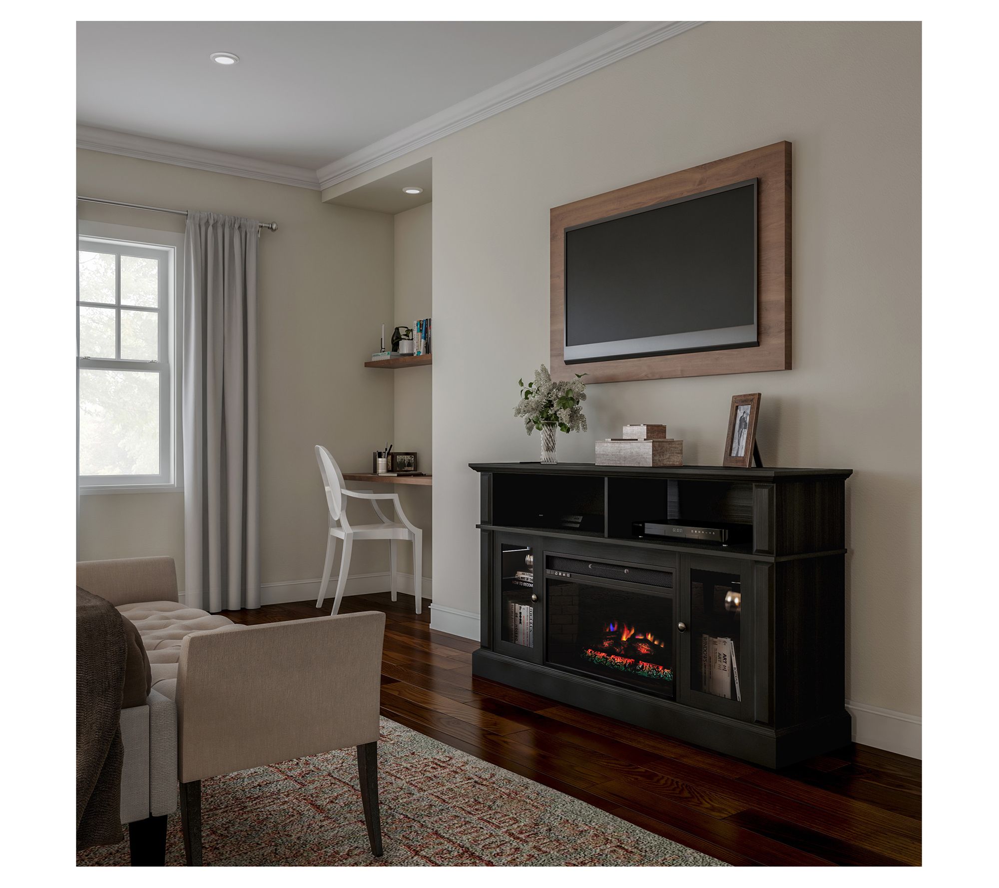 • Includes fireplace, TV stand, remote control, faux logs, and assembly hardware