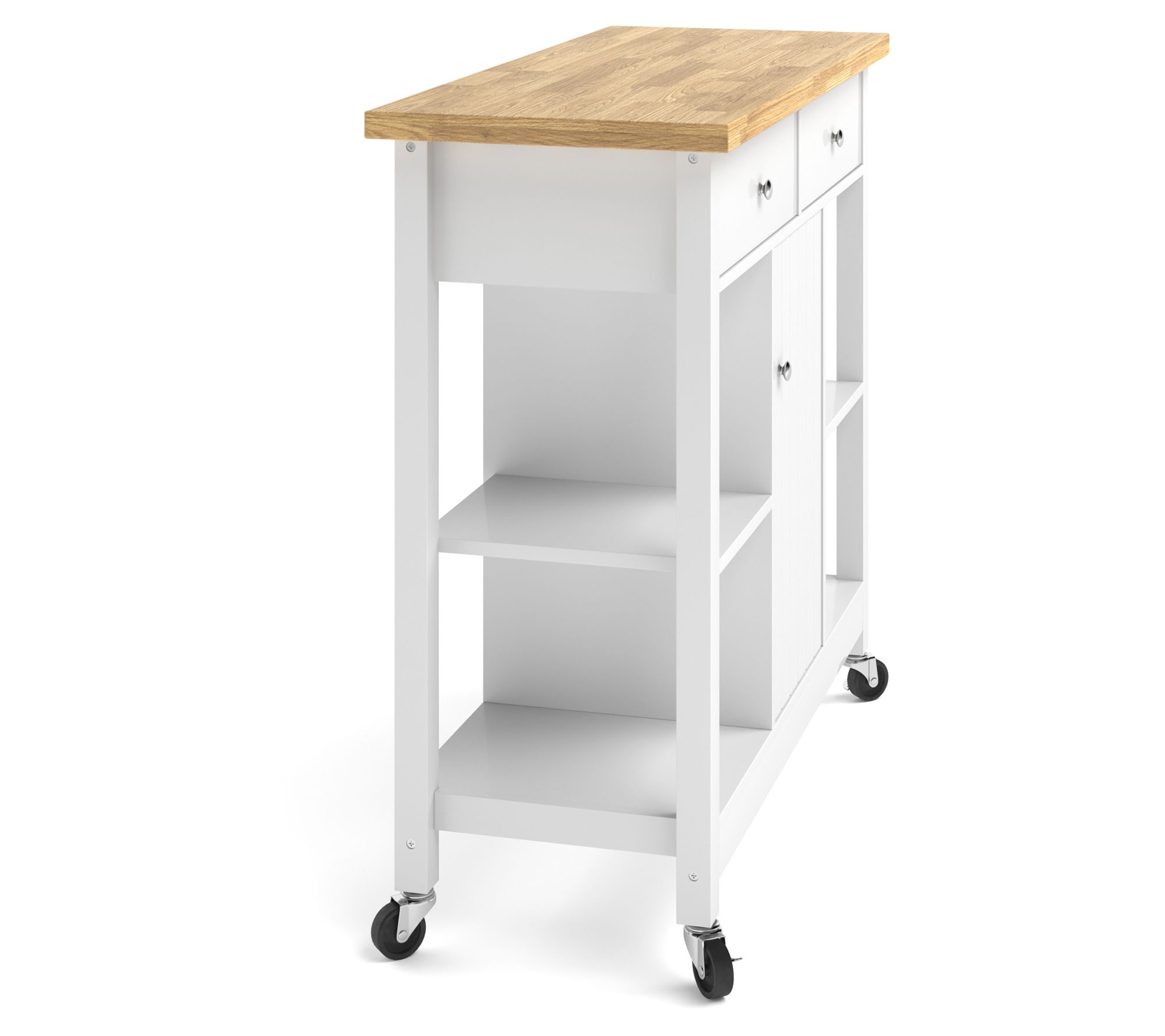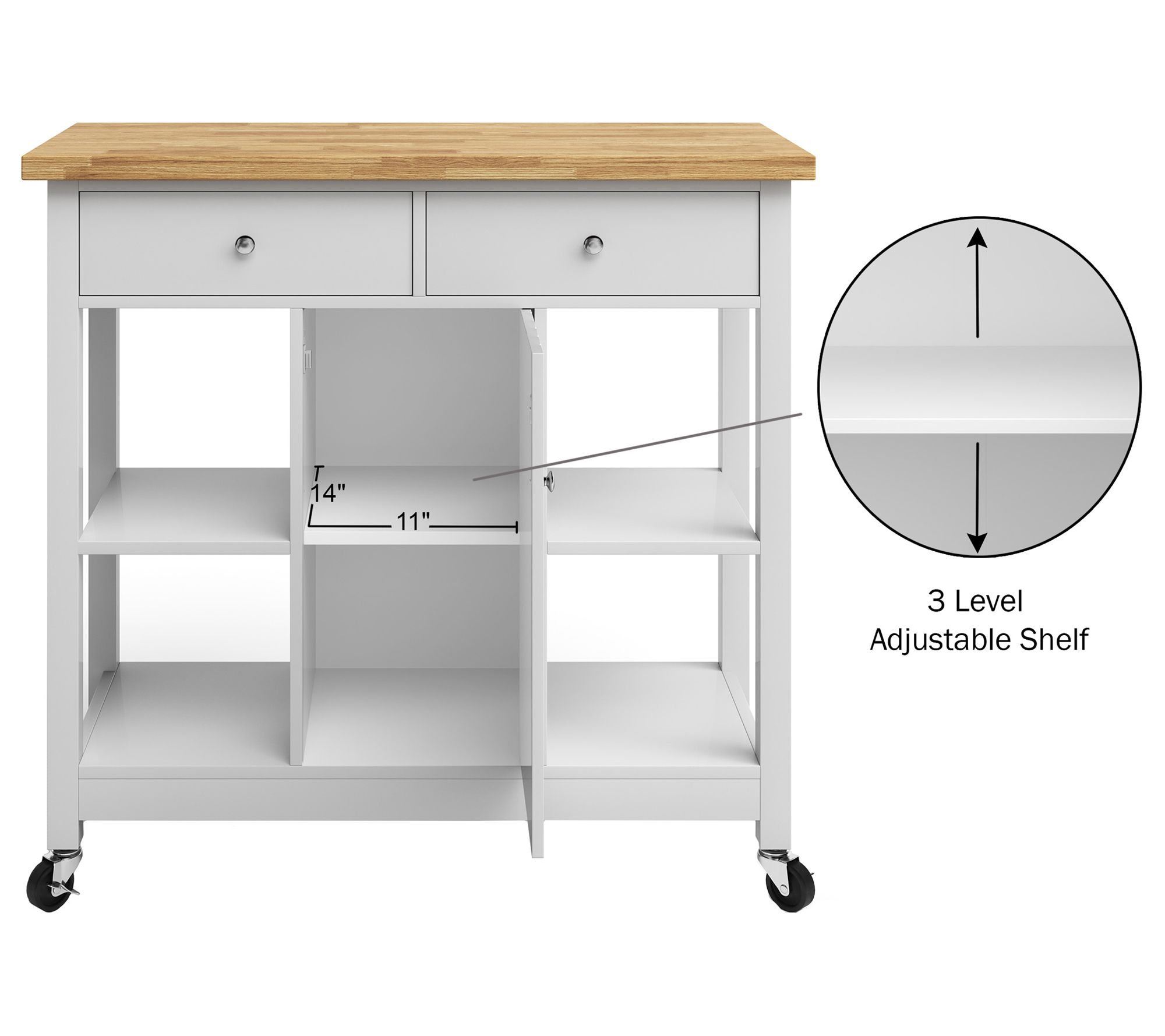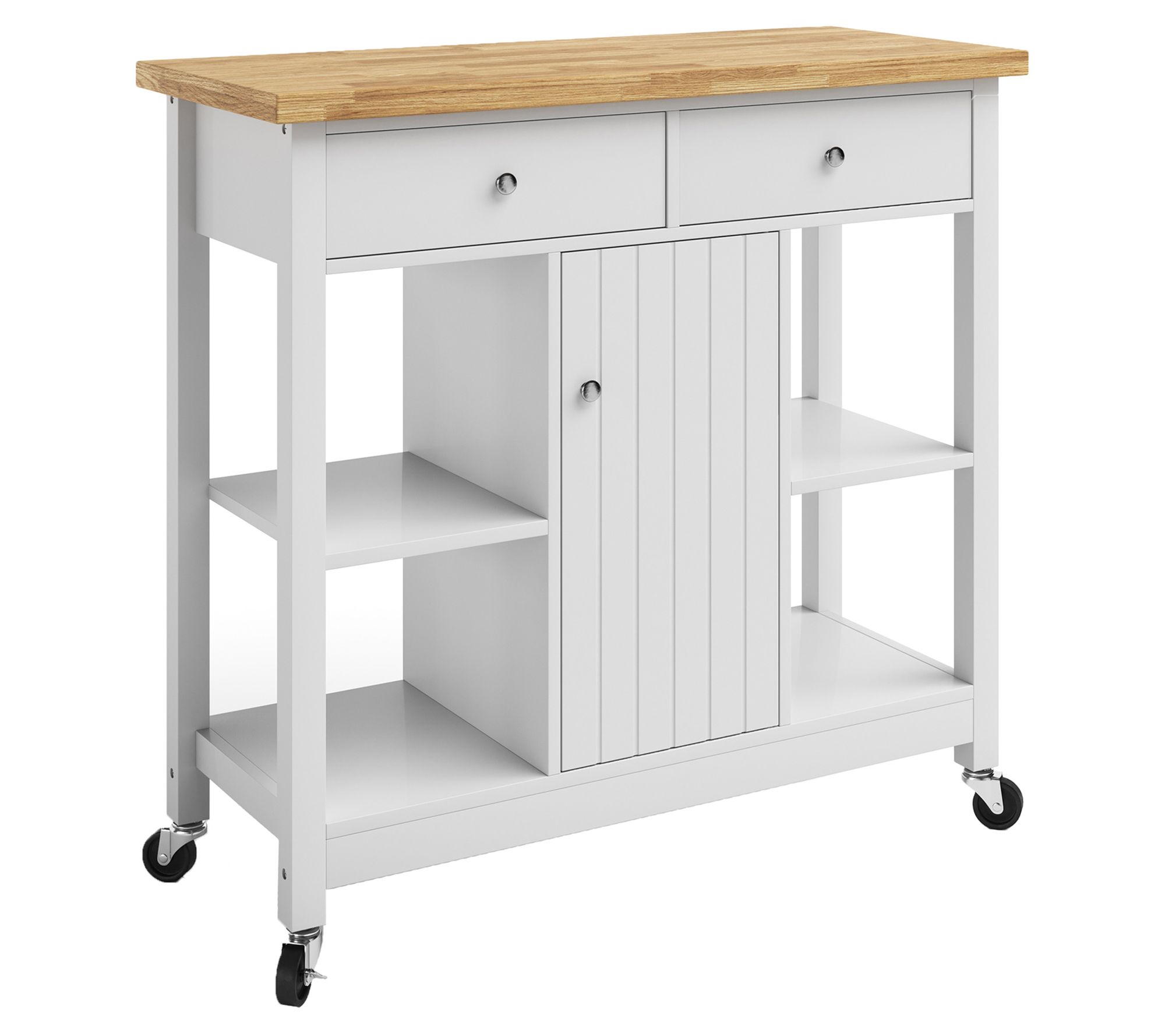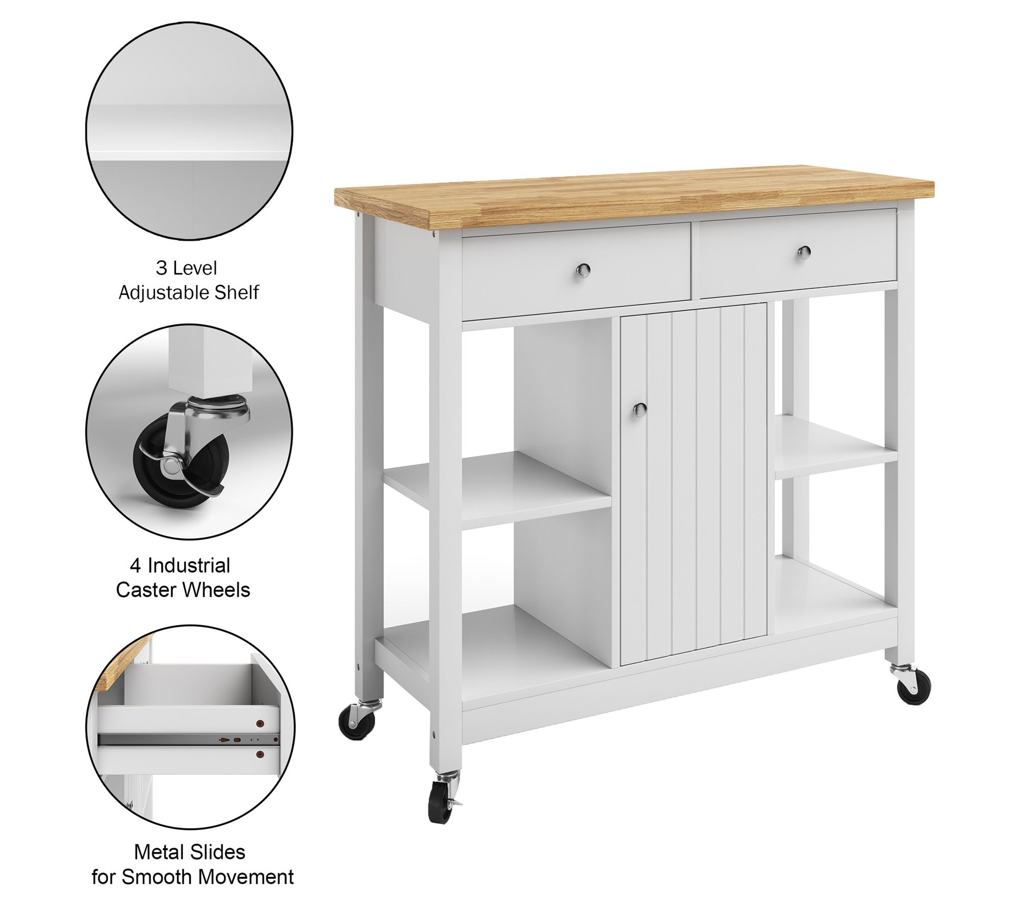 Add a touch of elegance and practicality to your kitchen with this rolling cart. This stylish piece not only provides extra counter space but also offers ample storage with open shelves for display items, two drawers, and a closed cabinet with an adjustable interior shelf. Whether you need additional space for a coffee station or a work surface, this cart is an ideal choice. From Lavish Home.