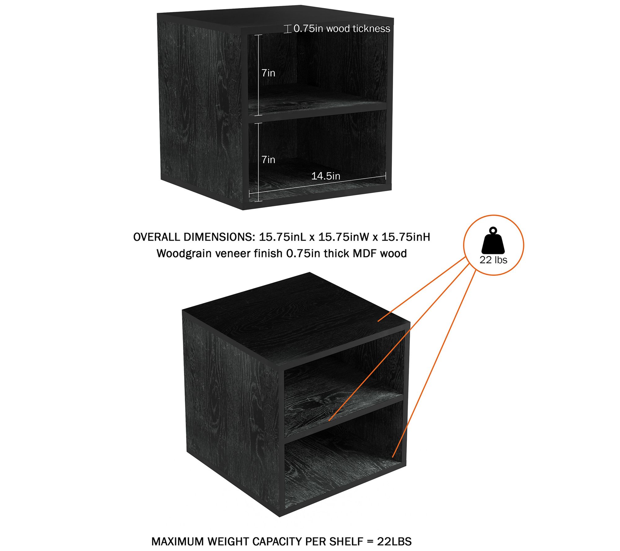 • Measures approximately 15.75"L x 15.75"W x 15.75"H; holds up to 22 lbs per fixed shelf