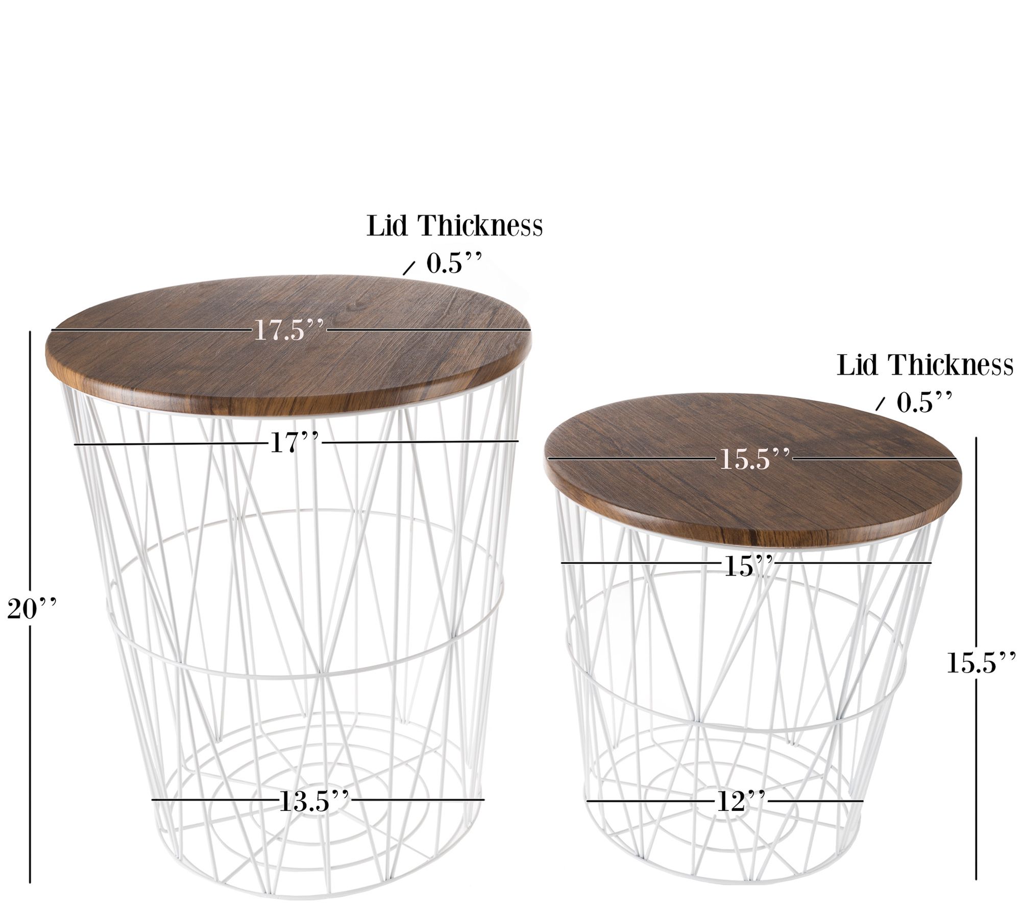 • Measurements: Small 15"Diam top x 12"Diam bottom x 15-1/2"H Large 17"Daim at top 13-1/2"Diam at base x 20"H