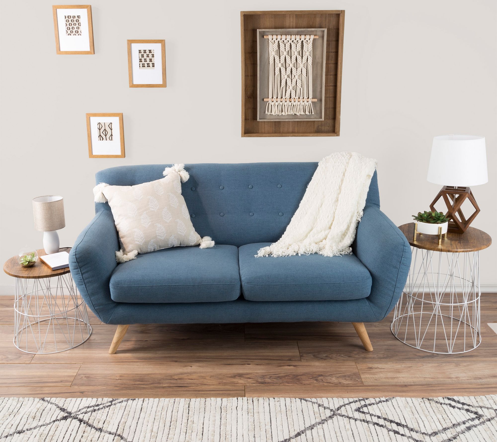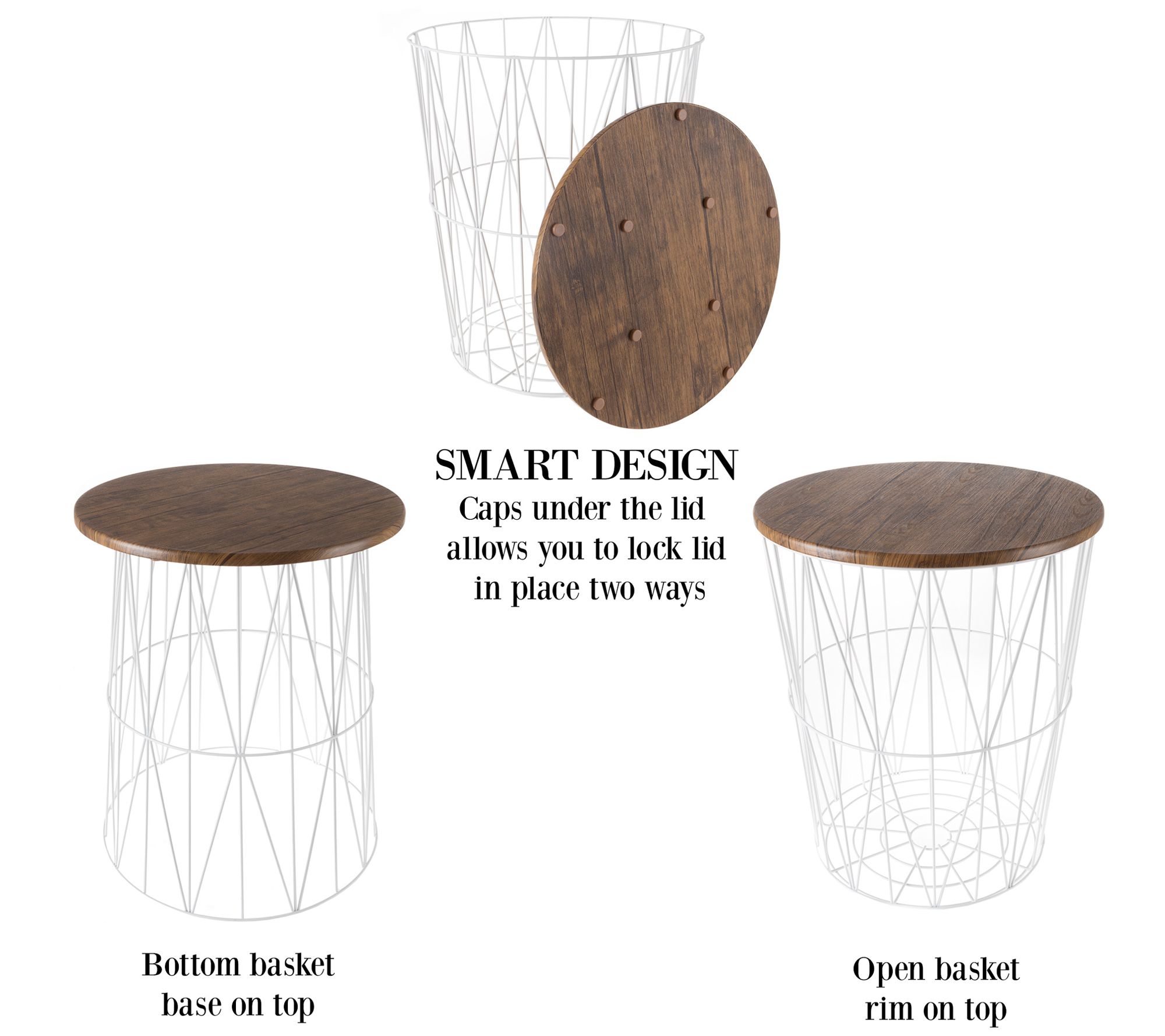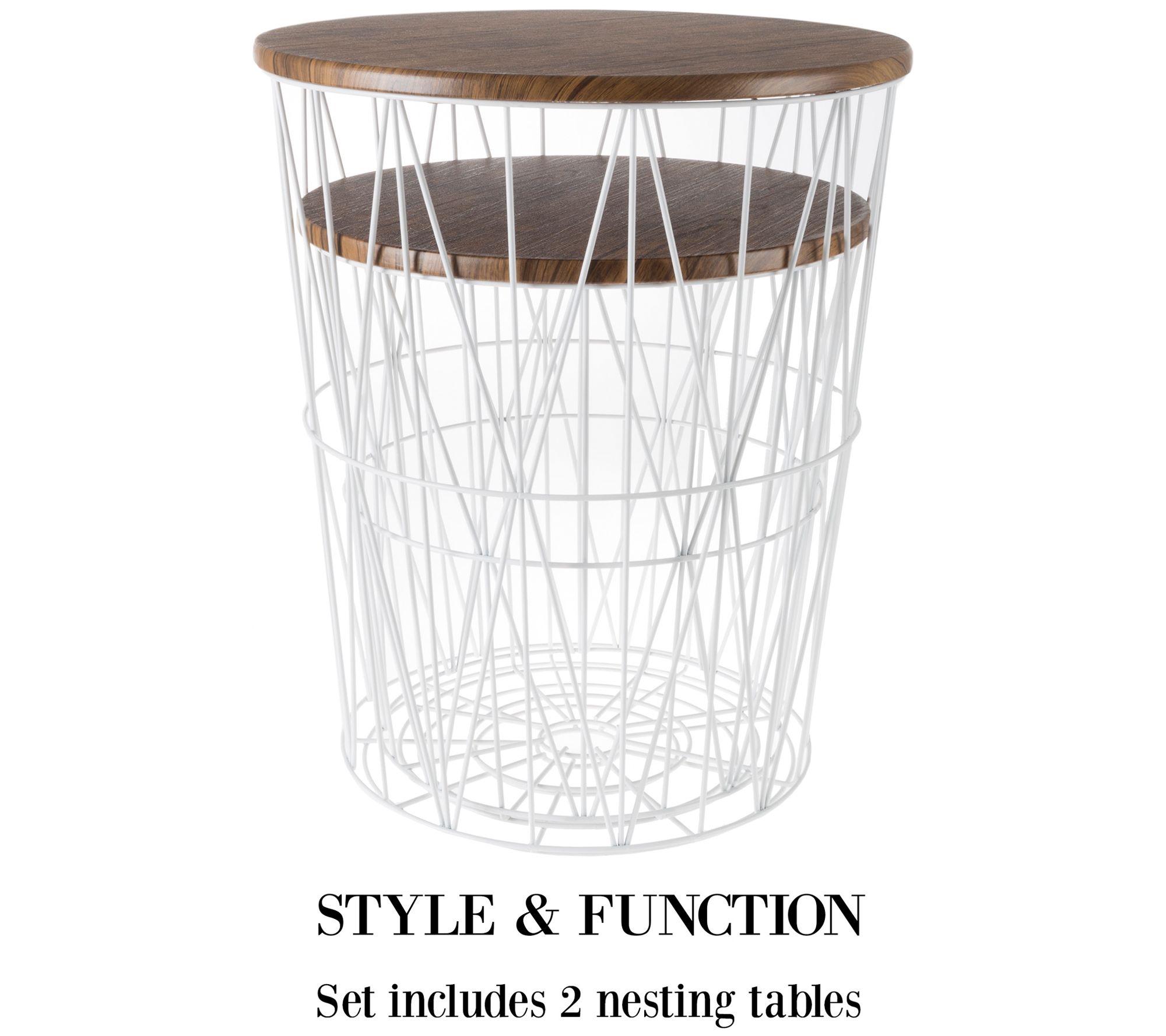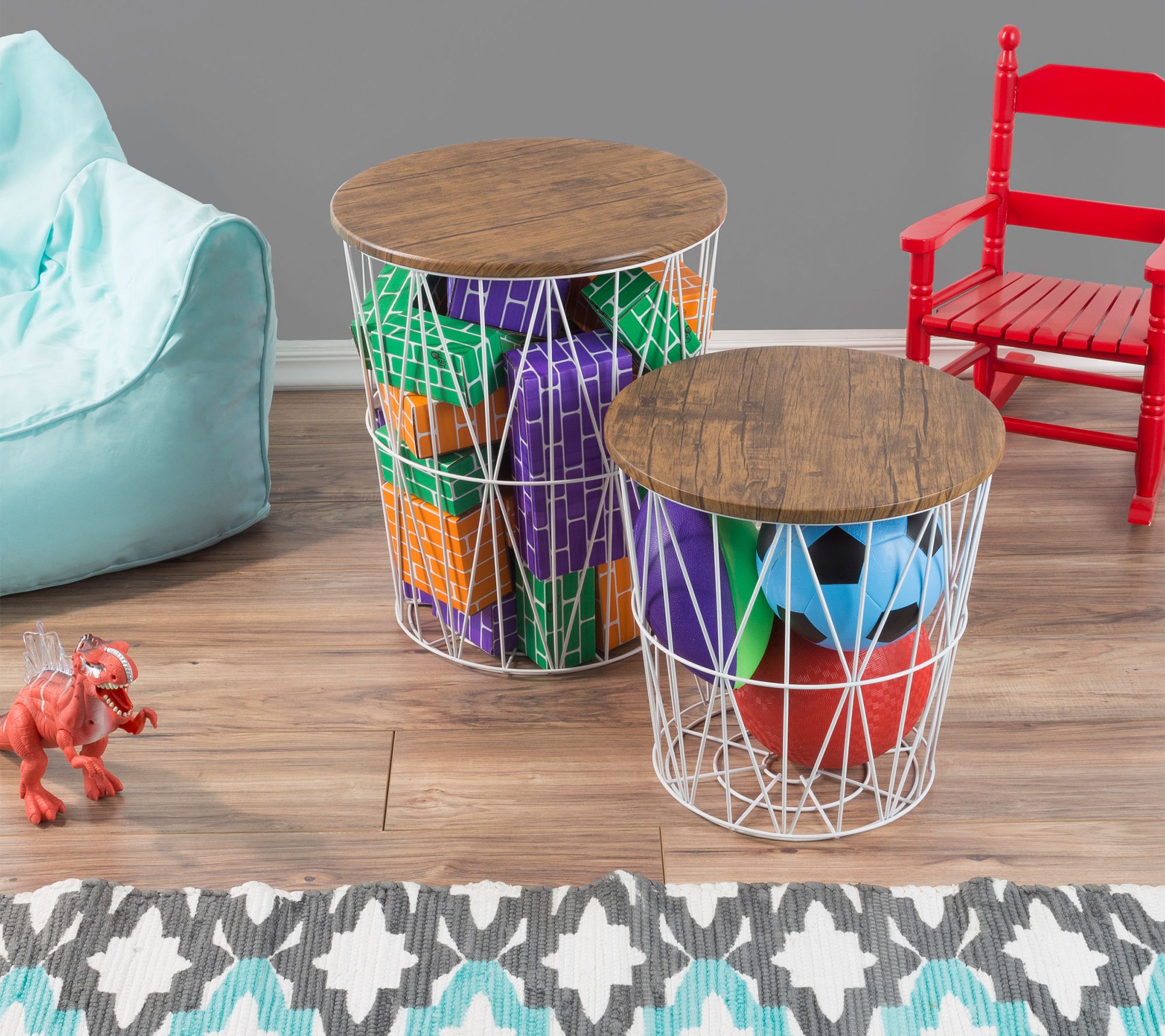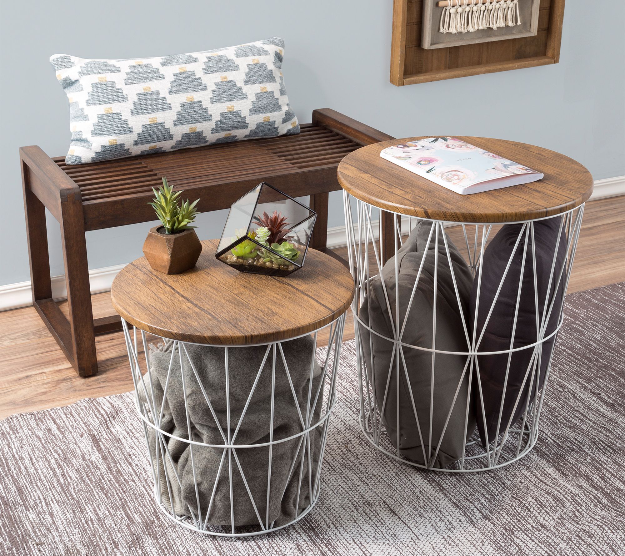 Make the most of your space by pairing practicality with decoration, like these metal and wood accent tables that double as storage baskets. From Lavish Home.