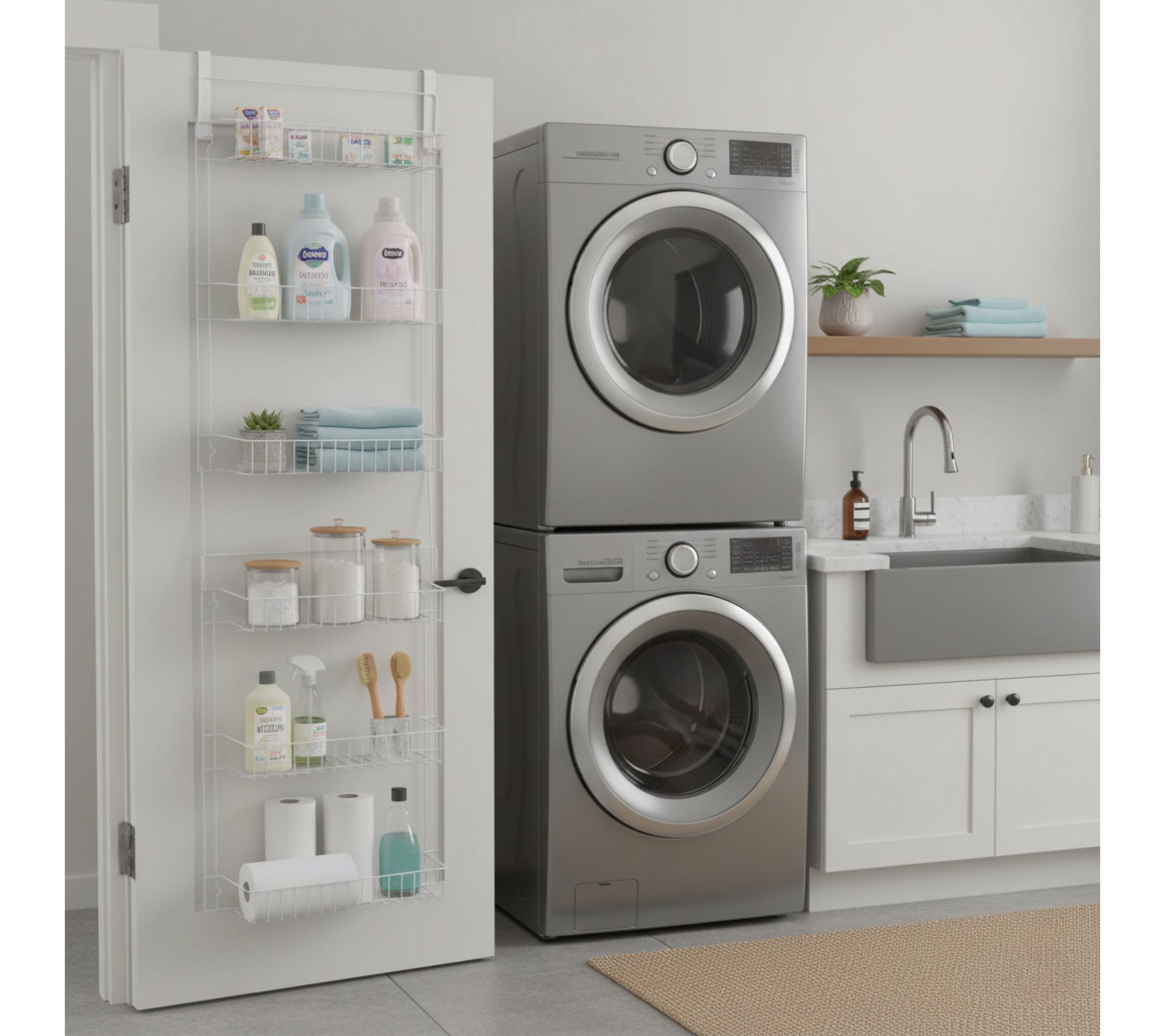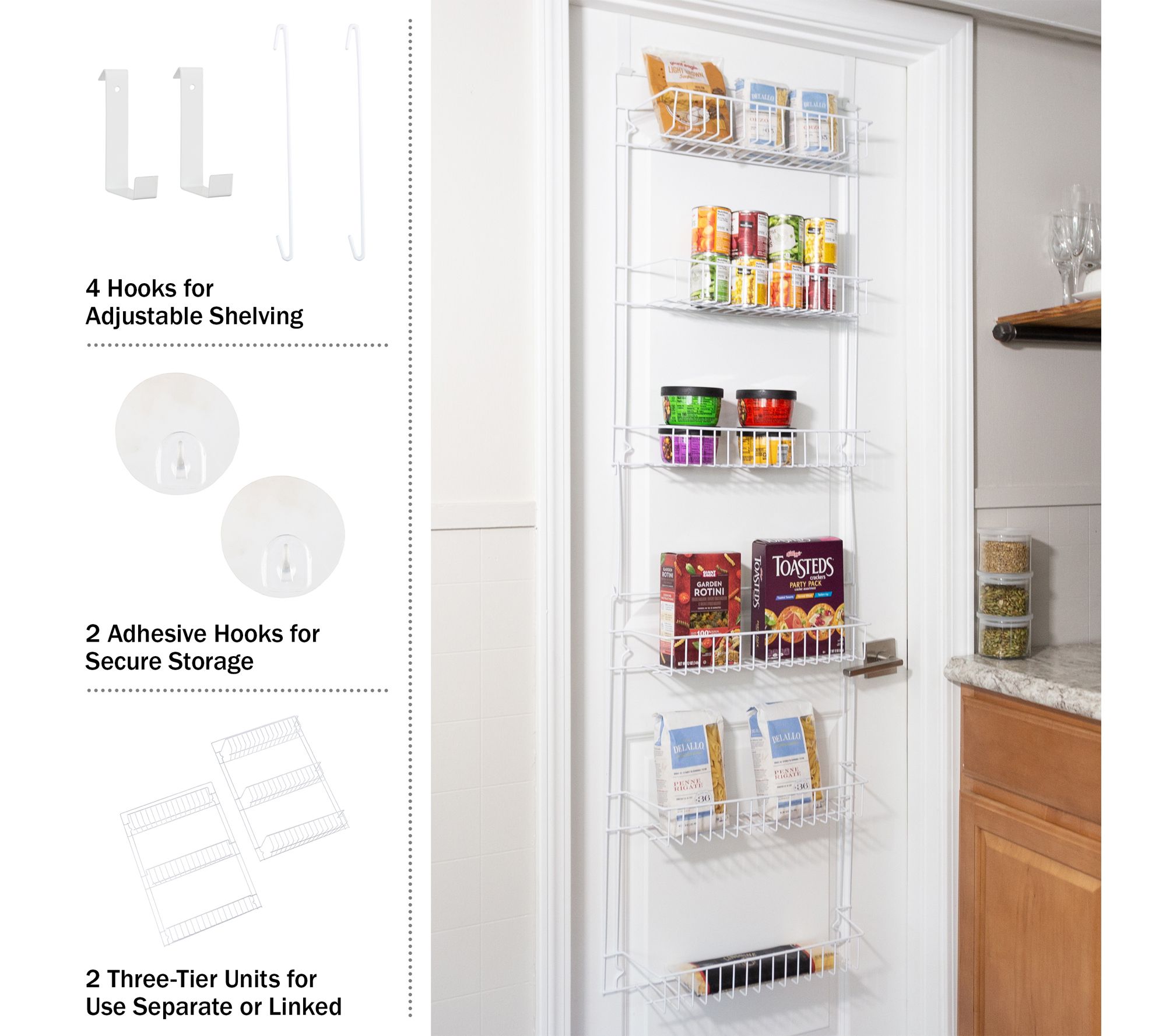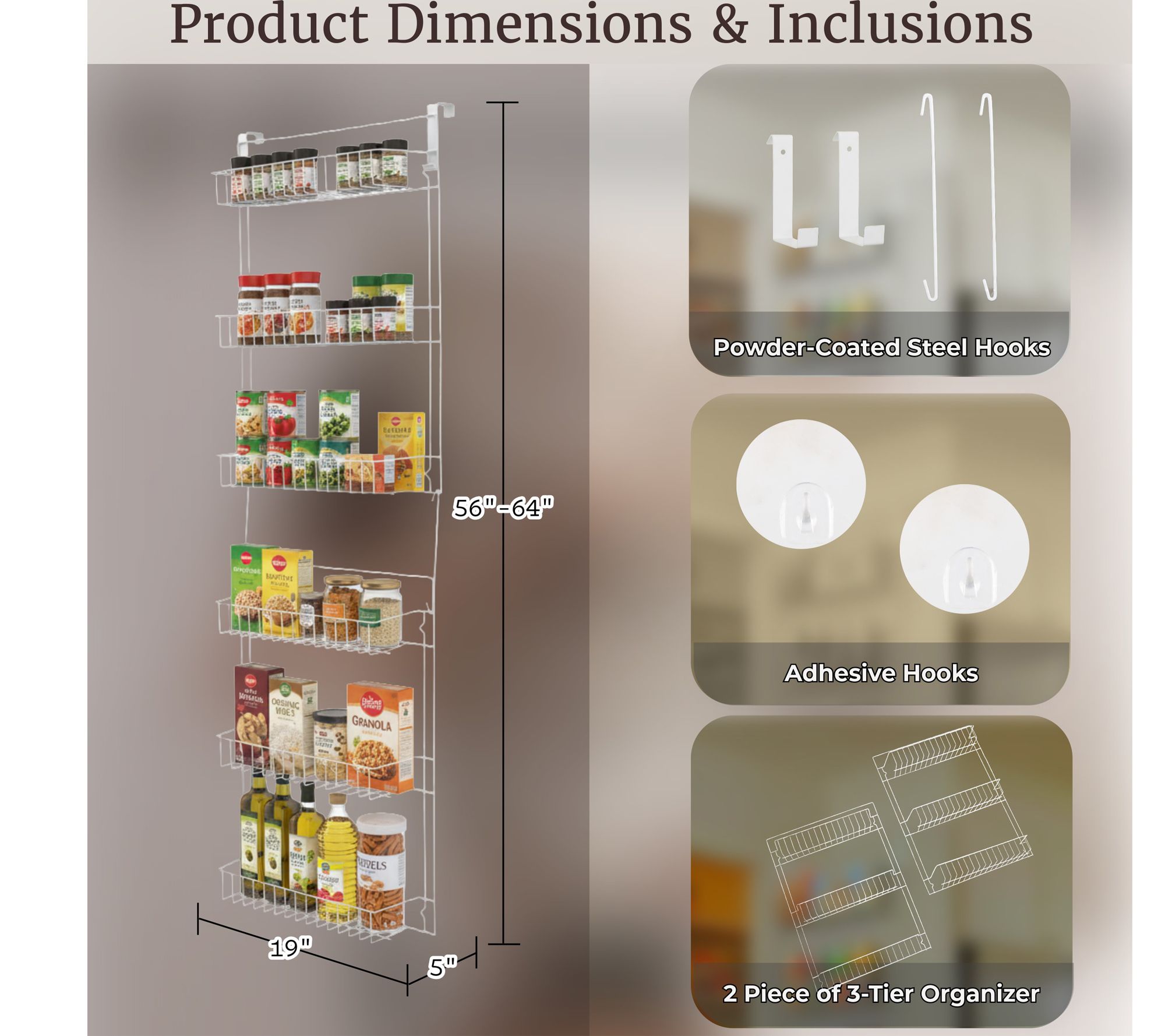 • Includes door organizer, 4 hanging hooks, and adhesive hooks