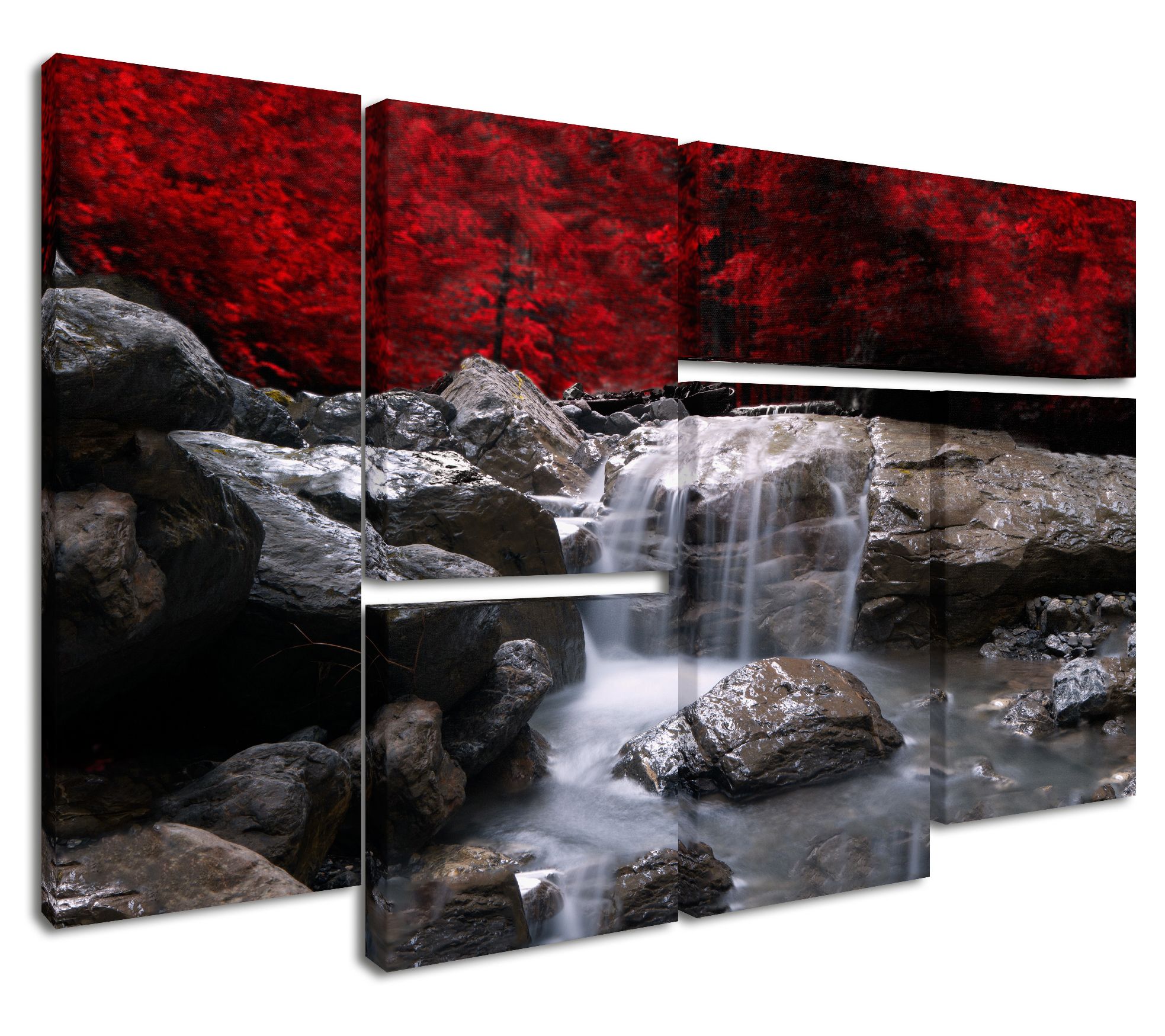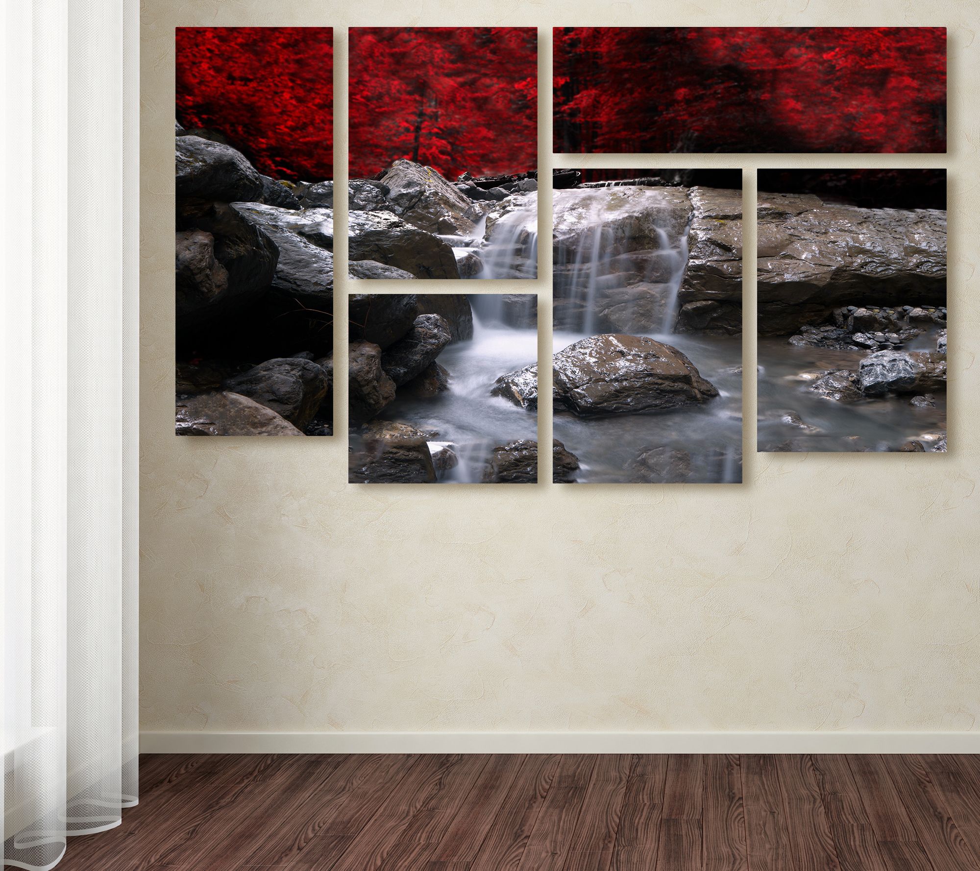 Create a fabulous focal point in any room with this six-piece print of a small waterfall surrounded by red foliage by photographer Philippe Sainte-Laudy. From Lavish Home.