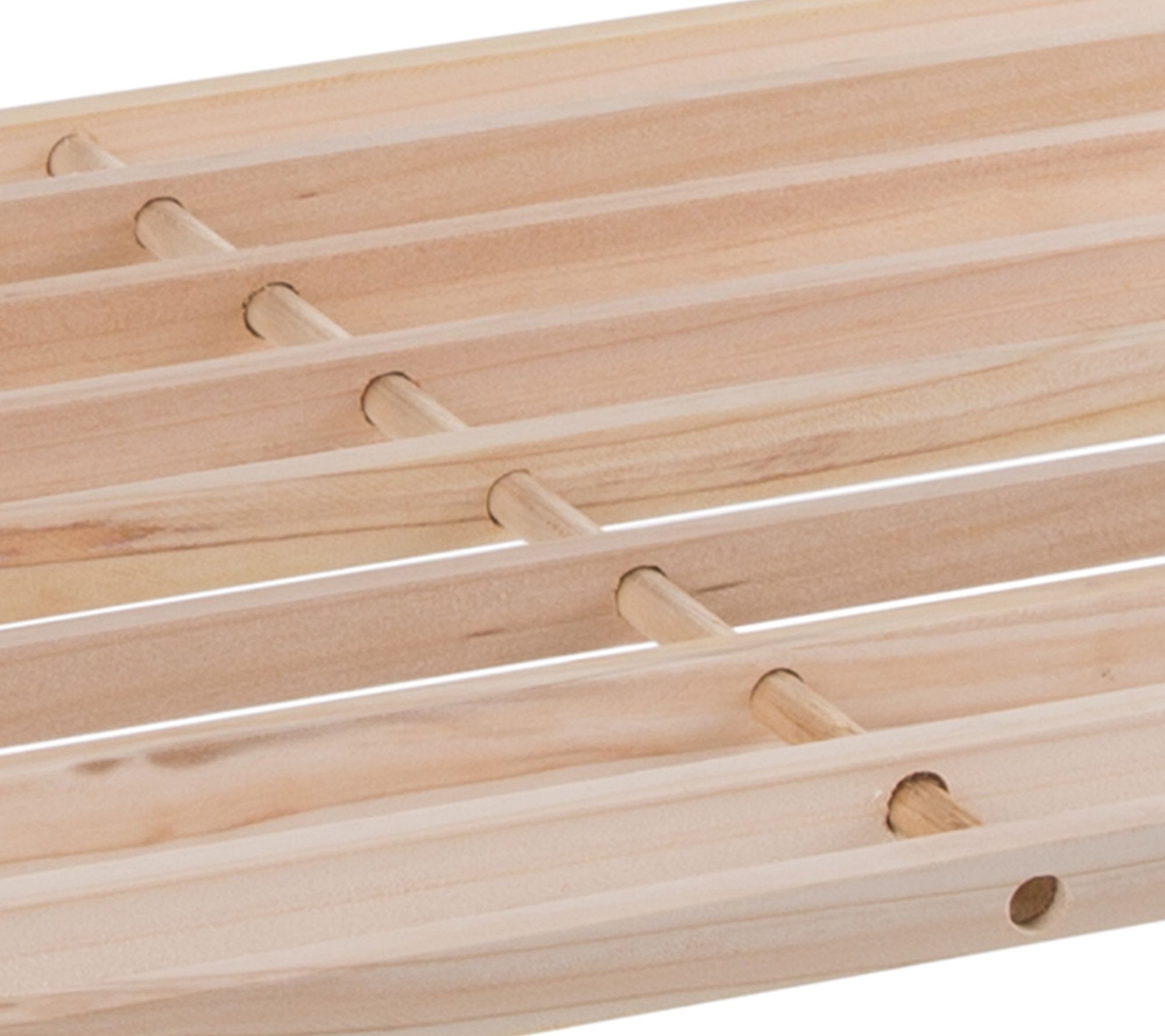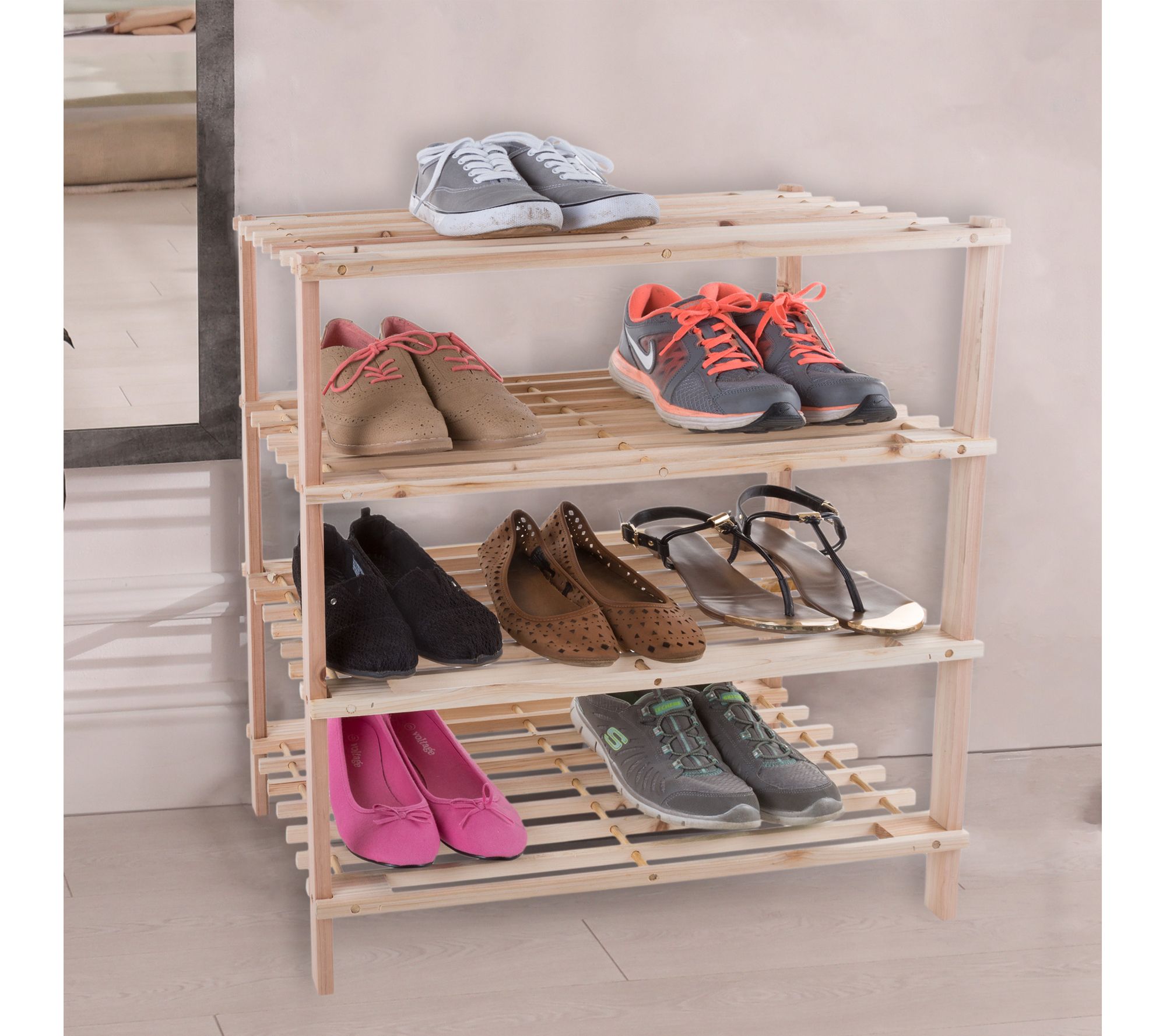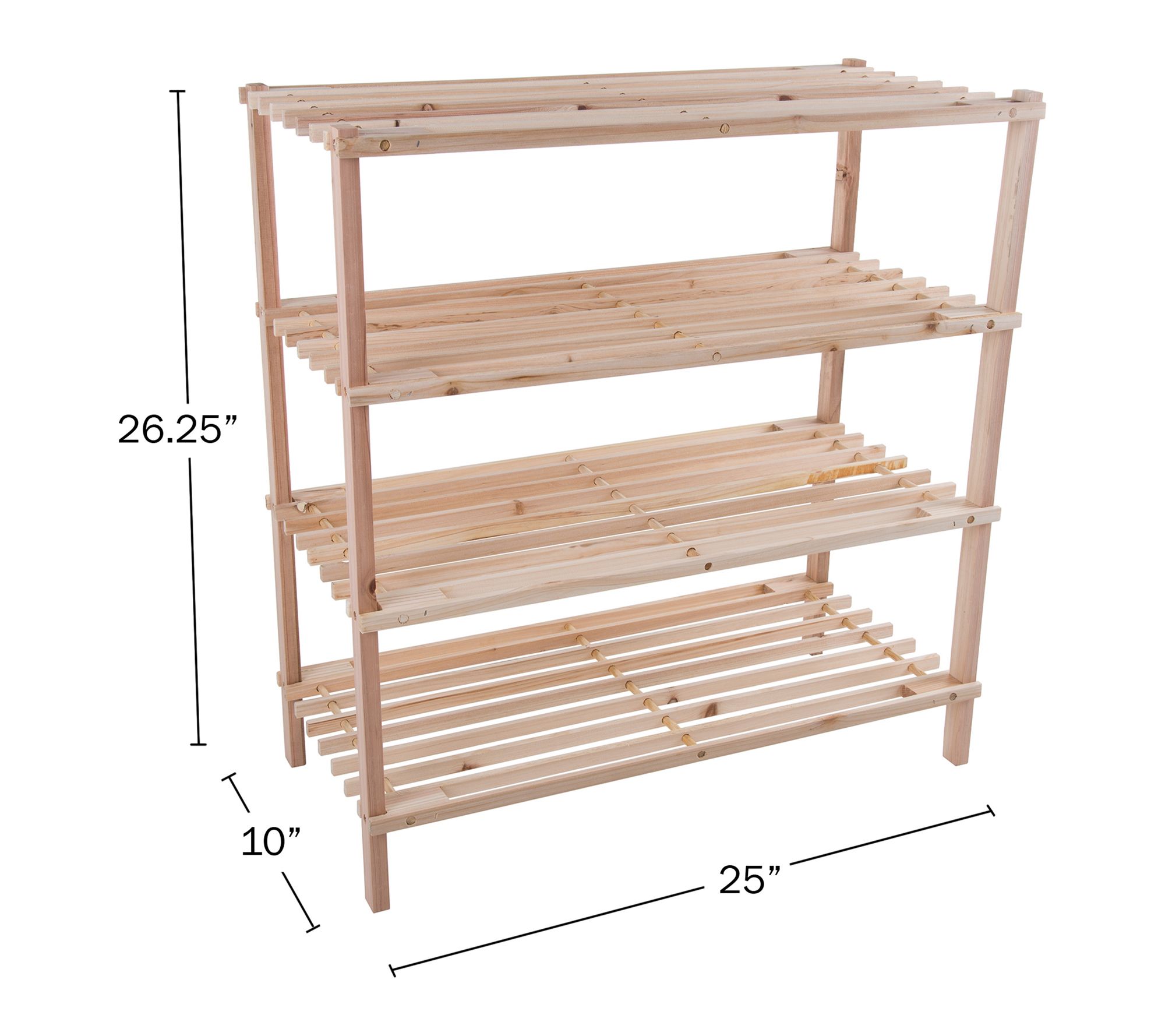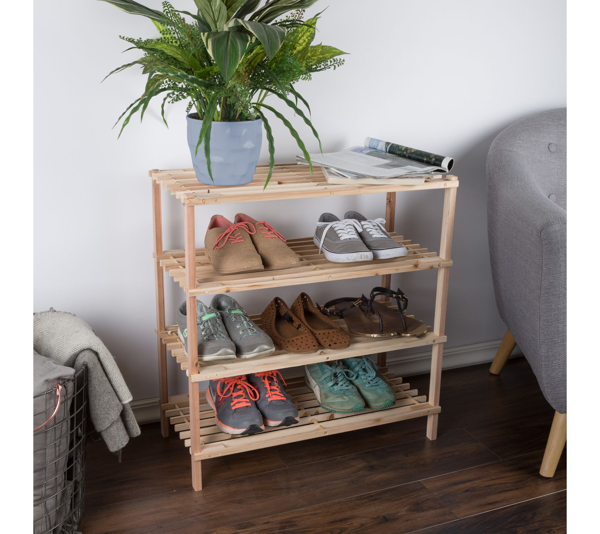 • Four-tier design; holds about 12 pairs of shoes; slatted shelves for ventilation and drainage; compact, space-saving construction