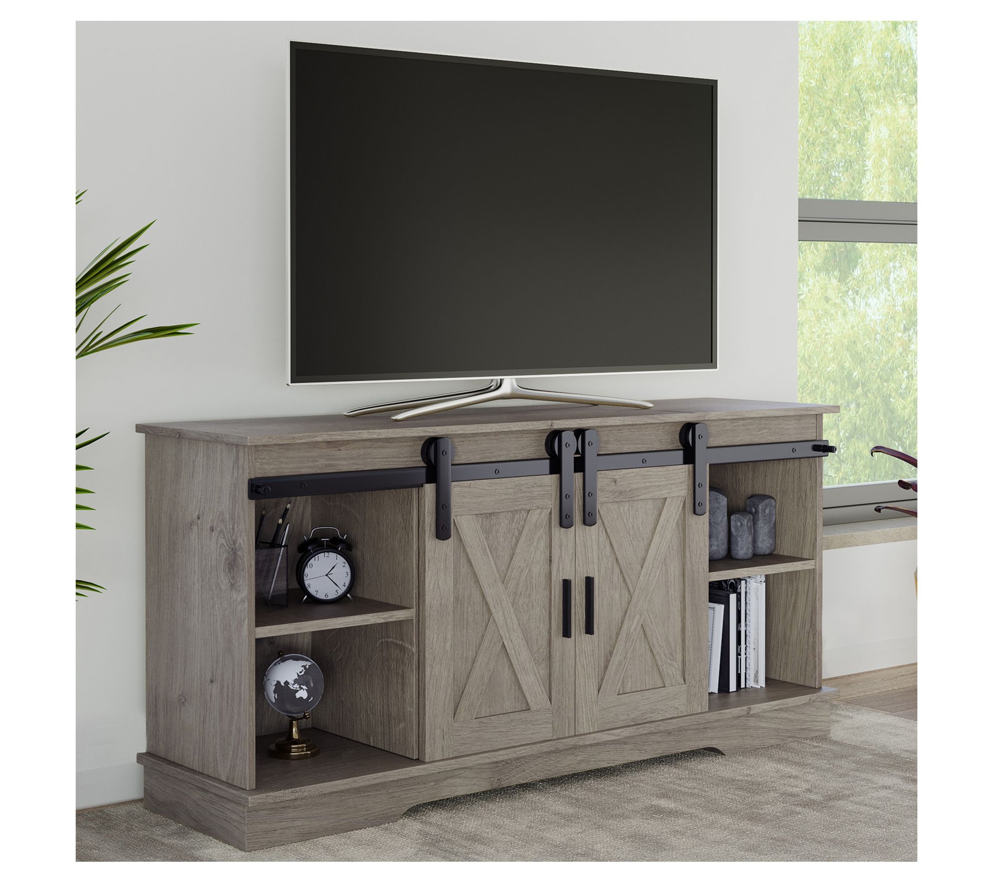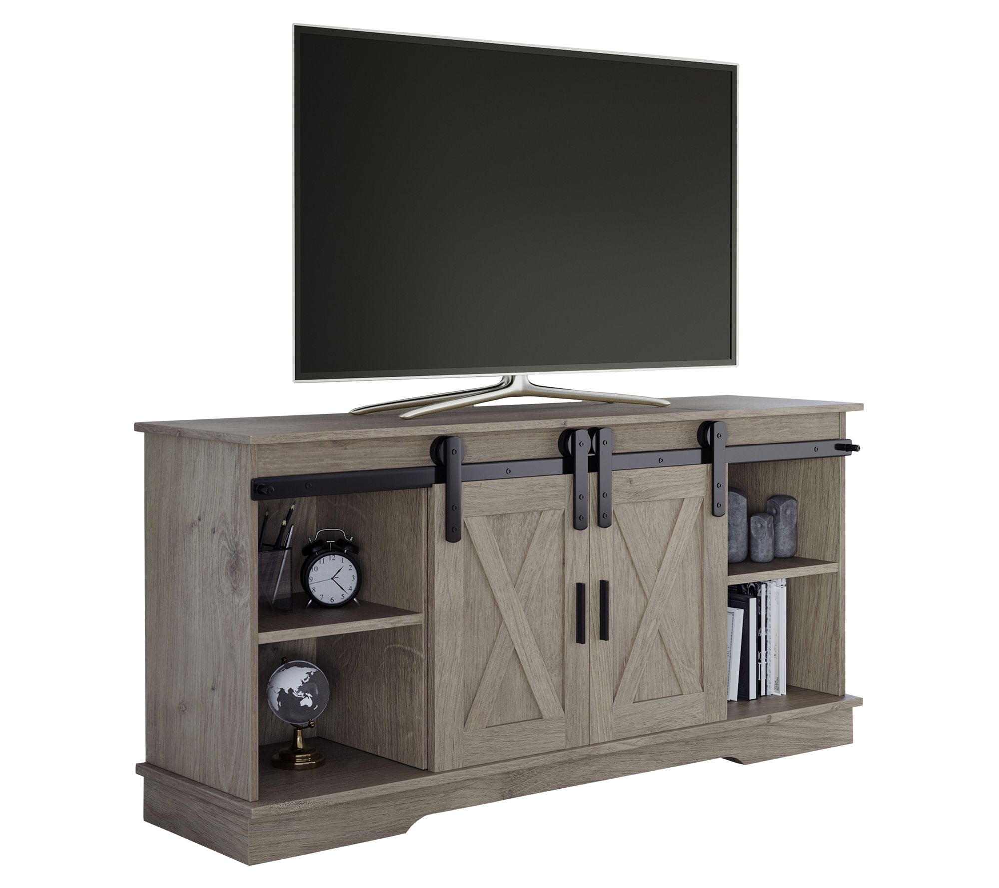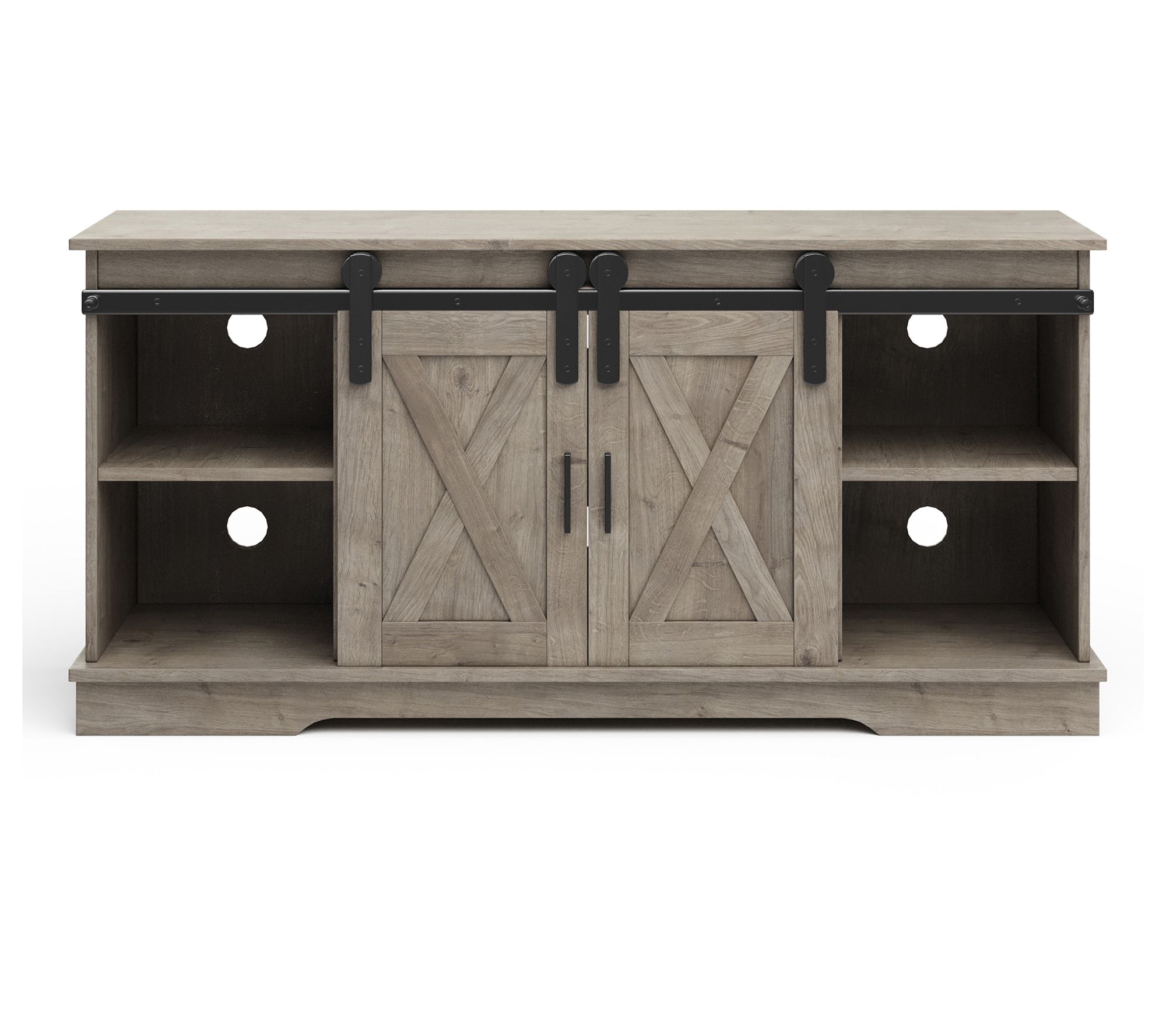 Give your home a rustic upgrade with this entertainment center faced with a sliding barn door design that saves space in smaller living rooms. From Lavish Home.