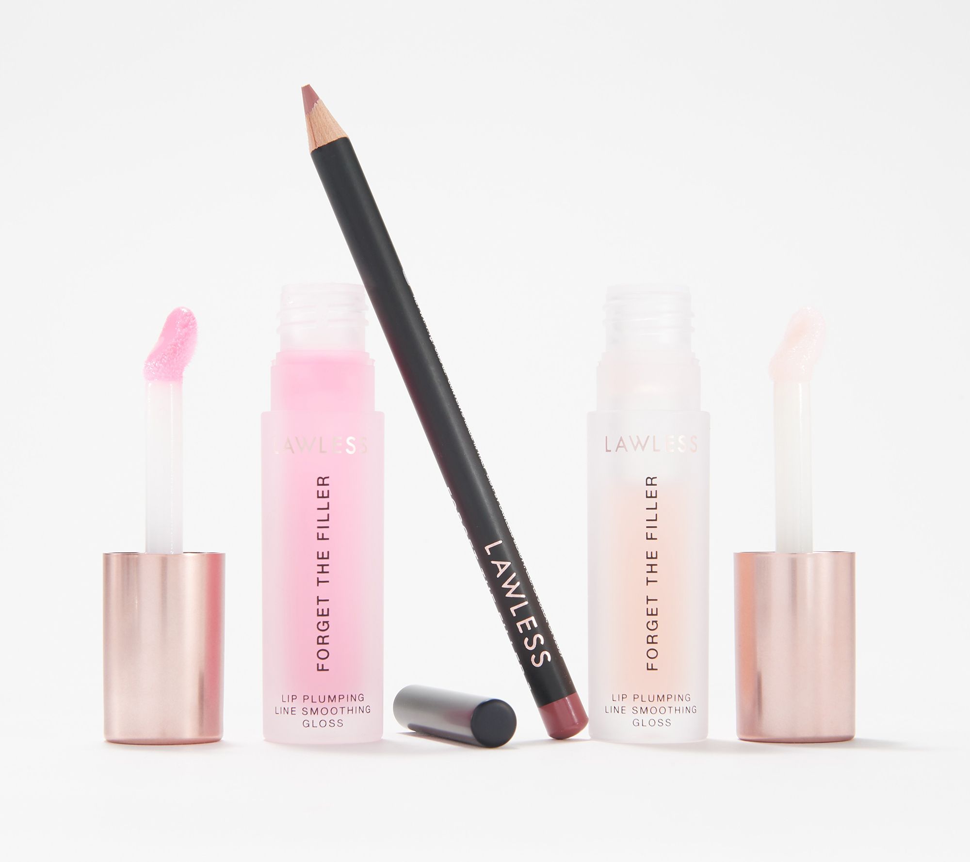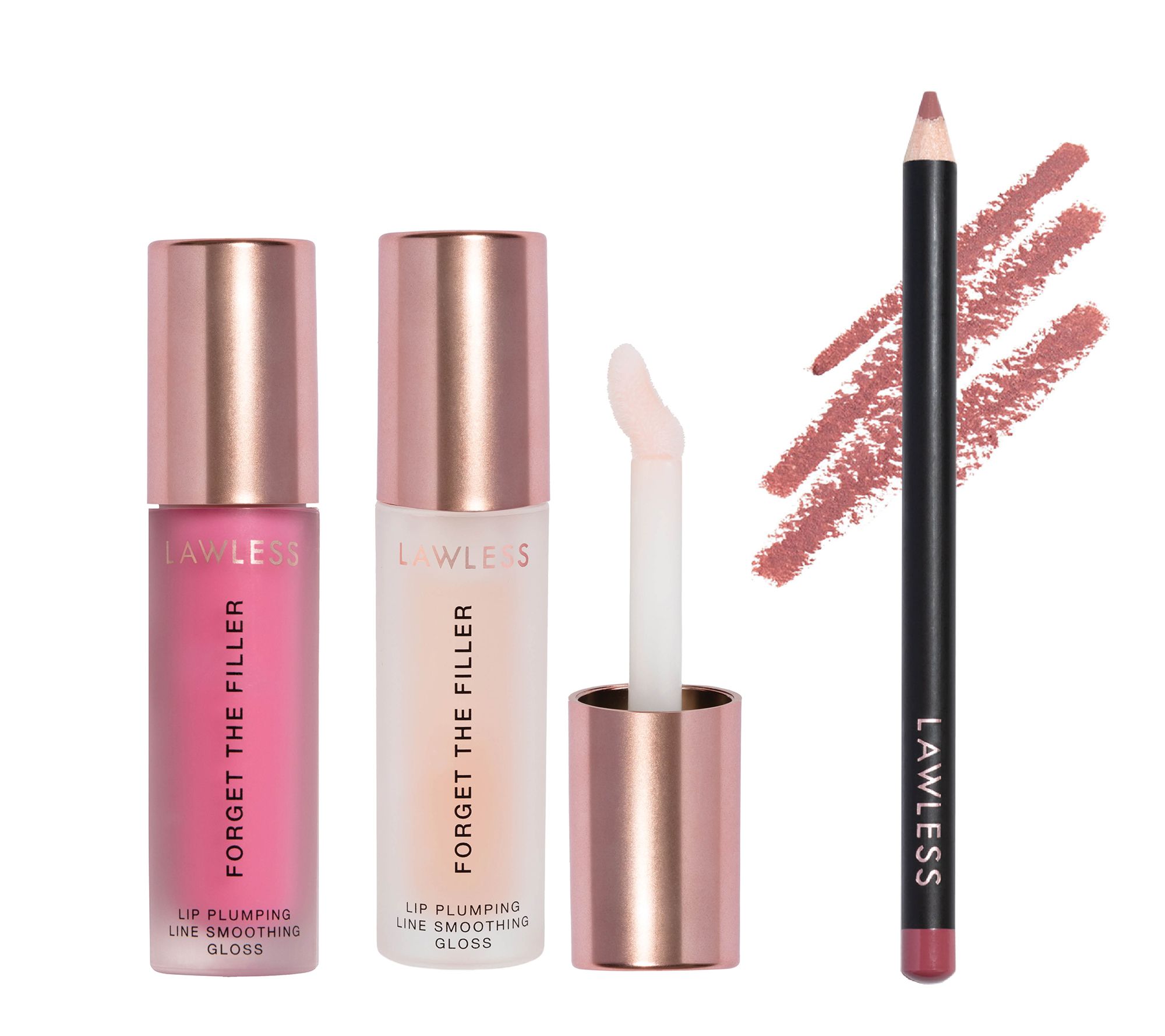 Includes 0.11-oz Forget the Filler Lip Plumper Line Smoothing Gloss in Rosy Outlook, a super-sheer baby pink shade, 0.11-oz Forget the Filler Lip Plumper Line Smoothing Gloss in Daisy Pink, a sheer creamy baby pink shade, and 0.04-oz Forget the Filler Definer Liner in choice of Pink Sand, a pinky nude shade or Honey Rose, a dusty rose shade