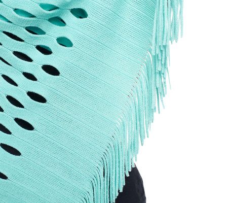 • 1960s-inspired, geometric, open-oval pattern; fringe; Marvelush yarn; lightweight design; can be worn multiple ways