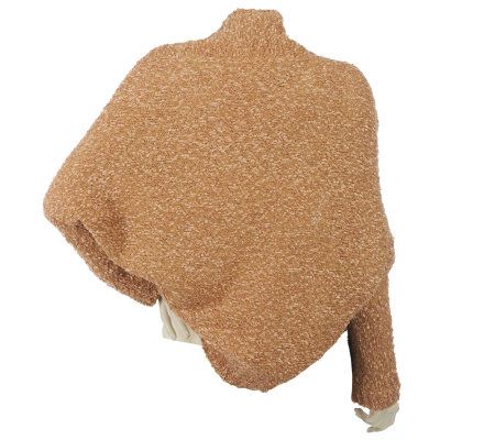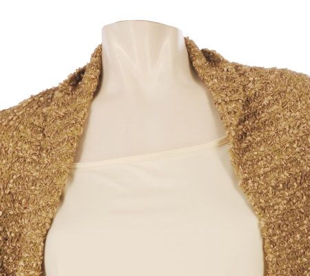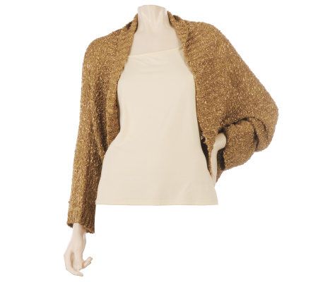 The cold shoulder? Not a possibility with this ribbon yarn shrug in your fashion repertoire. An ideal topper for your favorite dress or cami, it has a soft, nubby texture and a shimmering sheen. From Layers by Lizden.
