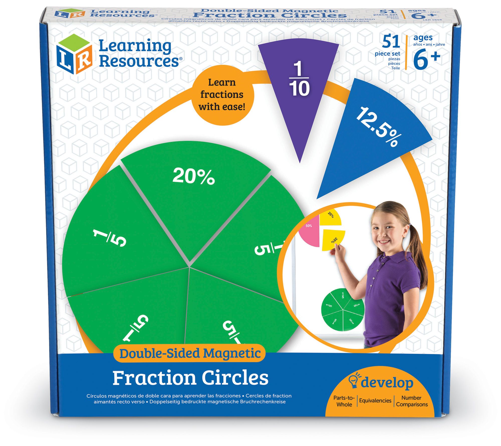 Math will be a breeze when you demonstrate fractions, percentages, and equivalencies to your little learner with this set of double-sided magnetic circles. From Learning Resources.