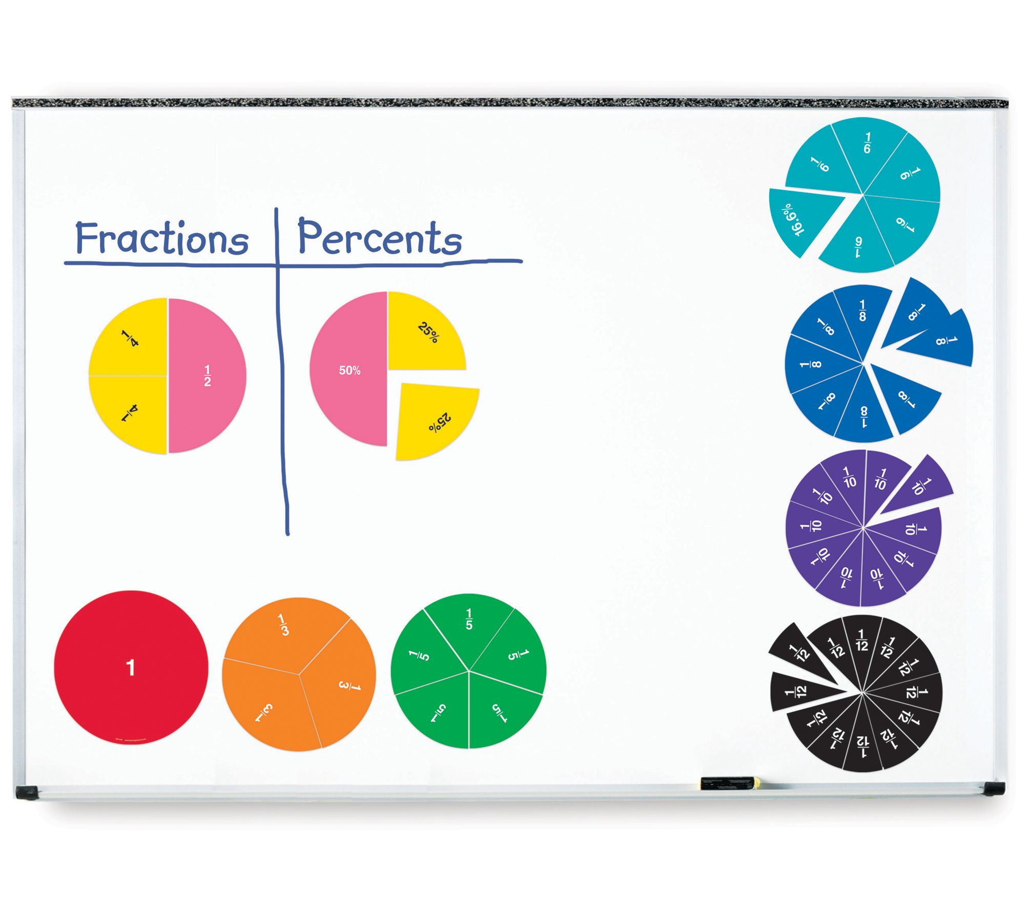 • Includes nine circles: one, 1/2, 1/3, 1/4, 1/5, 1/6, 1/8, 1/10, 1/12 and an activity guide