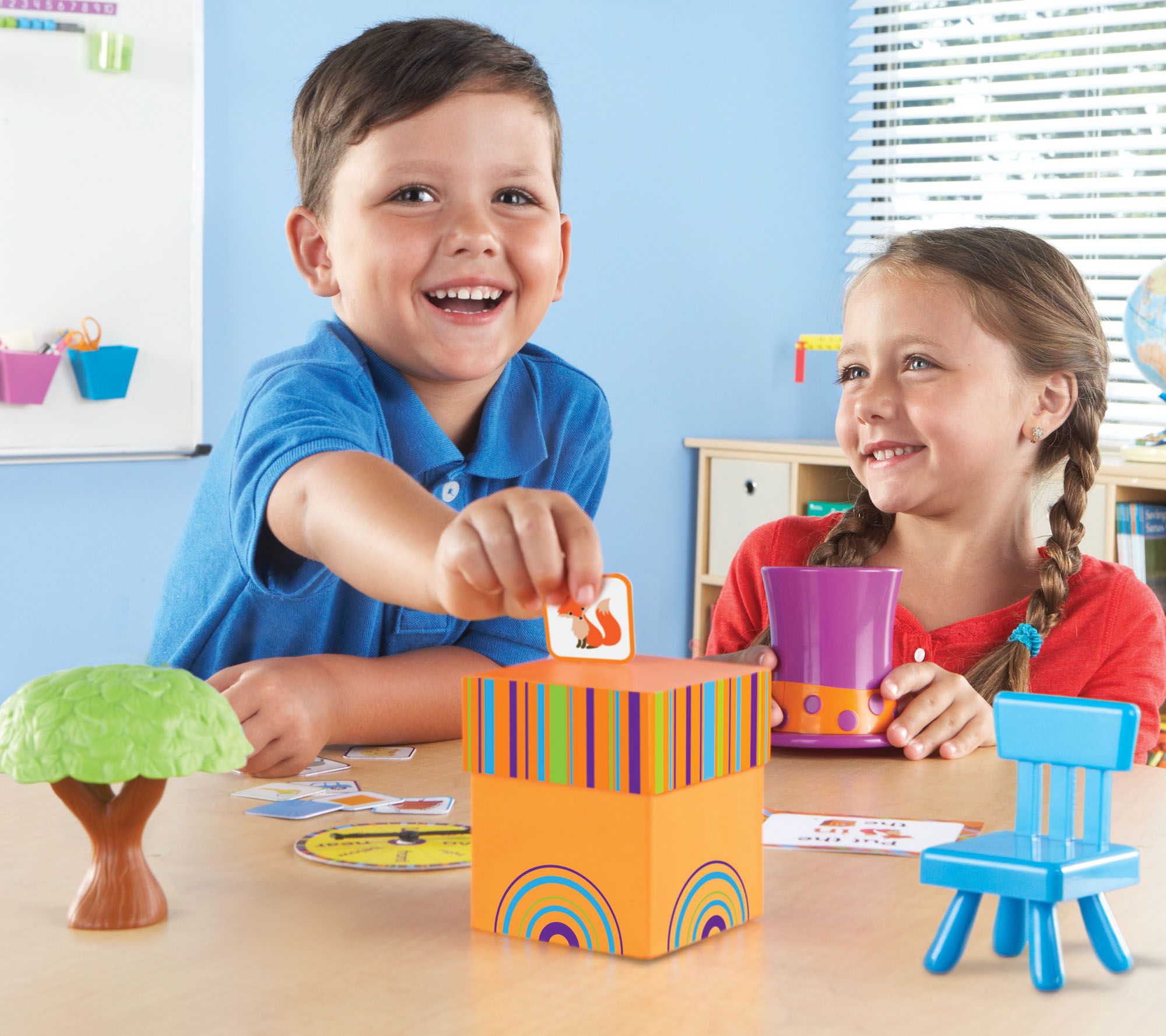 • Includes hat, box, tree, chair, 16 picture cards, 20 activity cards, double-sided spinner, and guide