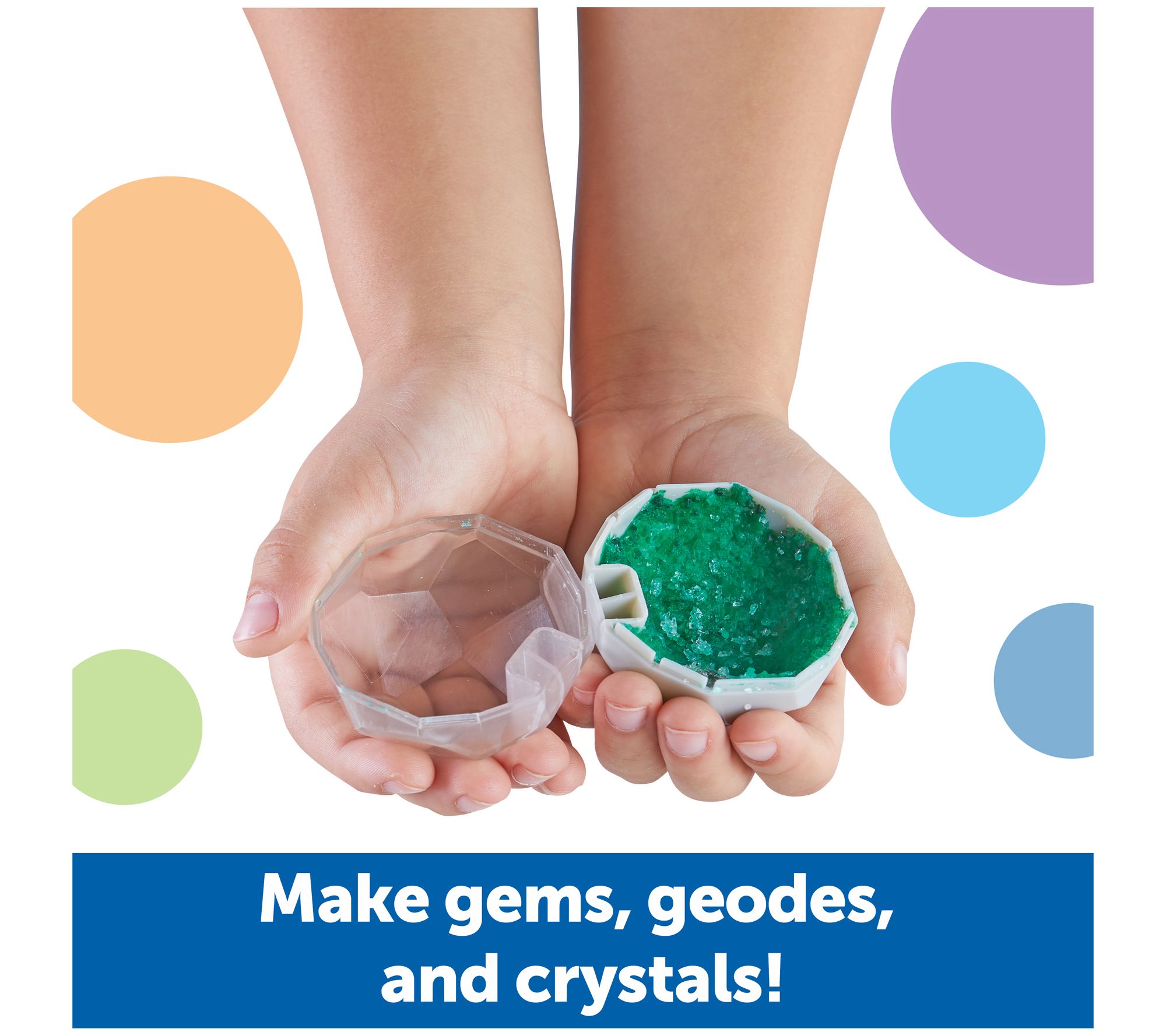 • Includes two grow chambers, two experiment hooks, hammer, chisel, four gems, three stampers, four two-piece play geodes, beaker, magnifying glass, and experiment booklet