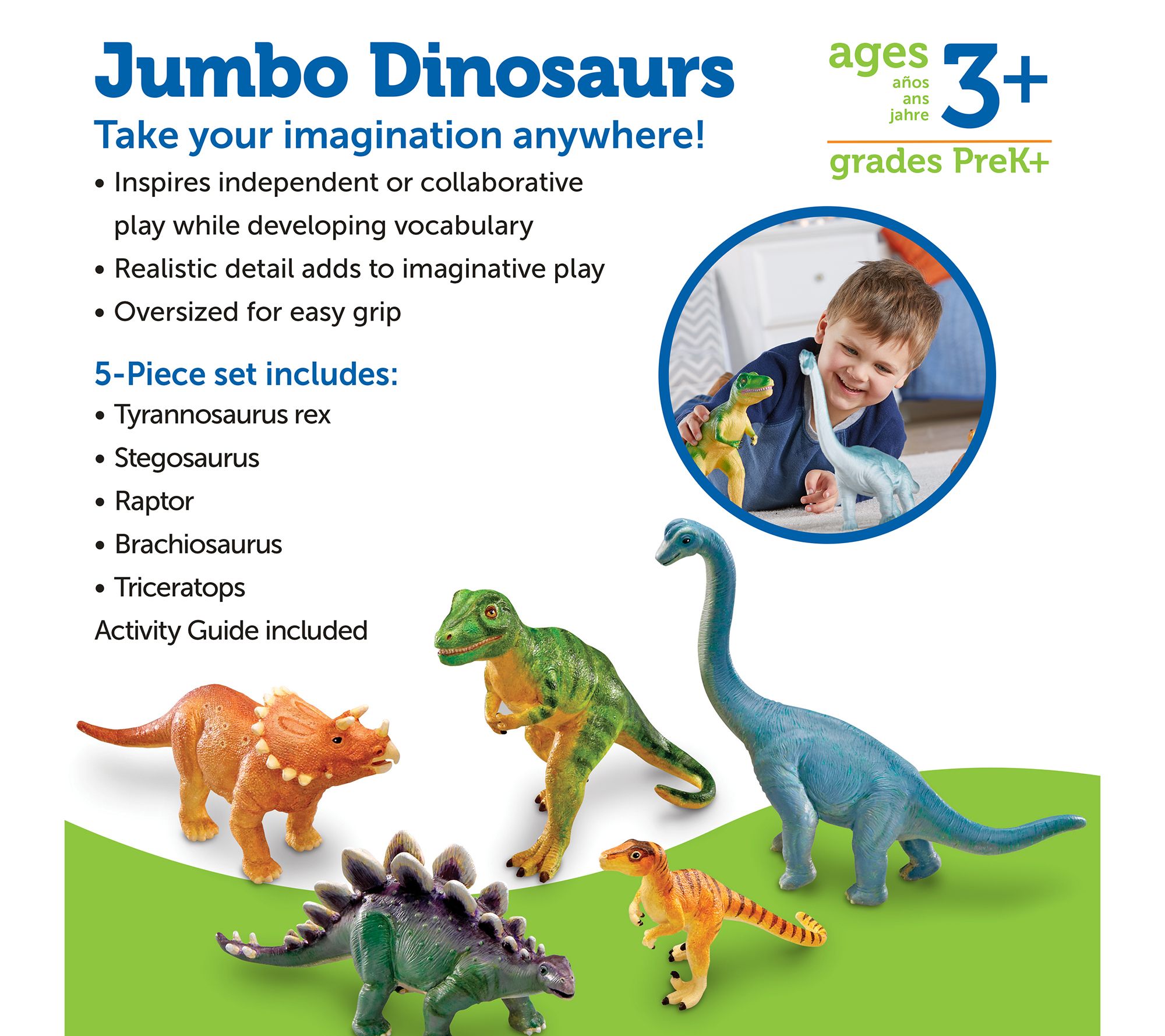 Dinosaurs may no longer roam the earth, but they can still inhabit your house with this jumbo set of toys by Learning Resources. Watch as they encourage kids' vocabulary development and invite imaginative play set in multiple eras. Durable plastic construction, sized just right for young hands, lets you wipe them clean when the dinos get dirty. From Learning Resources.
