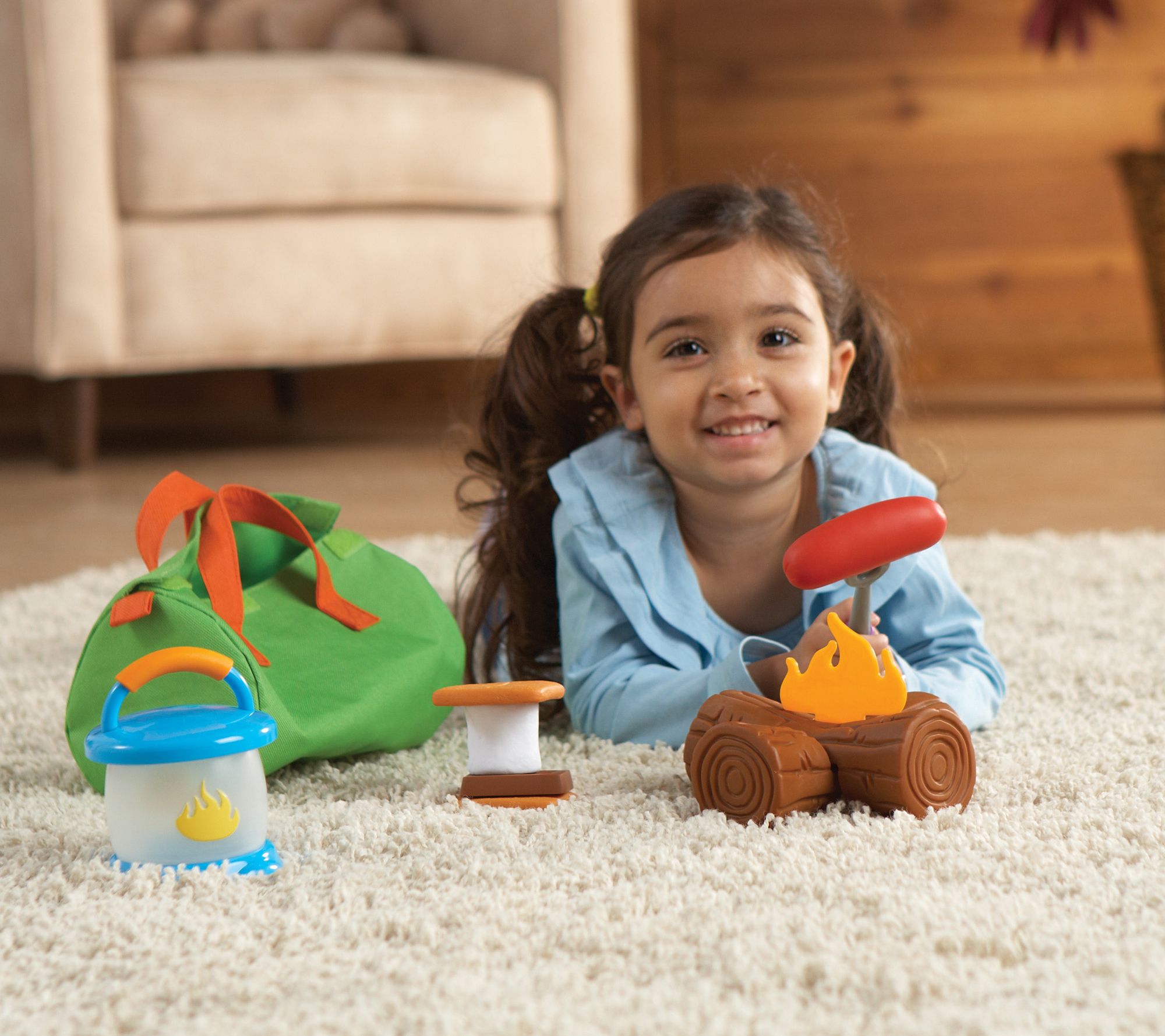 Gather 'round the campfire! This adventurous playset lets little ones build their very own log "fire" and roast a hot dog. And no campout would be complete without a yummy s'more. The glow-in-the-dark lantern adds fun day or night, and everything stores in a handy duffle bag. From Learning Resources.