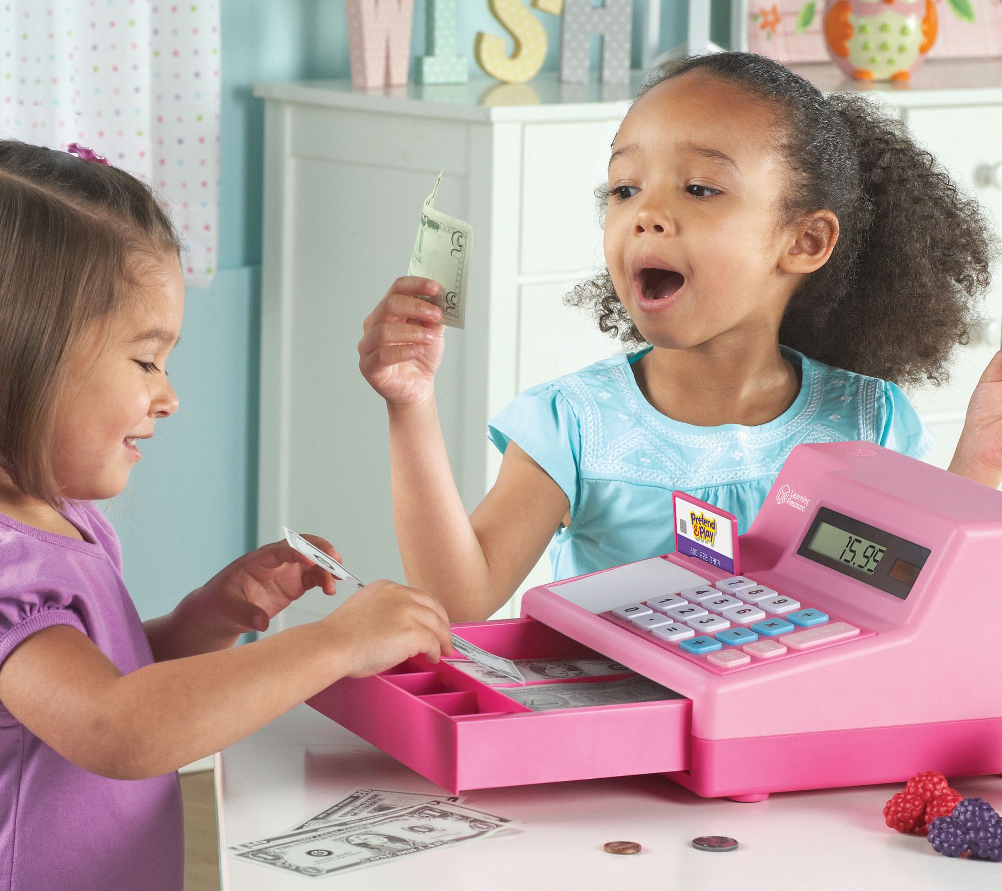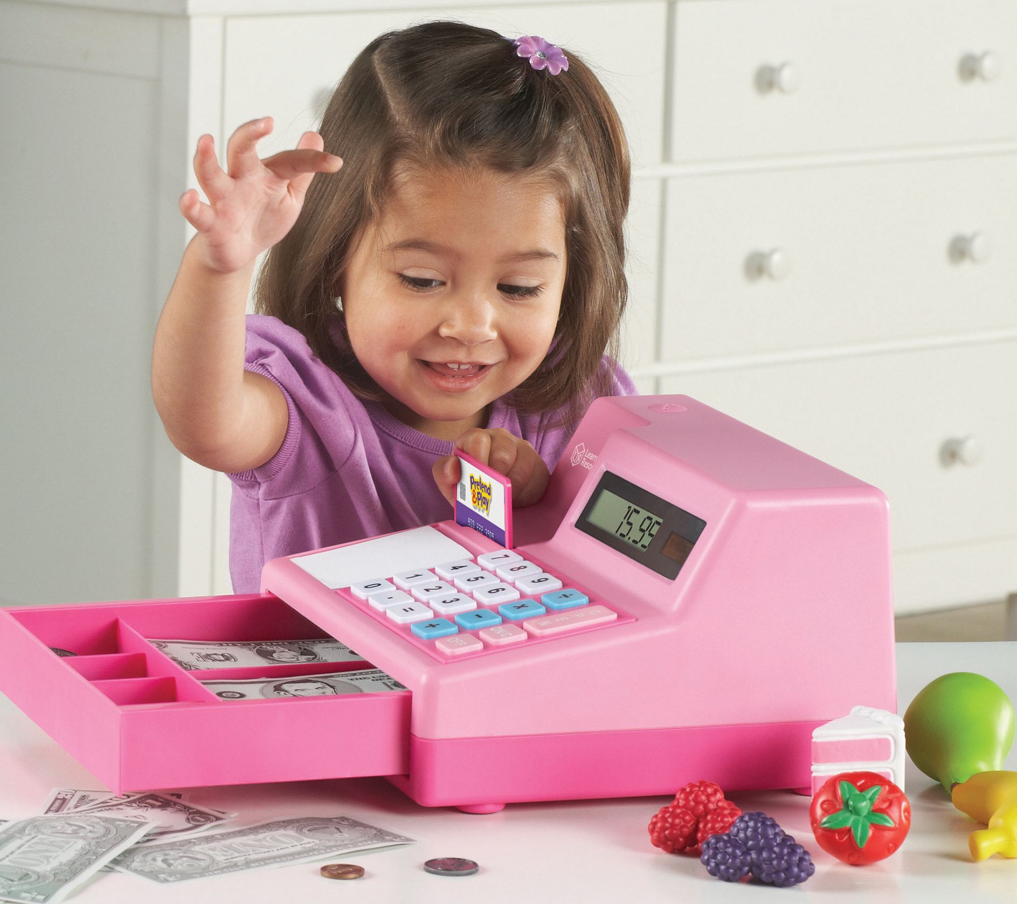 • Includes cash register with four built-in learning activities, life-size play money, credit cards, and coupons