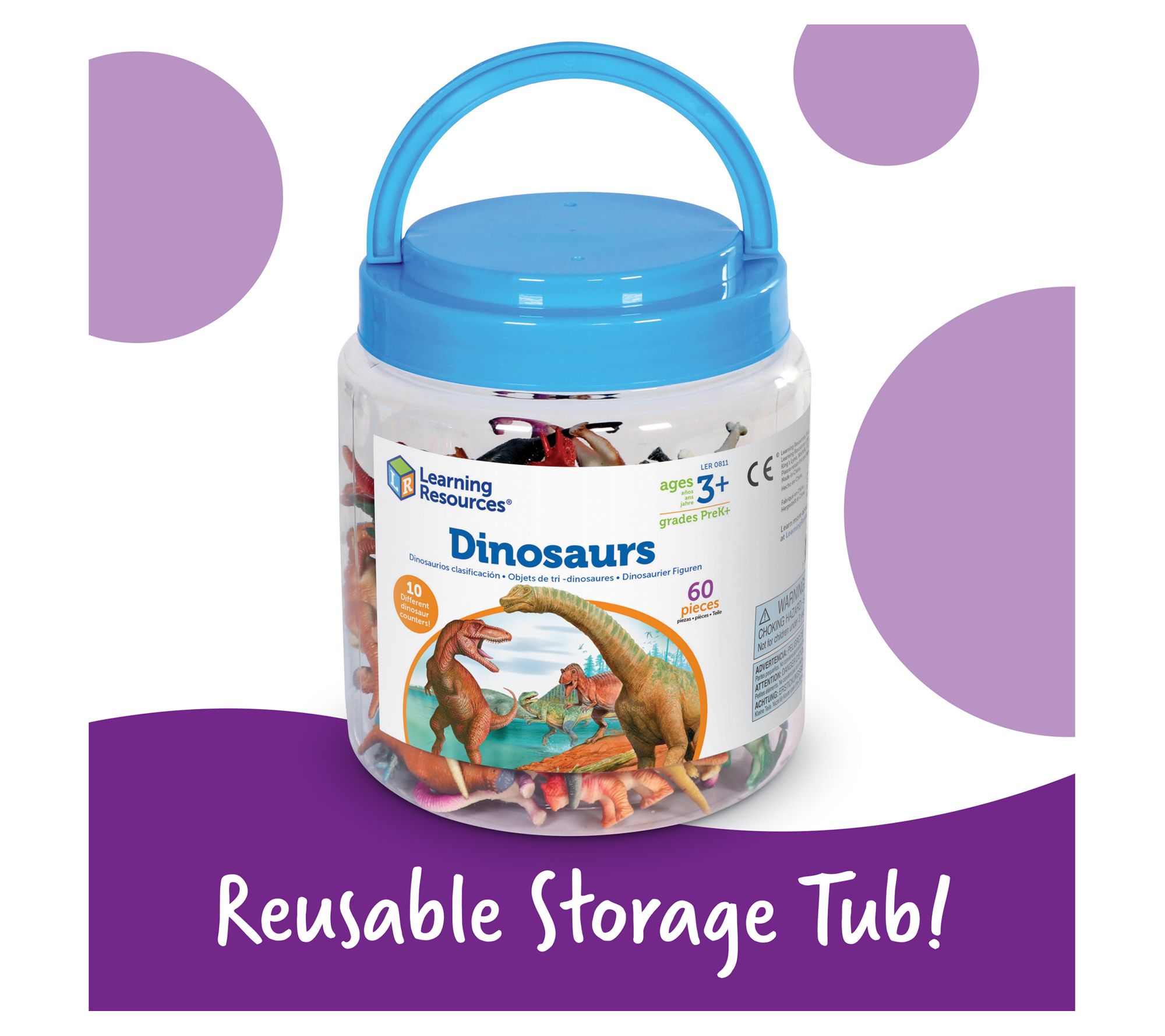 • Includes 60 dinosaur counters: six each of T. rex, Stegosaurus, Triceratops, Brachiosaurus, Parasaurolophus, Pachycephalosaurus, Spinosaurus, Struthiosaurus, Apatosaurus, and Velociraptor; and storage bucket