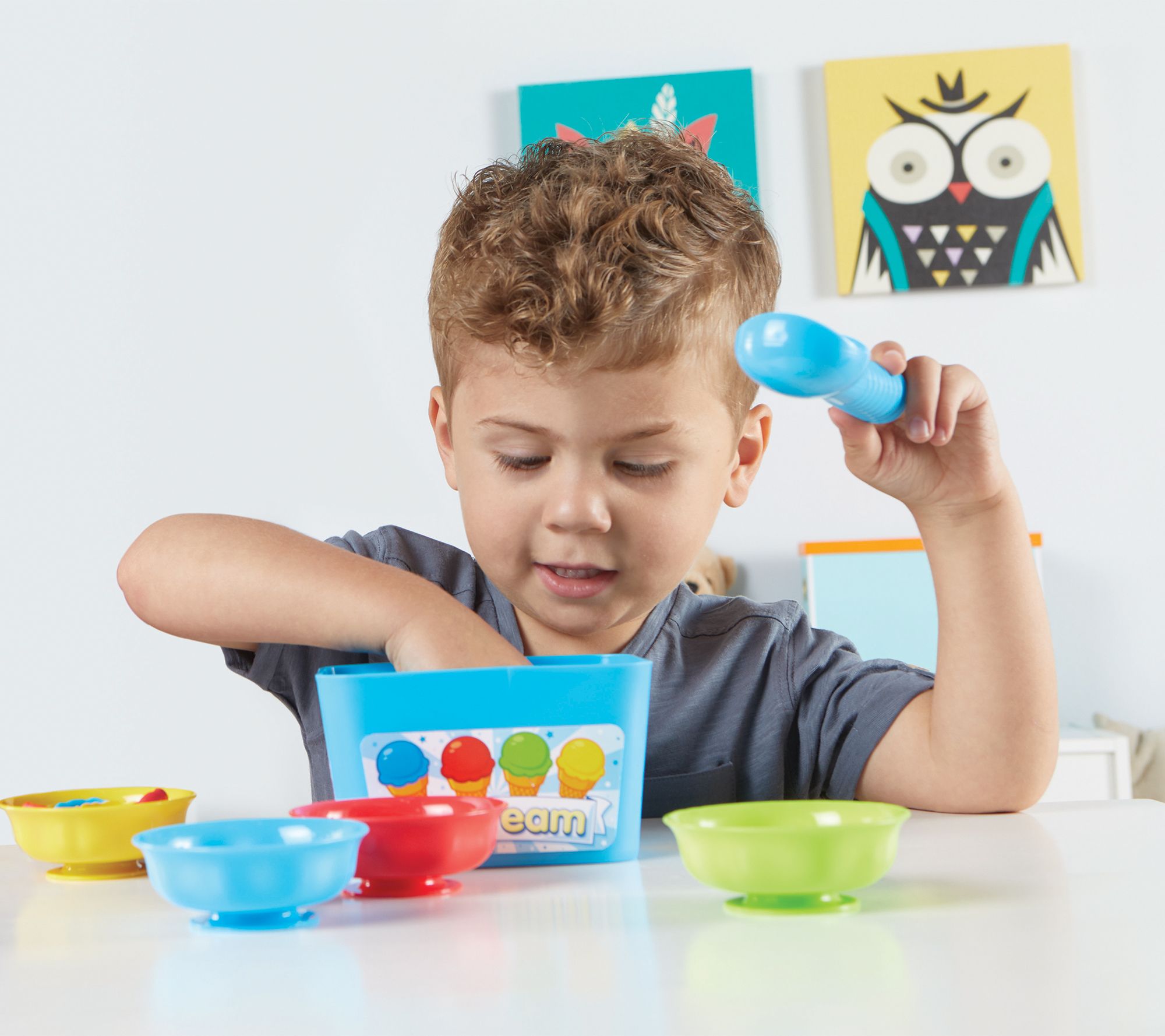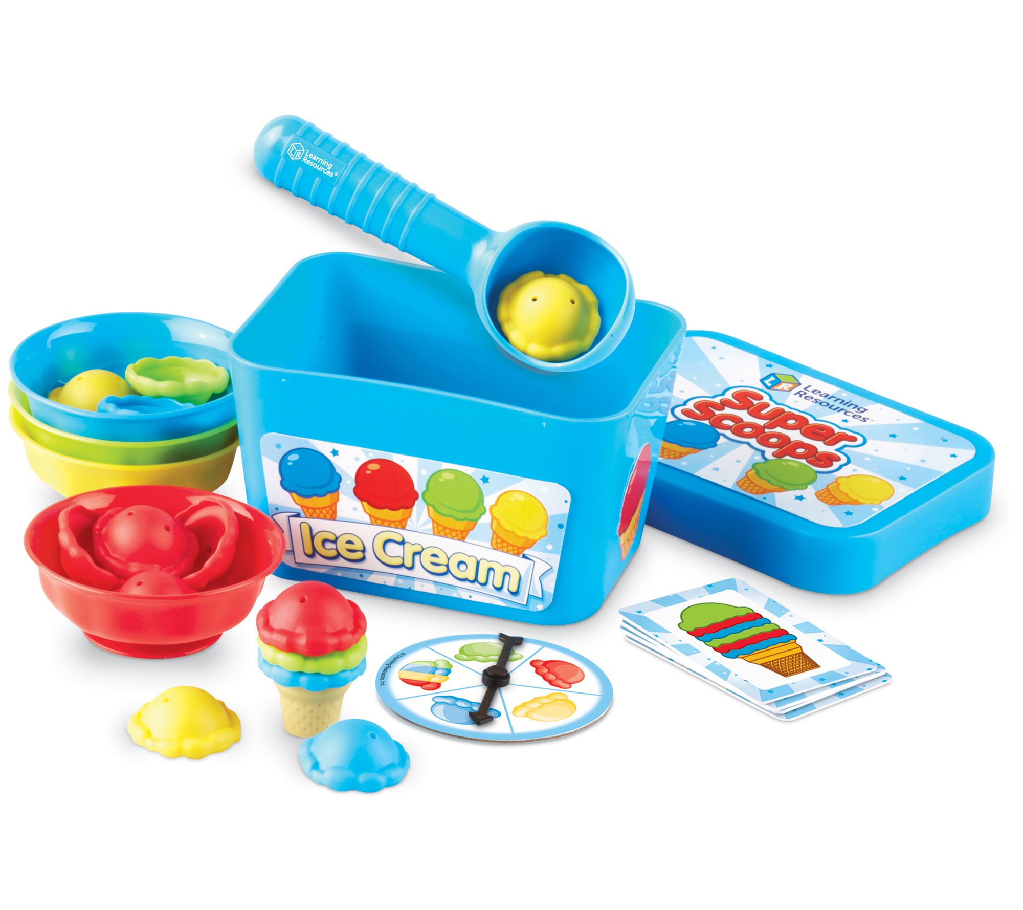 • Includes four bowls, four cones, 20 scoops (five of each color), 23 double-sided cards, ice cream scooper, spinner, and container with lid