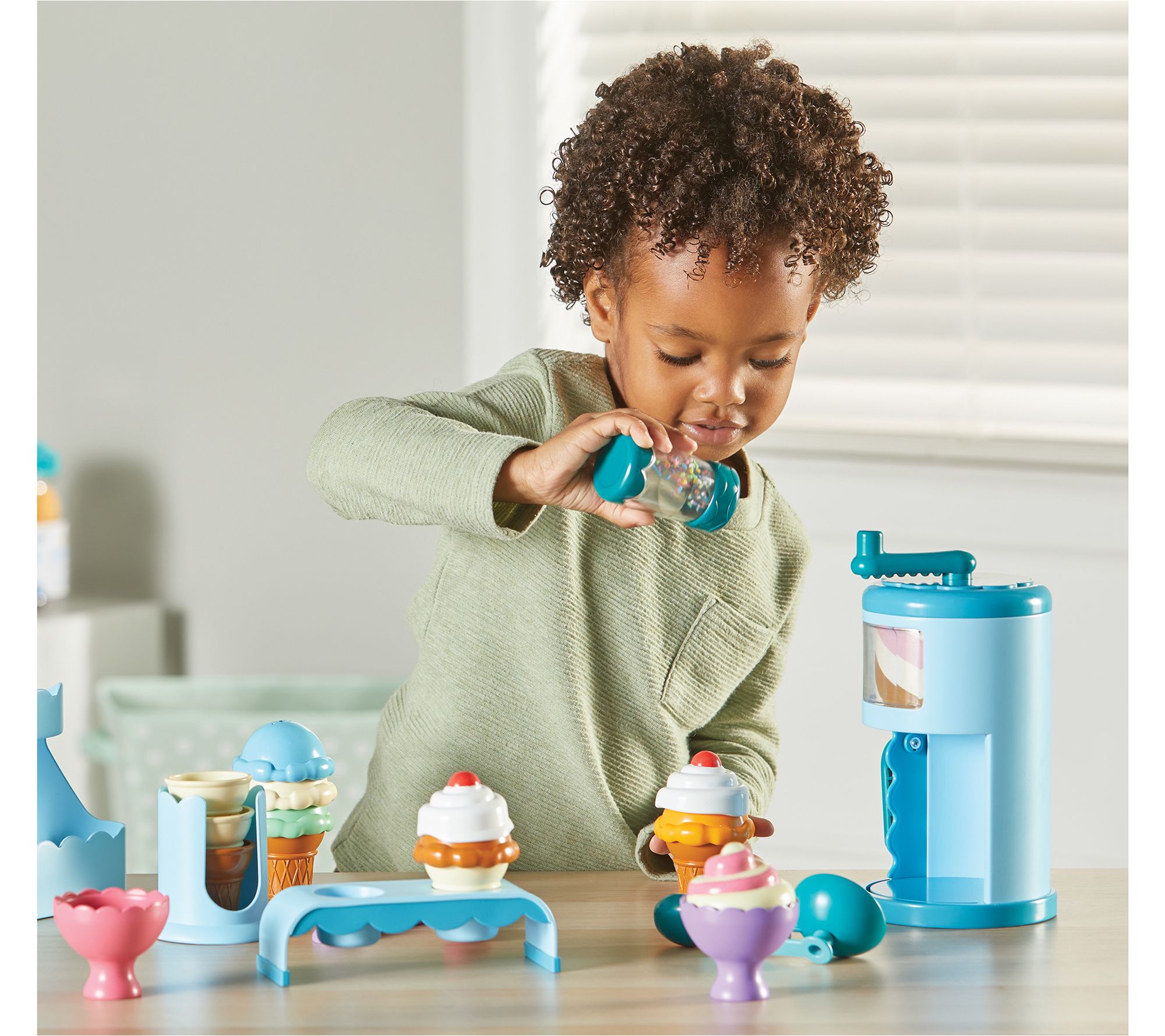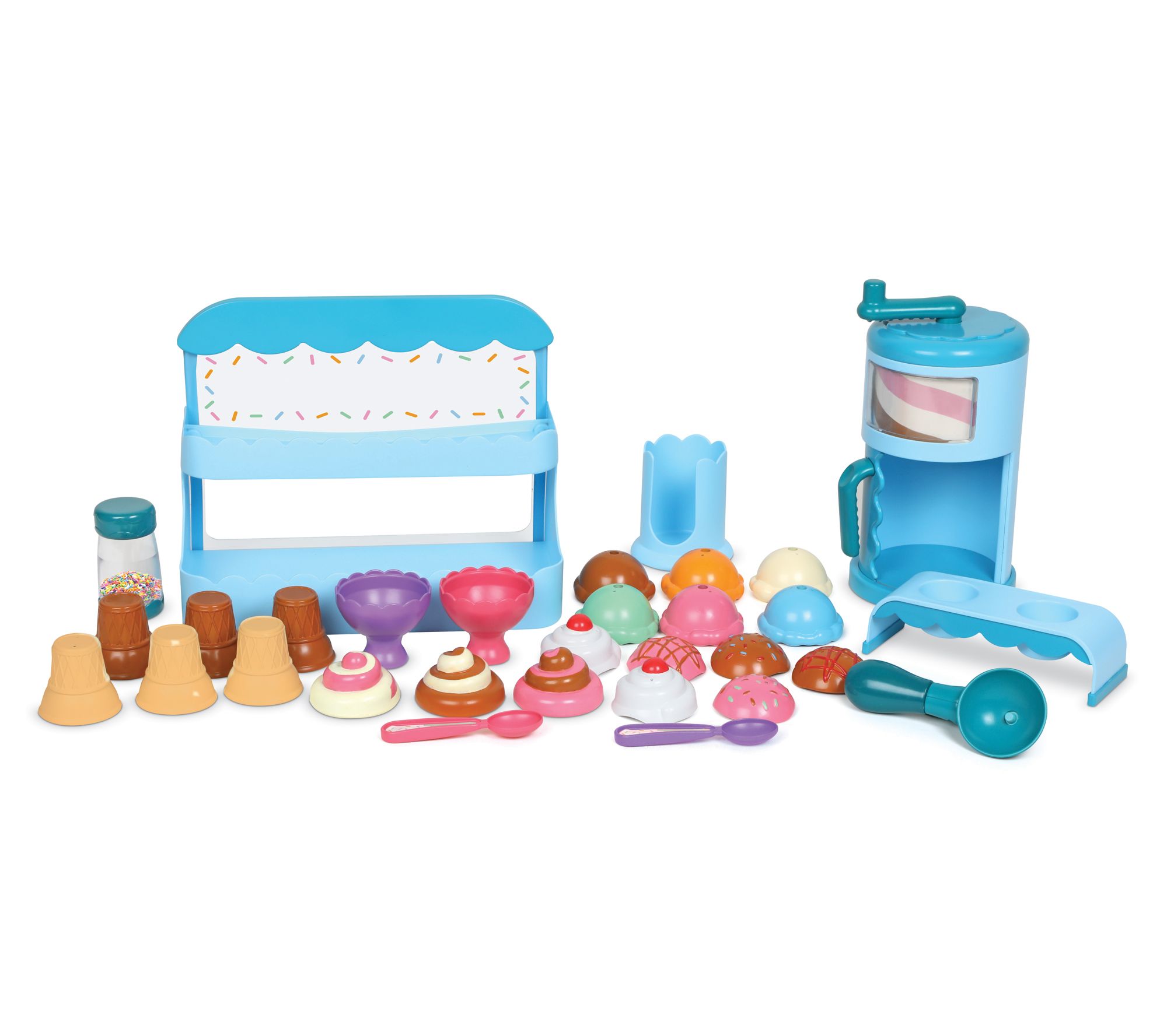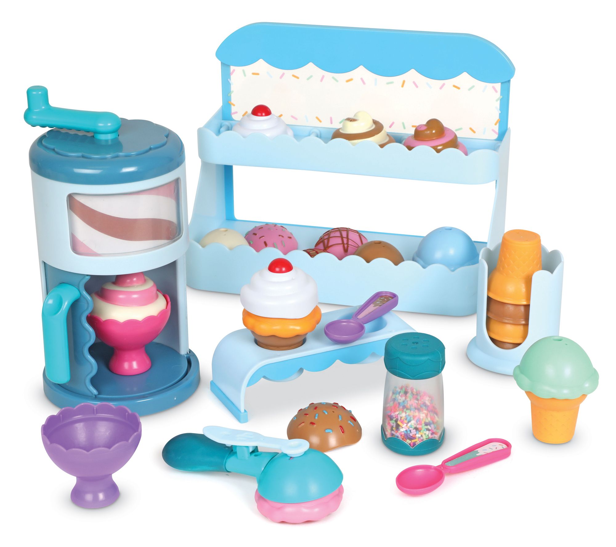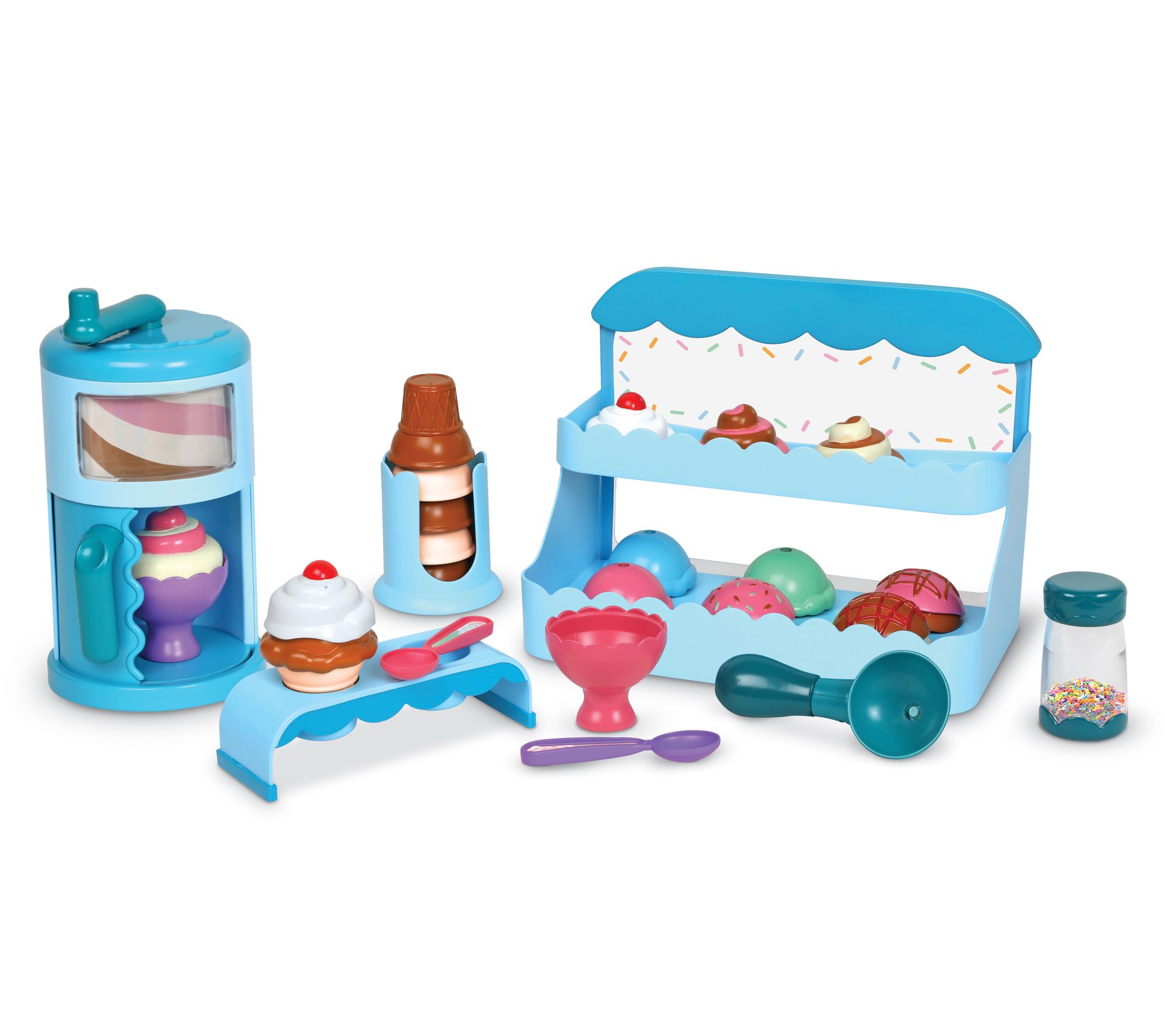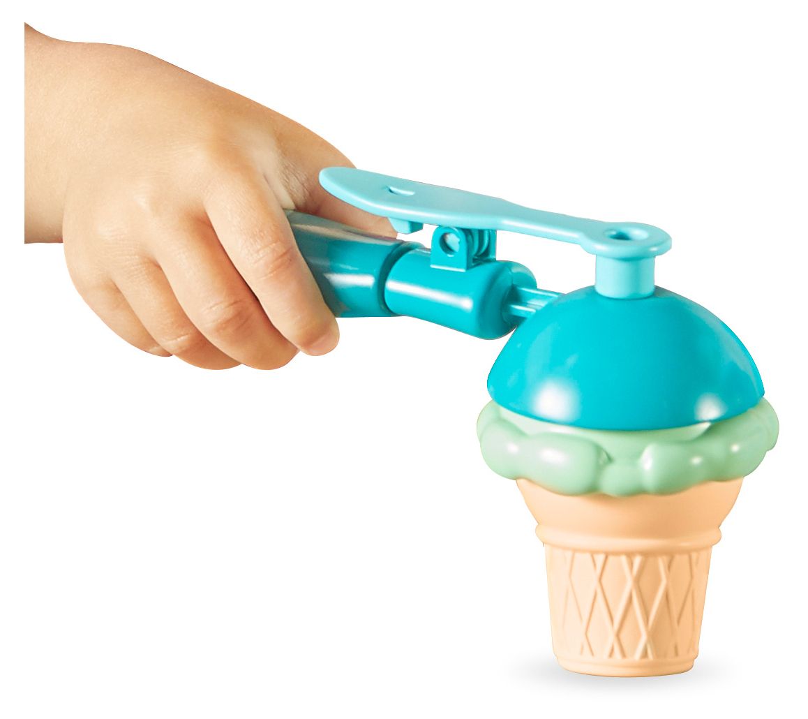 • Includes ice cream counter, six scoops ice cream, four sprinkle toppers, two whipped cream toppers, soft serve machine, three soft serve swirls, two bowls, two spoons, six cones, cone dispenser, cone serving stand, working scoop, sprinkle shaker