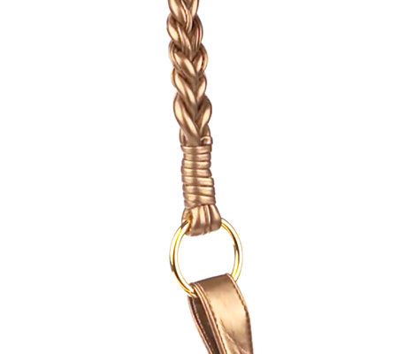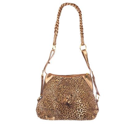 • Allover leopard print; adjustable, bronze-colored, rope double straps; goldtone hardware