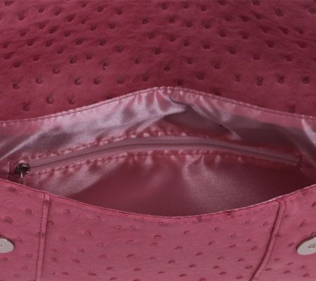• East/west envelope design; ostrich-textured print; front flap magnetic closure; detachable shoulder strap